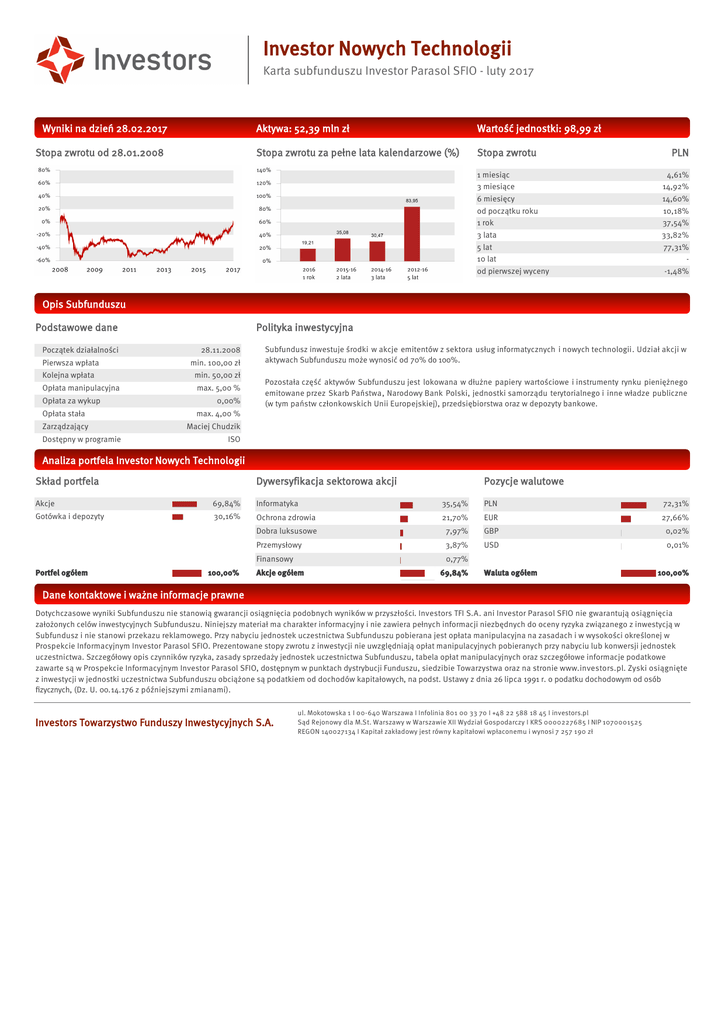 Investor Nowych Technologii Karta subfunduszu Investor Parasol SFIO - luty 2017 Wyniki na dzień 28.02.2017 Stopa zwrotu od 28.01.2008 Aktywa: 52,39 mln zł Wartość jednostki: 98,99 zł Stopa zwrotu za pełne lata kalendarzowe (%) Stopa zwrotu 1 miesiąc 3 miesiące 6 miesięcy od początku roku 1 rok 3 lata 5 lat 10 lat od pierwszej wyceny PLN 4,61% 14,92% 14,60% 10,18% 37,54% 33,82% 77,31% -1,48% Opis Subfunduszu Podstawowe dane Początek działalności Polityka inwestycyjna 28.11.2008 Pierwsza wpłata min. 100,00 zł Kolejna wpłata min. 50,00 zł Opłata manipulacyjna max. 5,00 % Opłata za wykup Opłata stała Zarządzający Dostępny w programie 0,00% max. 4,00 % Subfundusz inwestuje środki w akcje emitentów z sektora usług informatycznych i nowych technologii. Udział akcji w aktywach Subfunduszu może wynosić od 70% do 100%. Pozostała część aktywów Subfunduszu jest lokowana w dłużne papiery wartościowe i instrumenty rynku pieniężnego emitowane przez Skarb Państwa, Narodowy Bank Polski, jednostki samorządu terytorialnego i inne władze publiczne (w tym państw członkowskich Unii Europejskiej), przedsiębiorstwa oraz w depozyty bankowe. Maciej Chudzik ISO Analiza portfela Investor Nowych Technologii Skład portfela Dywersyfikacja sektorowa akcji Pozycje walutowe Akcje 69,84% Informatyka 35,54% PLN 72,31% Gotówka i depozyty 30,16% Ochrona zdrowia 21,70% EUR 27,66% Dobra luksusowe 7,97% GBP 0,02% Przemysłowy 3,87% USD 0,01% Finansowy 0,77% Portfel ogółem 100,00% Akcje ogółem 69,84% Waluta ogółem 100,00% Dane kontaktowe i ważne informacje prawne Dotychczasowe wyniki Subfunduszu nie stanowią gwarancji osiągnięcia podobnych wyników w przyszłości. Investors TFI S.A. ani Investor Parasol SFIO nie gwarantują osiągnięcia założonych celów inwestycyjnych Subfunduszu. Niniejszy materiał ma charakter informacyjny i nie zawiera pełnych informacji niezbędnych do oceny ryzyka związanego z inwestycją w Subfundusz i nie stanowi przekazu reklamowego. Przy nabyciu jednostek uczestnictwa Subfunduszu pobierana jest opłata manipulacyjna na zasadach i w wysokości określonej w Prospekcie Informacyjnym Investor Parasol SFIO. Prezentowane stopy zwrotu z inwestycji nie uwzględniają opłat manipulacyjnych pobieranych przy nabyciu lub konwersji jednostek uczestnictwa. Szczegółowy opis czynników ryzyka, zasady sprzedaży jednostek uczestnictwa Subfunduszu, tabela opłat manipulacyjnych oraz szczegółowe informacje podatkowe zawarte są w Prospekcie Informacyjnym Investor Parasol SFIO, dostępnym w punktach dystrybucji Funduszu, siedzibie Towarzystwa oraz na stronie www.investors.pl. Zyski osiągnięte z inwestycji w jednostki uczestnictwa Subfunduszu obciążone są podatkiem od dochodów kapitałowych, na podst. Ustawy z dnia 26 lipca 1991 r. o podatku dochodowym od osób fizycznych, (Dz. U. 00.14.176 z późniejszymi zmianami). Investors Towarzystwo Funduszy Inwestycyjnych S.A. ul. Mokotowska 1 I 00-640 Warszawa I Infolinia 801 00 33 70 I +48 22 588 18 45 I investors.pl Sąd Rejonowy dla M.St. Warszawy w Warszawie XII Wydział Gospodarczy I KRS 0000227685 I NIP 1070001525 REGON 140027134 I Kapitał zakładowy jest równy kapitałowi wpłaconemu i wynosi 7 257 190 zł