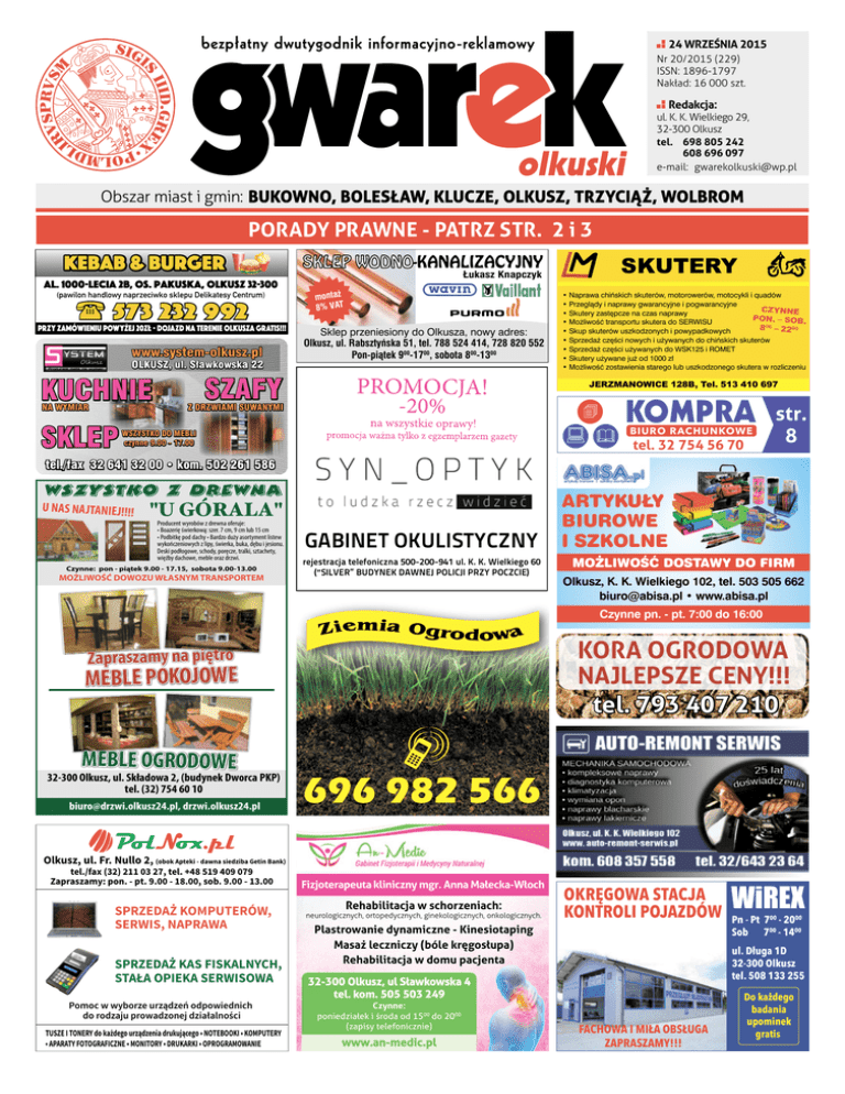 24 WRZEŚNIA 2015 Nr 20/2015 (229) ISSN: 1896-1797 Nakład: 16 000 szt. Redakcja: ul. K. K. Wielkiego 29, 32-300 Olkusz tel. 698 805 242 608 696 097 e-mail: [email protected] Obszar miast i gmin: BUKOWNO, BOLESŁAW, KLUCZE, OLKUSZ, TRZYCIĄŻ, WOLBROM PORADY PRAWNE - PATRZ STR. 2 i 3 KEBAB & BURGER Al. 1000-lecia 2B, Os. Pakuska, Olkusz 32-300 (pawilon handlowy naprzeciwko sklepu Delikatesy Centrum) 573 232 992 PRZY ZAMÓWIENIU POWYŻEJ 20ZŁ • DOJAZD NA TERENIE OLKUSZA GRATIS!!! www.system-olkusz.pl OLKUSZ, ul. Sławkowska 22 KUCHNIE NA WYMIAR SKLEP SZAFY Z DRZWIAMI SUWANYMI WSZYSTKO DO MEBLI czynne 9.00 - 17.00 SKLEP WODNO-KANALIZACYJNY Łukasz Knapczyk montaż 8% VAT Sklep przeniesiony do Olkusza, nowy adres: Olkusz, ul. Rabsztyńska 51, tel. 788 524 414, 728 820 552 Pon-piątek 900-1700, sobota 800-1300 OPTYK SKUTERY • Naprawa chińskich skuterów, motorowerów, motocykli i quadów • Przeglądy i naprawy gwarancyjne i pogwarancyjne CZYNNE • Skutery zastępcze na czas naprawy PON. – SOB. • Możliwość transportu skutera do SERWISU 800 – 2200 • Skup skuterów uszkodzonych i powypadkowych • Sprzedaż części nowych i używanych do chińskich skuterów • Sprzedaż części używanych do WSK125 i ROMET • Skutery używane już od 1000 zł • Możliwość zostawienia starego lub uszkodzonego skutera w rozliczeniu JERZMANOWICE 128B, Tel. 513 410 697 KOMPRA BIURO RACHUNKOWE tel. 32 754 56 70 str. 8 tel./fax 32 641 32 00 • kom. 502 261 586 WSZYSTKO Z DREWNA "U GÓRALA" U NAS NA JTANIEJ!!!! Producent wyrobów z drewna oferuje: • Boazerię świerkową: szer. 7 cm, 9 cm lub 15 cm • Podbitkę pod dachy • Bardzo duży asortyment listew wykończeniowych z lipy, świerka, buka, dębu i jesionu. Deski podłogowe, schody, poręcze, tralki, sztachety, więźby dachowe, meble oraz drzwi. Czynne: pon - piątek 9.00 - 17.15, sobota 9.00-13.00 MOŻLIWOŚĆ DOWOZU WŁASNYM TRANSPORTEM GABINET OKULISTYCZNY rejestracja telefoniczna 500-200-941 ul. K. K. Wielkiego 60 (“SILVER” BUDYNEK DAWNEJ POLICJI PRZY POCZCIE) ARTYKUŁY BIUROWE I SZKOLNE MOŻLIWOŚĆ DOSTAWY DO FIRM Olkusz, K. K. Wielkiego 102, tel. 503 505 662 [email protected] • www.abisa.pl Czynne pn. - pt. 7:00 do 16:00 KORA OGRODOWA NAJLEPSZE CENY!!! tel. 793 407 210 Zapraszamy na piętro MEBLE POKOJOWE MEBLE OGRODOWE 32-300 Olkusz, ul. Składowa 2, (budynek Dworca PKP) tel. (32) 754 60 10 [email protected], drzwi.olkusz24.pl Olkusz, ul. Fr. Nullo 2, (obok Apteki - dawna siedziba Getin Bank) tel./fax (32) 211 03 27, tel. +48 519 409 079 Zapraszamy: pon. - pt. 9.00 - 18.00, sob. 9.00 - 13.00 SPRZEDAŻ KOMPUTERÓW, SERWIS, NAPRAWA SPRZEDAŻ KAS FISKALNYCH, STAŁA OPIEKA SERWISOWA Pomoc w wyborze urządzeń odpowiednich do rodzaju prowadzonej działalności TUSZE I TONERY do każdego urządzenia drukującego • NOTEBOOKI • KOMPUTERY • APARATY FOTOGRAFICZNE • MONITORY • DRUKARKI • OPROGRAMOWANIE Fizjoterapeuta kliniczny mgr. Anna Małecka-Włoch Rehabilitacja w schorzeniach: neurologicznych, ortopedycznych, ginekologicznych, onkologicznych. OKRĘGOWA STACJA KONTROLI POJAZDÓW Plastrowanie dynamiczne - Kinesiotaping Masaż leczniczy (bóle kręgosłupa) Rehabilitacja w domu pacjenta www.an-medic.pl Pn - Pt 700 - 2000 Sob 700 - 1400 ul. Długa 1D 32-300 Olkusz tel. 508 133 255 32-300 Olkusz, ul Sławkowska 4 tel. kom. 505 503 249 Czynne: poniedziałek i środa od 1500 do 2000 (zapisy telefonicznie) WiREX FACHOWA I MIŁA OBSŁUGA ZAPRASZAMY!!! Do każdego badania upominek gratis 2 Informacje ALBA MPO Sp. z o.o. Biuro Obsługi Klienta ul. Sławkowska 12A, tel: (32) 241-00-81 czynne: pn-pt: 7:00 - 15:00 sob: 8:00 - 12:00 Harmonogram zbiórki odpadów wielkogabarytowych zabudowy wielorodzinnej z wyłączeniem zużytego sprzętu elektrycznego i elektronicznego oraz zużytych opon z terenu Miasta i Gminy Olkusz. 29.09.2015 r. Oś. Pakuska, oś. Skalska, ul. KKW, Krakowskie Przedmieście, Nullo, Bylicy, Kościuszki, Górnicza, Szkolna, Mickiewicza, Augustiańska, Szpitalna, Żuradzka, Sławkowska, Kantego, Kluczewska, 29 Listopada, Skłodowskiej, Dworska, 1000 Lecia 15 c, Witeradów 394, Troks 42, Braciejówka 62 przy stanowiskach na odpady segregowane. ul. Minkiewicza 2, email: [email protected], www: www.pup-olkusz.pl tel. 32 643-05-38, 32 641-34-02; fax 32 643-43-48; NIP 637-10-45-891 BAROMETR ZAWODÓW 2016 W dniu 11.09.2015r. w siedzibie urzędu odbył się panel ekspercki ”Barometr zawodów 2016". Barometr zawodów to krótkookresowa (jednoroczna) prognoza zapotrzebowania na zawody w powiecie olkuskim. Prognoza tworzona jest przez pracowników powiatowego urzędu pracy, w tym: pośredników pracy, doradców zawodowych, osoby odpowiedzialne za współpracę z przedsiębiorcami i za organizację szkoleń, a także pośrednika EURES (Europejskich Służb Zatrudnienia) oraz przedstawicieli instytucji szkoleniowych. Uczestnicy panelu eksperckiego klasyfikowali zawody w trzy grupy: • zawody deficytowe, w których w najbliższym roku nie powinno być trudności ze znalezieniem pracy, gdyż zapotrzebowanie pracodawców będzie w ich przypadku duże, a podaż pracowników chętnych do podjęcia zatrudnienia i mających odpowiednie kwalifikacje – niewielka, • zawody zrównoważone, w których liczba ofert pracy będzie zbliżona do liczby osób zdolnych i chętnych do podjęcia zatrudnienia w danym zawodzie (podaż i popyt zrównoważą się), • zawody nadwyżkowe, w których znalezienie pracy może być trudniejsze ze względu na małe zapotrzebowanie oraz wielu kandydatów chętnych do podjęcia pracy i spełniających wymagania pracodawców. Podczas oceny eksperci posiłkowali się danymi na temat liczby ofert pracy oraz liczby osób zarejestrowanych bezrobotnych w konkretnym zawodzie. Jednak dane te pełniły funkcję wyłącznie pomocniczą. Wiedza ekspertów pozwoliła zweryfikować, czy osoby te są zdolne i chętne do podjęcia pracy (czy posiadają odpowiednie umiejętności, kwalifikacje oraz potwierdz