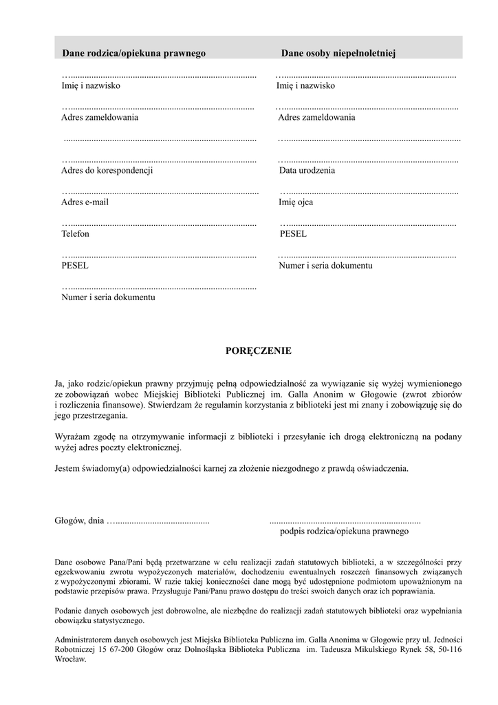Dane rodzica/opiekuna prawnego Dane osoby niepełnoletniej …................................................................................. Imię i nazwisko …........................................................................... Imię i nazwisko …................................................................................ Adres zameldowania …............................................................................ Adres zameldowania .................................................................................... …............................................................................ …................................................................................. Adres do korespondencji …........................................................................... Data urodzenia ….................................................................................. Adres e-mail ….......................................................................... Imię ojca …................................................................................. Telefon …......................................................................... PESEL …................................................................................. PESEL ….......................................................................... Numer i seria dokumentu …................................................................................. Numer i seria dokumentu PORĘCZENIE Ja, jako rodzic/opiekun prawny przyjmuję pełną odpowiedzialność za wywiązanie się wyżej wymienionego ze zobowiązań wobec Miejskiej Biblioteki Publicznej im. Galla Anonim w Głogowie (zwrot zbiorów i rozliczenia finansowe). Stwierdzam że regulamin korzystania z biblioteki jest mi znany i zobowiązuję się do jego przestrzegania. Wyrażam zgodę na otrzymywanie informacji z biblioteki i przesyłanie ich drogą elektroniczną na podany wyżej adres poczty elektronicznej. Jestem świadomy(a) odpowiedzialności karnej za złożenie niezgodnego z prawdą oświadczenia. Głogów, dnia …......................................... .................................................................. podpis rodzica/opiekuna prawnego Dane osobowe Pana/Pani będą przetwarzane w celu realizacji zadań statutowych biblioteki, a w szczególności przy egzekwowaniu zwrotu wypożyczonych materiałów, dochodzeniu ewentualnych roszczeń finansowych związanych z wypożyczonymi zbiorami. W razie takiej konieczności dane mogą być udostępnione podmiotom upoważnionym na podstawie przepisów prawa. Przysługuje Pani/Panu prawo dostępu do treści swoich danych oraz ich poprawiania. Podanie danych osobowych jest dobrowolne, ale niezbędne do realizacji zadań statutowych biblioteki oraz wypełniania obowiązku statystycznego. Administratorem danych osobowych jest Miejska Biblioteka Publiczna im. Galla Anonima w Głogowie przy ul. Jedności Robotniczej 15 67-200 Głogów oraz Dolnośląska Biblioteka Publiczna im. Tadeusza Mikulskiego Rynek 58, 50-116 Wrocław.