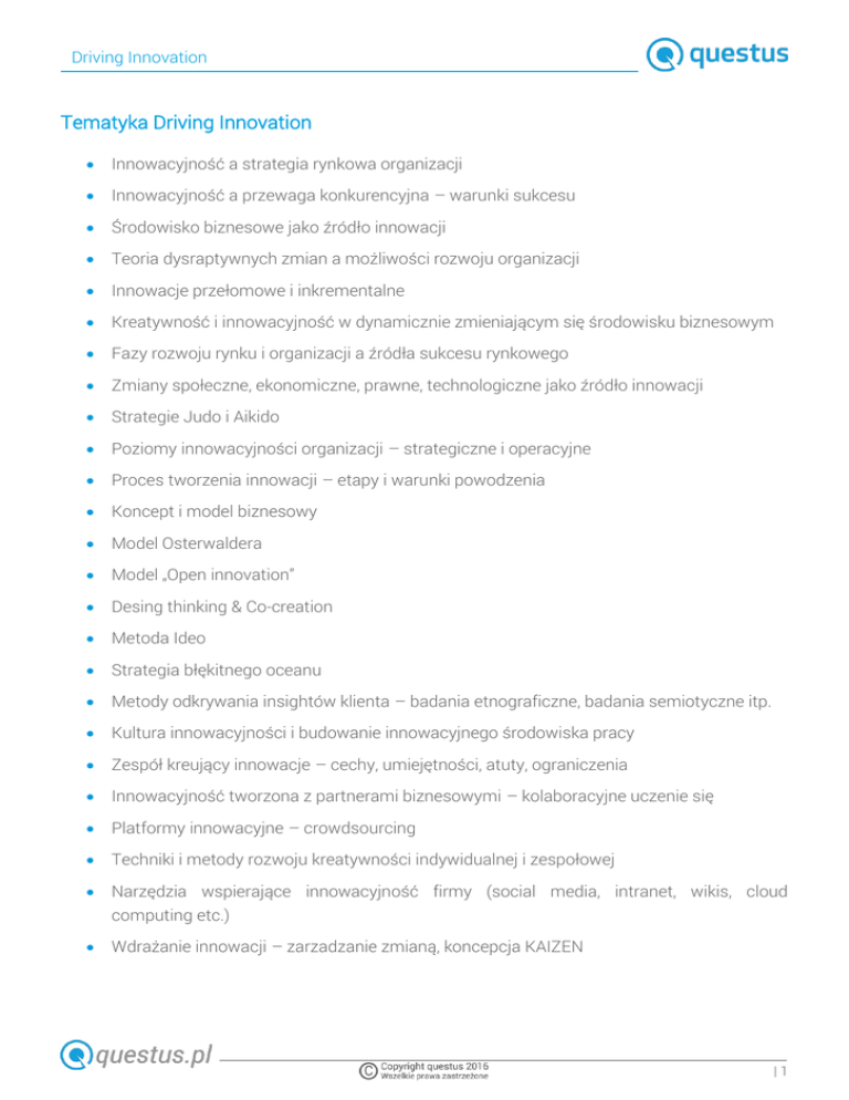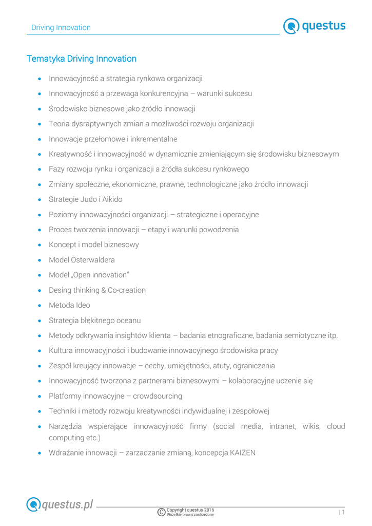 Driving Innovation Tematyka Driving Innovation Innowacyjność a strategia rynkowa organizacji Innowacyjność a przewaga konkurencyjna – warunki sukcesu Środowisko biznesowe jako źródło innowacji Teoria dysraptywnych zmian a możliwości rozwoju organizacji Innowacje przełomowe i inkrementalne Kreatywność i innowacyjność w dynamicznie zmieniającym się środowisku biznesowym Fazy rozwoju rynku i organizacji a źródła sukcesu rynkowego Zmiany społeczne, ekonomiczne, prawne, technologiczne jako źródło innowacji Strategie Judo i Aikido Poziomy innowacyjności organizacji – strategiczne i operacyjne Proces tworzenia innowacji – etapy i warunki powodzenia Koncept i model biznesowy Model Osterwaldera Model „Open innovation” Desing thinking & Co-creation Metoda Ideo Strategia błękitnego oceanu Metody odkrywania insightów klienta – badania etnograficzne, badania semiotyczne itp. Kultura innowacyjności i budowanie innowacyjnego środowiska pracy Zespół kreujący innowacje – cechy, umiejętności, atuty, ograniczenia Innowacyjność tworzona z partnerami biznesowymi – kolaboracyjne uczenie się Platformy innowacyjne – crowdsourcing Techniki i metody rozwoju kreatywności indywidualnej i zespołowej Narzędzia wspierające innowacyjność firmy (social media, intranet, wikis, cloud computing etc.) Wdrażanie innowacji – zarzadzanie zmianą, koncepcja KAIZEN |1