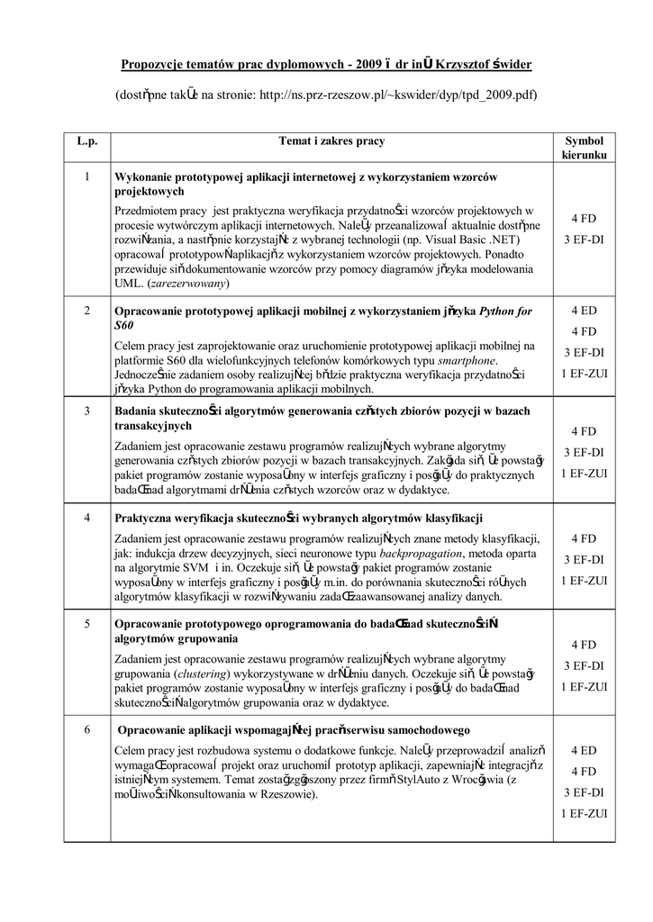 Propozycje tematów prac dyplomowych - 2009 – dr inż. Krzysztof Świder (dostępne także na stronie: http://ns.prz-rzeszow.pl/~kswider/dyp/tpd_2009.pdf) L.p. 1 Temat i zakres pracy Wykonanie prototypowej aplikacji internetowej z wykorzystaniem wzorców projektowych Przedmiotem pracy jest praktyczna weryfikacja przydatności wzorców projektowych w procesie wytwórczym aplikacji internetowych. Należy przeanalizować aktualnie dostępne rozwiązania, a następnie korzystając z wybranej technologii (np. Visual Basic .NET) opracować prototypową aplikację z wykorzystaniem wzorców projektowych. Ponadto przewiduje się dokumentowanie wzorców przy pomocy diagramów języka modelowania UML. (zarezerwowany) 2 Opracowanie prototypowej aplikacji mobilnej z wykorzystaniem języka Python for S60 Celem pracy jest zaprojektowanie oraz uruchomienie prototypowej aplikacji mobilnej na platformie S60 dla wielofunkcyjnych telefonów komórkowych typu smartphone. Jednocześnie zadaniem osoby realizującej będzie praktyczna weryfikacja przydatności języka Python do programowania aplikacji mobilnych. 3 Badania skuteczności algorytmów generowania częstych zbiorów pozycji w bazach transakcyjnych Zadaniem jest opracowanie zestawu programów realizujących wybrane algorytmy generowania częstych zbiorów pozycji w bazach transakcyjnych. Zakłada się, że powstały pakiet programów zostanie wyposażony w interfejs graficzny i posłuży do praktycznych badań nad algorytmami drążenia częstych wzorców oraz w dydaktyce. 4 Opracowanie prototypowego oprogramowania do badań nad skutecznością algorytmów grupowania Zadaniem jest opracowanie zestawu programów realizujących wybrane algorytmy grupowania (clustering) wykorzystywane w drążeniu danych. Oczekuje się, że powstały pakiet programów zostanie wyposażony w interfejs graficzny i posłuży do badań nad skutecznością algorytmów grupowania oraz w dydaktyce. 6 4 FD 3 EF-DI 4 ED 4 FD 3 EF-DI 1 EF-ZUI 4 FD 3 EF-DI 1 EF-ZUI Praktyczna weryfikacja skuteczności wybranych algorytmów klasyfikacji Zadaniem jest opracowanie zestawu programów realizujących znane metody klasyfikacji, jak: indukcja drzew decyzyjnych, sieci neuronowe typu backpropagation, metoda oparta na algorytmie SVM i in. Oczekuje się, że powstały pakiet programów zostanie wyposażony w interfejs graficzny i posłuży m.in. do porównania skuteczności różnych algorytmów klasyfikacji w rozwiązywaniu zadań zaawansowanej analizy danych. 5 Symbol kierunku 4 FD 3 EF-DI 1 EF-ZUI 4 FD 3 EF-DI 1 EF-ZUI Opracowanie aplikacji wspomagającej pracę serwisu samochodowego Celem pracy jest rozbudowa systemu o dodatkowe funkcje. Należy przeprowadzić analizę wymagań, opracować projekt oraz uruchomić prototyp aplikacji, zapewniając integrację z istniejącym systemem. Temat został zgłoszony przez firmę StylAuto z Wrocławia (z możliwością konsultowania w Rzeszowie). 4 ED 4 FD 3 EF-DI 1 EF-ZUI 7 Opracowanie aplikacji graficznej wspomagającej badania struktur biologicznych Zadaniem jest opracowanie pakietu modułów programowych z przeznaczeniem do wspomagania analizy struktur biologicznych udostępnianych w bazach KEGG. Oczekuje się, że aplikacja zostanie wyposażona w interfejs graficzny i posłuży m.in. do pobierania struktur z baz, przygotowania danych do analizy oraz wizualizacji struktur. (zarezerwowany) 8 Opracowanie przykładów prezentujących możliwości zastosowania języka Python w bioinformatyce Zadaniem jest opracowanie zestawu programów demonstrujących wykorzystanie języka programowania Python w bioinformatyce. Oczekuje się, że powstały pakiet programów zostanie wyposażony w interfejs graficzny i posłuży do badań w zakresie analizy danych biologicznych oraz w dydaktyce. 9 3 EF-DI 4 FD 3 EF-DI Praktyczna weryfikacja przydatności języka Perl w bioinformatyce Zadaniem jest opracowanie zestawu programów demonstrujących wykorzystanie języka programowania Perl w zastosowaniach bioinformatycznych. Oczekuje się, że powstały pakiet programów zostanie wyposażony w interfejs graficzny i posłuży do badań nad skutecznością algorytmów grupowania oraz w dydaktyce. 10 4 FD Opracowanie aplikacji internetowej wspomagającej początkujących inwestorów giełdowych Celem pracy jest wykonanie projektu oraz uruchomienie prototypowej aplikacji pozwalającej początkującym inwestorom giełdowym na bezpieczne wypróbowanie własnych strategii inwestowania w warunkach rzeczywistych danych giełdowych pobieranych on-line z odpowiedniego portalu internetowego. Oczekuje się, że powstała pakiet programów zostanie wyposażony w przyjazny dla użytkownika interfejs graficzny. (zarezerwowany). 4 FD 3 EF-DI 4 FD 3 EF-DI