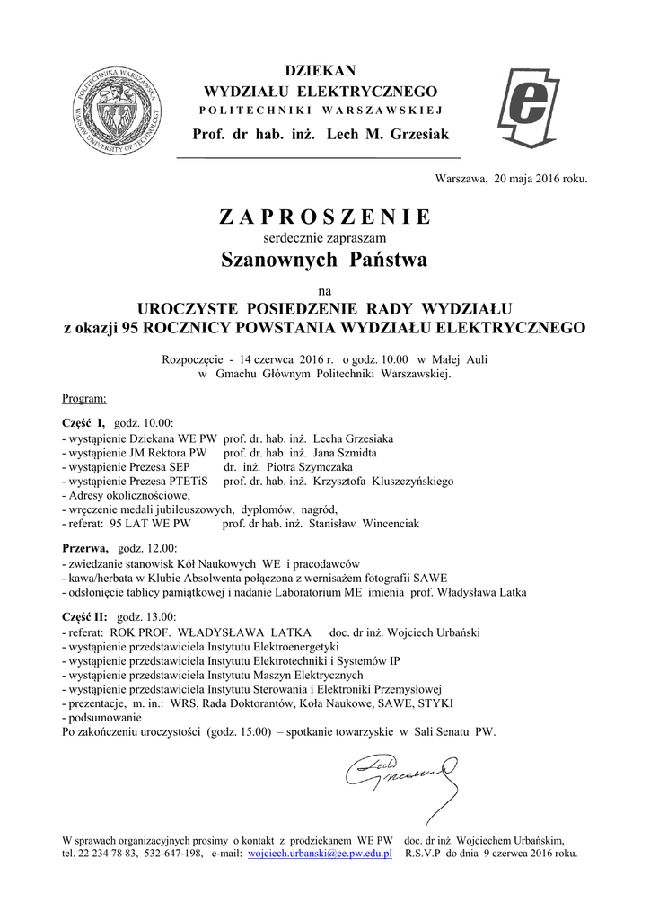 DZIEKAN WYDZIAŁU ELEKTRYCZNEGO POLITECHNIKI WARSZAWSKIEJ Prof. dr hab. inż. Lech M. Grzesiak Warszawa, 20 maja 2016 roku. ZAPROSZENIE serdecznie zapraszam Szanownych Państwa na UROCZYSTE POSIEDZENIE RADY WYDZIAŁU z okazji 95 ROCZNICY POWSTANIA WYDZIAŁU ELEKTRYCZNEGO Rozpoczęcie - 14 czerwca 2016 r. o godz. 10.00 w Małej Auli w Gmachu Głównym Politechniki Warszawskiej. Program: Część I, godz. 10.00: - wystąpienie Dziekana WE PW prof. dr. hab. inż. Lecha Grzesiaka - wystąpienie JM Rektora PW prof. dr. hab. inż. Jana Szmidta - wystąpienie Prezesa SEP dr. inż. Piotra Szymczaka - wystąpienie Prezesa PTETiS prof. dr. hab. inż. Krzysztofa Kluszczyńskiego - Adresy okolicznościowe, - wręczenie medali jubileuszowych, dyplomów, nagród, - referat: 95 LAT WE PW prof. dr hab. inż. Stanisław Wincenciak Przerwa, godz. 12.00: - zwiedzanie stanowisk Kół Naukowych WE i pracodawców - kawa/herbata w Klubie Absolwenta połączona z wernisażem fotografii SAWE - odsłonięcie tablicy pamiątkowej i nadanie Laboratorium ME imienia prof. Władysława Latka Część II: godz. 13.00: - referat: ROK PROF. WŁADYSŁAWA LATKA doc. dr inż. Wojciech Urbański - wystąpienie przedstawiciela Instytutu Elektroenergetyki - wystąpienie przedstawiciela Instytutu Elektrotechniki i Systemów IP - wystąpienie przedstawiciela Instytutu Maszyn Elektrycznych - wystąpienie przedstawiciela Instytutu Sterowania i Elektroniki Przemysłowej - prezentacje, m. in.: WRS, Rada Doktorantów, Koła Naukowe, SAWE, STYKI - podsumowanie Po zakończeniu uroczystości (godz. 15.00) – spotkanie towarzyskie w Sali Senatu PW. W sprawach organizacyjnych prosimy o kontakt z prodziekanem WE PW tel. 22 234 78 83, 532-647-198, e-mail: [email protected] doc. dr inż. Wojciechem Urbańskim, R.S.V.P do dnia 9 czerwca 2016 roku.