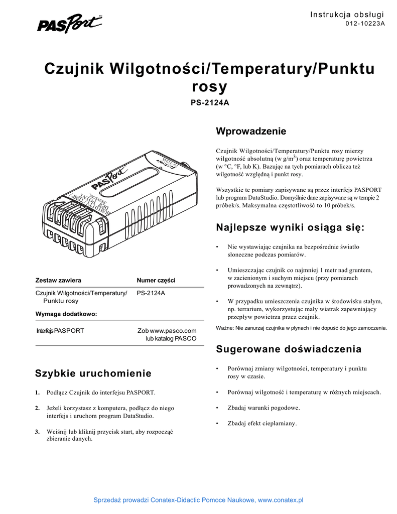 I n st ru kcja o b słu gi 0 1 2 -1 0 2 2 3 A Czujnik Wilgotności/Temperatury/Punktu rosy PS-2124A Wprowadzenie Czujnik Wilgotności/Temperatury/Punktu rosy mierzy wilgotność absolutną (w g/m3) oraz temperaturę powietrza (w °C, °F, lub K). Bazując na tych pomiarach oblicza też wilgotność względną i punkt rosy. Wszystkie te pomiary zapisywane są przez interfejs PASPORT lub program DataStudio. Domyślnie dane zapisywane są w tempie 2 próbek/s. Maksymalna częstotliwość to 10 próbek/s. Najlepsze wyniki osiąga się: Zestaw zawiera Numer części Czujnik Wilgotności/Temperatury/ Punktu rosy PS-2124A • Nie wystawiając czujnika na bezpośrednie światło słoneczne podczas pomiarów. • Umieszczając czujnik co najmniej 1 metr nad gruntem, w zacienionym i suchym miejscu (przy pomiarach prowadzonych na zewnątrz). • W przypadku umieszczenia czujnika w środowisku stałym, np. terrarium, wykorzystując mały wiatrak zapewniający przepływ powietrza przez czujnik. Wymaga dodatkowo: Interfejs PASPORT Zob www.pasco.com lub katalog PASCO Ważne: Nie zanurzaj czujnika w płynach i nie dopuść do jego zamoczenia. Sugerowane doświadczenia Szybkie uruchomienie • Porównaj zmiany wilgotności, temperatury i punktu rosy w czasie. 1. Podłącz Czujnik do interfejsu PASPORT. • Porównaj wilgotność i temperaturę w różnych miejscach. 2. Jeżeli korzystasz z komputera, podłącz do niego interfejs i uruchom program DataStudio. • Zbadaj warunki pogodowe. • Zbadaj efekt cieplarniany. 3. Wciśnij lub kliknij przycisk start, aby rozpocząć zbieranie danych. Sprzedaż prowadzi Conatex-Didactic Pomoce Naukowe, www.conatex.pl Czujnik Wilgotności/Temperatury/Punktu rosy Przykładowe dane: Wilgotność w samochodzie P S - 21 2 4 A Wsparcie techniczne Pomoc w sprawie dowolnego produktu PASCO: Specyfikacja Wilgotność1 Zakres 0% do 100% (WW), 0 g/m3 to 50 g/m3 (WA) Dokładność2 ±2% (WW), 10% of reading (WA) Rozdzielczość 1% lub lepsza (WW), 0,1 g/m 3 lub lepsza (WA) Powtarzalność 0,5% lub lepsza (WW), 0,1 g/m3 lub lepsza (WA) Adres: PASCO scientific 10101 Foothills Blvd. Roseville, CA 95747-7100 Tel.: 916-786-3800 (świat) 800-772-8700 (USA) Fax: (916) 786-7565 Internet: www.pasco.com Email: [email protected] Ograniczona gwarancja Warunki gwarancji znajdują się w katalogu PASCO. Prawa autorskie Instrukcja obsługi Czujnika Wilgotności/Temperatury/Punktu rosy PASCO scientific 012-objęta jest zastrzeżonymi prawami autorskimi. Instytucje non-profit oraz edukacyjne mają prawo do kopiowania dowolnych fragmentów tej instrukcji wyłącznie do celów laboratoryjnych i edukacyjnych. Sprzedaż kopii zabroniona. Kopiowanie instrukcji do innych celów bez zgody PASCO scientific zabronione. Znaki handlowe PASCO, PASCO scientific, DataStudio, oraz PASPORT są zarejestrowanymi znakami handlowymi będącymi własnością PASCO scientific w Stanach Zjednoczonych i/lub innych krajach. Więcej informacji znaleźć można na www.pasco.com/legal. Temperatura Zakres -20° C do 55° C Dokładność2 ±0,5° C Rozdzielczość 0,1° C lub lepsza Powtarzalność 0,1° C lub lepsza Punkt rosy Zakres -50° C do 55° C Dokładność2 ±2° C Rozdzielczość 0,1° C lub lepsza Powtarzalność 0,1° C lub lepsza 1 WW = wilgotność względna; WA= wilgotność absolutna 2Dokładność określona dla typowej temperatury i wilgotności Sprzedaż prowadzi Conatex-Didactic Pomoce Naukowe, www.conatex.pl