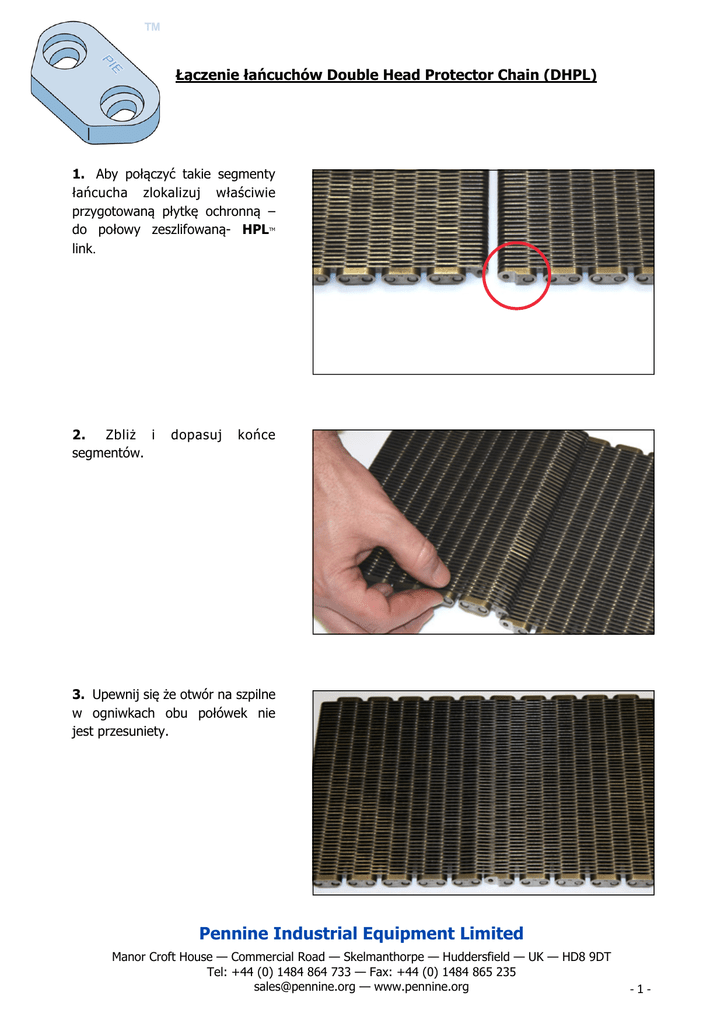 Łączenie łańcuchów Double Head Protector Chain (DHPL) 1. Aby połączyć takie segmenty łańcucha zlokalizuj właściwie przygotowaną płytkę ochronną – do połowy zeszlifowaną- HPL link. TM 2. Zbliż i segmentów. dopasuj końce 3. Upewnij się że otwór na szpilne w ogniwkach obu połówek nie jest przesuniety. Pennine Industrial Equipment Limited Manor Croft House — Commercial Road — Skelmanthorpe — Huddersfield — UK — HD8 9DT Tel: +44 (0) 1484 864 733 — Fax: +44 (0) 1484 865 235 [email protected] — www.pennine.org ‐ 1 ‐ Łączenie łańcuchów Double Head Protector Chain (DHPL) 4. Gdy są one współosiowe, połącz oba końce łańcucha szpilką z rozhartowanym końcem w stronę wyszlifowanej płytki ochronnej. 5. Upewnij sie, że splaszczona końcówka szpilki jest schowana w płytce ochronnej HPL link. TM 6. Jeśli tak jest, miekki koniec szpilki powinien wystawać ze specjalnie przygotowanej połówki HPL link TM Pennine Industrial Equipment Limited Manor Croft House — Commercial Road — Skelmanthorpe — Huddersfield — UK — HD8 9DT Tel: +44 (0) 1484 864 733 — Fax: +44 (0) 1484 865 235 [email protected] — www.pennine.org ‐ 2 ‐ Łączenie łańcuchów Double Head Protector Chain (DHPL) 7. Z główką szpilki podparta od strony rozklepanej, używając mały młotek z półokrągła główką wykonaj dobrze rozklepaną główkę szpilki na przygotowanym HPL link. Powinna byc ona wystarczajaco duża aby zapobiec wzsunieciu sie szpilki z łańcucha. TM 8. Tak główka. wygląda rozklepana 9. Aby pomóc laczyć segment łańcuchów prosze rozważyć użycie przyrządu do łączenia firmy Pennine: ‘Pennine Chain Connecting Block’ . Prosze kontaktować nasz dział sprzedaży. Pennine Industrial Equipment Limited Manor Croft House — Commercial Road — Skelmanthorpe — Huddersfield — UK — HD8 9DT Tel: +44 (0) 1484 864 733 — Fax: +44 (0) 1484 865 235 [email protected] — www.pennine.org ‐ 3 ‐ Rozłączanie łańcucha Double Head Protector Chain (DHPL) Ważna uwaga:: W każdym łańcuchu dowlniej długości powinno znajdować sie do 4 specialnie przygotowanych płytek HPL links; łańcuch musi byc rozłaczany w jednym TM z tych miejsc. Nigdy nie usuwaj z łańcucha przygotowanych płytek HPL link; zawsze odcinaj TM zbędne ogniwa na drugim końcu segmentu!! 1. Aby rozłaczyć łańcuch odnajdź któryś z przygotowanych płytek HPL links. 2. Zeszlifuj główke szpilki starając się nie uszkodzić przygotowanej płytki ochronnej pod nią. 3. Gdy główka jest usunieta, użyj nowej szpilki do wybicia starej z łańcucha. Łań‐ cuch powinien byc trzymany jak najbardziej płasko podczas tej operacji. 4. Dokładnie wylicz ile ogniw ma byc usunietych i ustal, która druga szpilka powinna być usunieta. Przetnij łańcych jak opisano powyżej wybierając płytkę tak, aby umożliwić ponowne płączenie ze specjalnie przygotowana płytką HPL link. 5. Aby ponownie połaczyć łańcuch wykonaj procedurę jak opisana powyżej (strona 1). 6. W przypadku konieczności rozłączenia łańcucha poza miejscem przygotowanym, wraz z łańcuchem dostarczane są specjalne płytki ochronne luzem, które założyć mozna w dowolnym miejscu. Zastosuj te samą procedure jak opsana powyżej i upewnij sie że obie nowe główki szpilek NIE wychodza poza płaszczyne boczną łańcucha.. Pennine Industrial Equipment Limited Manor Croft House — Commercial Road — Skelmanthorpe — Huddersfield — UK — HD8 9DT Tel: +44 (0) 1484 864 733 — Fax: +44 (0) 1484 865 235 [email protected] — www.pennine.org ‐ 4 ‐