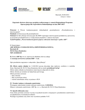 Barcinek, 04.08.2014 (miejsce i data) Zapytanie ofertowe dotyczące projektu realizowanego w ramach Regionalnego Programu Operacyjnego dla województwa Dolnośląskiego na lata 2007-2013 Priorytet 1 Wzrost konkurencyjności dolnośląskich przedsiębiorstw „Przedsiębiorstwa i innowacyjność” Działanie 1.1 Inwestycje dla przedsiębiorstw Schemat 1.1 A2 „Dotacje inwestycyjne dla MŚP wspierające innowacyjność produktową i procesową na poziomie przedsiębiorstwa (z wyłączeniem projektów z zakresu turystyki). Tytuł Projektu: „Wzrost konkurencyjności poprzez wdrożenie innowacji w spółce ARF” I. Zamawiający: ARF SPÓŁKA Z OGRANICZONĄ ODPOWIEDZIALNOŚCIĄ Barcinek 60 58-512 Stara Kamienica NIP: 6110202110 II. Firma ARF Sp. z o. o. zaprasza do składania ofert na zakup: 1. Licencja serwerowa systemu ERP – 1 szt. Opis przedmiotu zapytania w załączniku „Specyfikacja”. III. Oferty należy składać do 11.08.2014 pocztą (decyduje data wpływu), osobiście w siedzibie firmy: Barcinek 60, 58-512 Stara Kamienica lub na maila: [email protected] Oferty należy składać na formularzu stanowiącym załącznik do oferty. Oferty złożone po terminie nie będą brane pod uwagę. Oferta powinna zawierać: dane oferenta datę wystawienia oferty wartość netto/brutto oferty wyrażona w PLN IV. Termin i miejsce wykonania zamówienia: Wymagany maksymalny termin realizacji zamówienia: 11.08.2014r. Miejsce wykonania zamówienia: ARF Sp. z o. o., Barcinek 60, 58-512 Stara Kamienica VI. Sposób obliczania ceny: Cena oferty powinna zawierać wycenę wszystkich kosztów związanych z przedmiotem zamówienia z uwzględnieniem ewentualnych rabatów. Wymaga się podania ceny netto oraz wysokości podatku VAT. VII. Kryterium oceny ofert stanowi: cena 100% VIII. Wybór oferenta Beneficjent projektu wskaże oferenta, który przedłożył ofertę najkorzystniejszą z punktu widzenia kryterium przyjętego w niniejszym zapytaniu. Postępowanie zostanie uznane za ważne wówczas, gdy w odpowiedzi, gdy na zapytanie ofertowe wystosowane przez Beneficjenta projektu wpłynie co najmniej 1 ważna oferta. IX. Pozostałe Beneficjent projektu zastrzega sobie prawo do odstąpienia od zamówienia wskazania oferenta bez podania przyczyny. Osoba do kontaktu: Bartosz Oblicki, tel. 785837788 Załączniki do zapytania: 1. Specyfikacja (1 strona) 2. Formularz ofertowy ( 1 strona) Specyfikacja: 1. Licencja serwerowa systemu ERP – 1 szt. Minimalne parametry systemu ERP: System do komunikacji i zarządzania wymianą informacji i danych. Dane obustronnie przekazywane między ARF Sp. z o.o. a klientami z wykorzystaniem webserwisów. System oparty na architekturze oprogramowania klient – serwer. Logowanie do aplikacji realizowane za pomocą loginu i hasła, komunikacja klienta z ARF Sp. z o.o. odbywać się będzie z wykorzystaniem Modułu Platforma www. Klienci po zalogowaniu się do systemu mają uzyskać dostęp do wszelkich informacji dotyczących realizowanych zamówień m.in. oferty , cenniki, zamówienia, statusy złożonych zamówień i zamówień historycznych, zlecenia w produkcji, wątków konwersacji wraz z historią uzgodnień i naniesionych w zamówieniach zmianach, dokumentach sprzedażowych oraz historii wystawionych dokumentów, ma również analizować rozrachunki pomiędzy ARF Sp. z o.o. a klientami umożliwiając sprawdzenie statusu swoich wzajemnych zobowiązań. W celu zabezpieczenia danych, zarówno wysyłanych jak i odbieranych przez system, wymaga zastosowania technologii szyfrowanego połączenia SSL (Secure Socket Layer). System powinien zostać oparty o architekturę wielowarstwową: Model-Widok- Kontroler przy wykorzystaniu technologii takich jak: Mybatis, Guice, Guice-Mybatis, JSF/PrimeFaces. Technologia Mybatis odpowiada za "kontakt" z bazą danych, za zapytania SQL oraz mapowanie struktury. Do przechowywania i przetwarzania danych gromadzonych w systemie należy zastosować relacyjną bazę z interfejsem SQL, w architekturze klient-serwer jako gwarancją wysokiej odporności bazy danych na wszelkie awarie stanowisk sieciowych. Moduły systemu ERP: 1. Moduł Platformy www Moduł Platforma www będzie aplikacją dostępną z poziomu przeglądarki internetowej dla klientów ARF Sp. z o.o., którzy otrzymają do niej dostęp (login, hasło). Dzięki platformie klienci będą mieli dostęp do wszystkich aktualnych i archiwalnych dokumentów, które były wystawione dla danego klienta. Platforma będzie działa w architekturze trójwarstwowej w oparciu o klienta przeglądarkowego. Platforma umożliwi elektroniczny dostęp do informacji związanych z wspólnie realizowanymi zamówieniami on-line. 2. Moduł Administratora Moduł przeznaczony do administrowania systemem umożliwia przydzielenie poszczególnym użytkownikom systemu praw dostępu do modułów, opcji i funkcji. Pozwala określić kompetencje grup operatorów systemu i zakres ich pracy. 3. Moduł Zarządzania Produkcją Moduł pozwoli określić terminy realizacji zamówień realizowanych przez ARF Sp. z o.o.. Dzięki połączeniu z modułem Platformy www stworzona zostanie funkcjonalność e-Produkcja umożliwiająca klientom zlecanie na produkcję do ARF Sp. z o.o.. Moduł umożliwi dokonywanie wycen, prognozowanie terminów wykonania zamówienia klienta oraz podglądu statusu zleceń produkcyjnych w czasie rzeczywistym (dzięki integracji poprzez moduł obsługi paneli meldunkowych produkcji z urządzeniami). Moduł umożliwi klientom wizualizację statusów poszczególnych zamówień produkcyjnych; zlecenia w przygotowaniu, w toku, zakończone. Moduł umożliwi automatyczne przypisanie zamówienia do klienta. 4. Moduł obsługi paneli meldunkowych (e-produkcja bez papieru) Moduł umożliwi automatyczną rejestrację w systemie ERP zdarzeń w czasie rzeczywistym, reagując na zdarzenia zachodzące w procesie produkcyjnym i monitorując ich realizację. Podstawową funkcjonalnością modułu jest integracja systemu z u