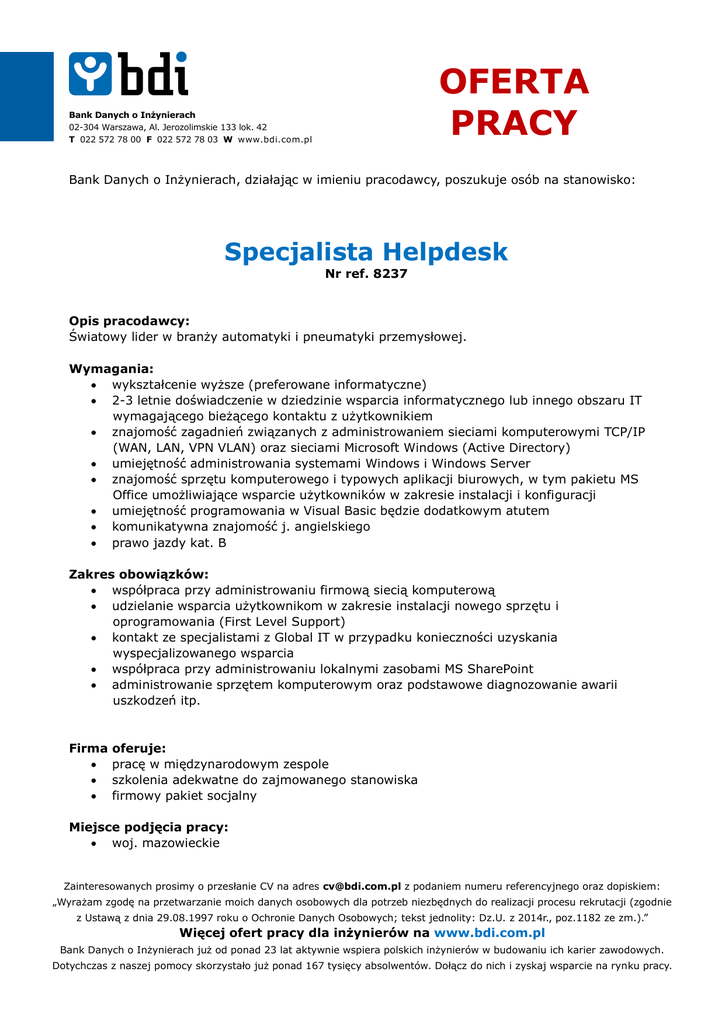 OFERTA PRACY Bank Danych o Inżynierach 02-304 Warszawa, Al. Jerozolimskie 133 lok. 42 T 022 572 78 00 F 022 572 78 03 W www.bdi.com.pl Bank Danych o Inżynierach, działając w imieniu pracodawcy, poszukuje osób na stanowisko: Specjalista Helpdesk Nr ref. 8237 Opis pracodawcy: Światowy lider w branży automatyki i pneumatyki przemysłowej. Wymagania: wykształcenie wyższe (preferowane informatyczne) 2-3 letnie doświadczenie w dziedzinie wsparcia informatycznego lub innego obszaru IT wymagającego bieżącego kontaktu z użytkownikiem znajomość zagadnień związanych z administrowaniem sieciami komputerowymi TCP/IP (WAN, LAN, VPN VLAN) oraz sieciami Microsoft Windows (Active Directory) umiejętność administrowania systemami Windows i Windows Server znajomość sprzętu komputerowego i typowych aplikacji biurowych, w tym pakietu MS Office umożliwiające wsparcie użytkowników w zakresie instalacji i konfiguracji umiejętność programowania w Visual Basic będzie dodatkowym atutem komunikatywna znajomość j. angielskiego prawo jazdy kat. B Zakres obowiązków: współpraca przy administrowaniu firmową siecią komputerową udzielanie wsparcia użytkownikom w zakresie instalacji nowego sprzętu i oprogramowania (First Level Support) kontakt ze specjalistami z Global IT w przypadku konieczności uzyskania wyspecjalizowanego wsparcia współpraca przy administrowaniu lokalnymi zasobami MS SharePoint administrowanie sprzętem komputerowym oraz podstawowe diagnozowanie awarii uszkodzeń itp. Firma oferuje: pracę w międzynarodowym zespole szkolenia adekwatne do zajmowanego stanowiska firmowy pakiet socjalny Miejsce podjęcia pracy: woj. mazowieckie Zainteresowanych prosimy o przesłanie CV na adres [email protected] z podaniem numeru referencyjnego oraz dopiskiem: „Wyrażam zgodę na przetwarzanie moich danych osobowych dla potrzeb niezbędnych do realizacji procesu rekrutacji (zgodnie z Ustawą z dnia 29.08.1997 roku o Ochronie Danych Osobowych; tekst jednolity: Dz.U. z 2014r., poz.1182 ze zm.).” Więcej ofert pracy dla inżynierów na www.bdi.com.pl Bank Danych o Inżynierach już od ponad 23 lat aktywnie wspiera polskich inżynierów w budowaniu ich karier zawodowych. Dotychczas z naszej pomocy skorzystało już ponad 167 tysięcy absolwentów. Dołącz do nich i zyskaj wsparcie na rynku pracy.