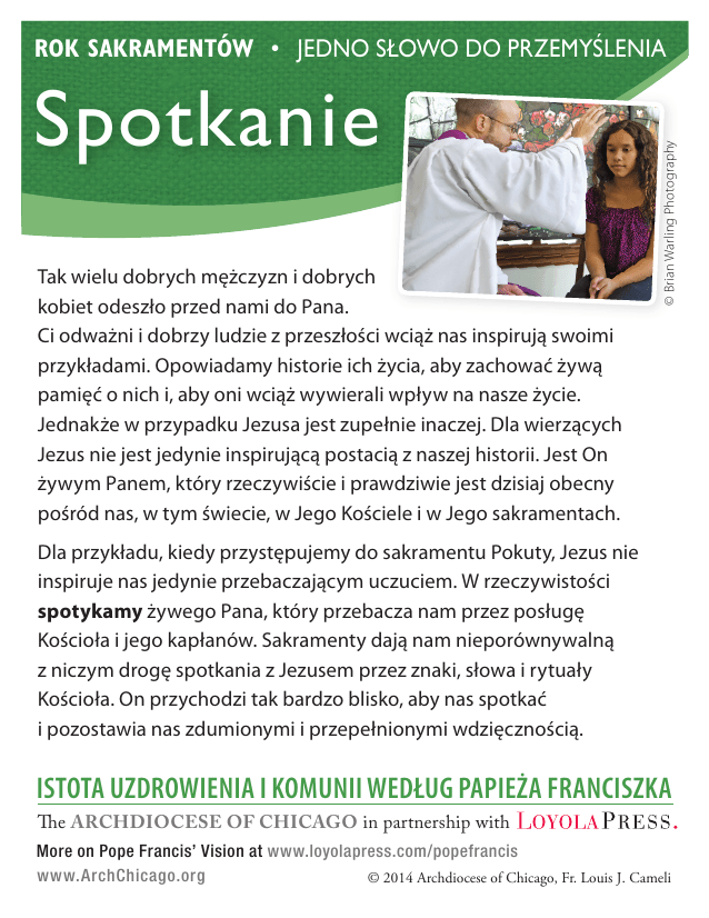 Spotkanie Tak wielu dobrych mężczyzn i dobrych kobiet odeszło przed nami do Pana. Ci odważni i dobrzy ludzie z przeszłości wciąż nas inspirują swoimi przykładami. Opowiadamy historie ich życia, aby zachować żywą pamięć o nich i, aby oni wciąż wywierali wpływ na nasze życie. Jednakże w przypadku Jezusa jest zupełnie inaczej. Dla wierzących Jezus nie jest jedynie inspirującą postacią z naszej historii. Jest On żywym Panem, który rzeczywiście i prawdziwie jest dzisiaj obecny pośród nas, w tym świecie, w Jego Kościele i w Jego sakramentach. © Brian Warling Photography ROK SAKRAMENTÓW • JEDNO SŁOWO DO PRZEMYŚLENIA Dla przykładu, kiedy przystępujemy do sakramentu Pokuty, Jezus nie inspiruje nas jedynie przebaczającym uczuciem. W rzeczywistości spotykamy żywego Pana, który przebacza nam przez posługę Kościoła i jego kapłanów. Sakramenty dają nam nieporównywalną z niczym drogę spotkania z Jezusem przez znaki, słowa i rytuały Kościoła. On przychodzi tak bardzo blisko, aby nas spotkać i pozostawia nas zdumionymi i przepełnionymi wdzięcznością. ISTOTA UZDROWIENIA I KOMUNII WEDŁUG PAPIEŻA FRANCISZKA The ARCHDIOCESE OF CHICAGO in partnership with More on Pope Francis’ Vision at www.loyolapress.com/popefrancis www.ArchChicago.org © 2014 Archdiocese of Chicago, Fr. Louis J. Cameli