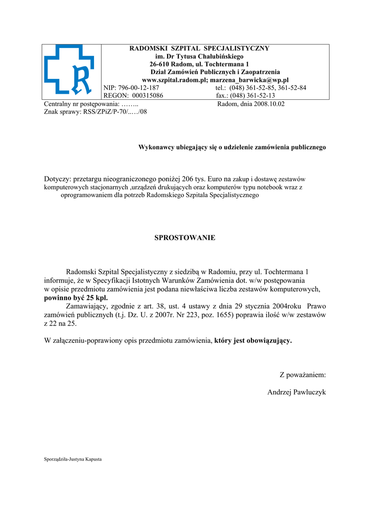RADOMSKI SZPITAL SPECJALISTYCZNY im. Dr Tytusa Chałubińskiego 26-610 Radom, ul. Tochtermana 1 Dział Zamówień Publicznych i Zaopatrzenia www.szpital.radom.pl; [email protected] NIP: 796-00-12-187 tel.: (048) 361-52-85, 361-52-84 REGON: 000315086 fax.: (048) 361-52-13 Centralny nr postępowania: …….. Radom, dnia 2008.10.02 Znak sprawy: RSS/ZPiZ/P-70/..…/08 Wykonawcy ubiegający się o udzielenie zamówienia publicznego Dotyczy: przetargu nieograniczonego poniżej 206 tys. Euro na zakup i dostawę zestawów komputerowych stacjonarnych ,urządzeń drukujących oraz komputerów typu notebook wraz z oprogramowaniem dla potrzeb Radomskiego Szpitala Specjalistycznego SPROSTOWANIE Radomski Szpital Specjalistyczny z siedzibą w Radomiu, przy ul. Tochtermana 1 informuje, że w Specyfikacji Istotnych Warunków Zamówienia dot. w/w postępowania w opisie przedmiotu zamówienia jest podana niewłaściwa liczba zestawów komputerowych, powinno być 25 kpl. Zamawiający, zgodnie z art. 38, ust. 4 ustawy z dnia 29 stycznia 2004roku Prawo zamówień publicznych (t.j. Dz. U. z 2007r. Nr 223, poz. 1655) poprawia ilość w/w zestawów z 22 na 25. W załączeniu-poprawiony opis przedmiotu zamówienia, który jest obowiązujący. Z poważaniem: Andrzej Pawluczyk Sporządziła-Justyna Kapusta OPIS PRZEDMIOTU ZAMÓWIENIA ZESTAW KOMPUTEROWY STACJONARNY Z OPROGRAMOWANIEM KPL. 25 PARAMETRY JEDNOSTKI CENTRALNEJ ZESTAWU KOMPUTEROWEGO Lp. Nazwa asortymentu Parametry min. /wymagane/ • Micro-ATX • 1 x PCI-E x 16, 1 x PCI-E x1 • 2 x PCI • 1 x ATA/133, 4 x Serial ATA II • 1 x LPT, 1 x RS232, 2 x PS/2, 4 x USB 2.0 • 1 x VGA • 1 x RJ45 10/100/1000 Mbps • zintegrowana karta dźwiękowa Dwurdzeniowy procesor z rodziny x86 taktowany zegarem min. 2,53 GHz, o częstotliwości taktowania magistrali min. 1066 MHz, pamięć cache L2 min 2MB lub procesor o równoważnej wydajności wg wyników testu przeprowadzonego przez oferenta. W przypadku użycia przez oferenta testów wydajności, zamawiający zastrzega sobie, iż w celu sprawdzenia poprawności wykonania testów oferent musi dostarczyć zamawiającemu oprogramowanie testujące oraz oba równoważne porównywane zestawy. Ponadto oferent winien dostarczyć dokładne opisy użytych testów wraz z wynikami w celu ich sprawdzenia, w terminie nie dłuższym niż 3 dni od otrzymania zawiadomienia od zamawiającego. 1 Płyta główna 2 Procesor 3 Typy obsługiwanej pamięci 4 Dwukanałowa obsługa pamięci 5 Ilość gniazd pamięci 2 6 Zainstalowana pamięć operacyjna • 2 x 1GB DDR2-800 (PC2-6400) 7 Obsługa RAID Nie wymagana 8 Karta graficzna • Dopuszczalna zintegrowana • 128MB • powinna zapewnić poprawną pracę przy ustawieniach rozdzielczości 1280 x 1024 i częstotliwości odświeżania 85Hz (monitor CRT) 9 Dysk twardy 1 x 160 GB SATAII, cache 8MB, NCQ, 7200 rpm, MTFB 600.000, S.M.A.R.T., 10 Stacja dyskietek FDD 1,44MB Napęd optyczny DVD+/-RW • Zapis płyt dwuwarstwowych (DVD+/-R9 z prędkością x8); • zapis: 16x DVD-ROM, 20x DVD+/-R, 8x DVD+RW, 8x DVD-RW, 48x CD-R, 32x CD-RW; • odczyt: 16x DVD, 48x CD • bufor 2 MB + buffer underrun protection • interfejs SATA • wersja z oprogramowaniem 11 • DDR2-800 (PC-6400) • DDR2-667 (PC2-5300) TAK 12 Karta sieciowa Zintegrowana 10/100/1000 Mbps 13 Obudowa 14 Zasilacz 15 Klawiatura, mysz • Mini Tower • możliwość mechanicznego zabezpieczenia komputera przed nieautoryzowanym otwarciem obudowy • ilość kieszeni zewnętrznych 5,25” 2 szt. • ilość kieszeni zewnętrznych 3,5” 2 szt. • ilość kieszeni wewnętrznych 3,5” 3 szt. • złącze USB i złącza Audio wyprowadzone na front obudowy min. 350W, aktywne PFC, AFC, zabezpieczenie termiczne, przeciwprzepięciowe, przeciwzwarciowe, przeciwprzeciążeniowe, głośność w granicach 21 - 23 dB, Klawiatura Logitech Deluxe 250 Keyboard white OEM, Mysz optyczna z podkładką 16 Kabel krosowy RJ45, 568B, FTP cat. 5e, linka, 3m, szary 17 System operacyjny Windows XP Prof. PL OEM (z licencją, dokumentacją i nośnikiem instalacyjnym), 18 Oprogramowanie 19 Nośniki ze wszystkimi aktualnymi sterownikami i oprogramowaniem do obsługi wszystkich urządzeń w zestawie Microsoft Office Basic 2007 PL OEM PARAMETRY MONITORA Lp. Nazwa asortymentu Parametry min. /wymagane/ 1 Typ LCD 2 Przekątna ekranu Proporcja monitora 4:3 19” 3 Kontrast 2000:1 4 Jasność 300 cd/m2 5 Plamka 0,29 6 Liczba wyświetlanych kolorów 16 mln 7 Rozdzielczość nominalna 1280x1024 8 Czas reakcji 5 ms. 9 Max. częst. odchyl. poziom. 80 kHz 10 Max. częst. odchyl. pionow. 75 Hz 11 Kąt widzenia w poziomie 160 12 Kąt widzenia w pionie 160 13 Złącza 15 stykowe złącze D-sub Cyfrowe DVI 14 Zasilacz Wbudowany Do oferty należy dołączyć aktualną specyfikację techniczną proponowanych urządzeń.