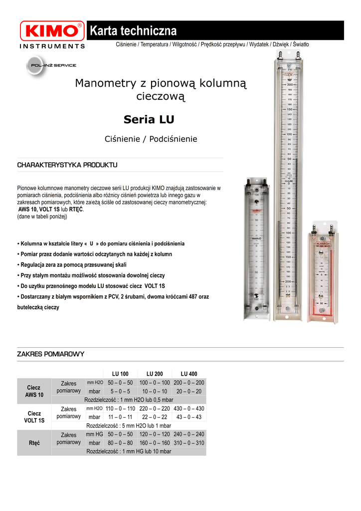 ZAKRES POMIAROWY Ciecz AWS 10 Ciecz VOLT 1S Rtęć LU 100 LU 200 LU 400 50 – 0 – 50 100 – 0 – 100 200 – 0 – 200 mbar 5–0–5 10 – 0 – 10 20 – 0 – 20 Rozdzielczość : 1 mm H2O lub 0,5 mbar mm H2O 110 – 0 – 110 220 – 0 – 220 430 – 0 – 430 Zakres pomiarowy mbar 11 – 0 – 11 22 – 0 – 22 43 – 0 – 43 Rozdzielczość : 5 mm H2O lub 1 mbar mm HG 50 – 0 – 50 120 – 0 – 120 240 – 0 – 240 Zakres pomiarowy mbar 80 – 0 – 80 160 – 0 – 160 310 – 0 – 310 Rozdzielczość : 1 mm HG lub 10 mbar Zakres pomiarowy mm H2O DANE TECHNICZNE Zalecana temperatura pracy Dopuszczalna temperatura pracy Maksymalne ciśnienie statyczne Korpus manometru Kolumna cieczowa Linijka skali Regulacja zera Ciecz manometryczna Podłączenie Montaż na ścianie EWYMIARY Od +5 do +30°C Od -30 do +60°C 6 bar Przezroczysty altuglas o grubości 15mm Rurka Ø 4 mm wytłoczona w korpusie Przezroczysty altuglas. Przekrój 40 X 2 mm Przez przesuwanie oznakowanej skali, przesunięcie 10mm. Mocowanie za pomocą mosiężnych niklowanych śrub CieczAWS 10, gęstość 0,86, ciecz VOLT 1S, gęstość 1,86 lub rtęć, gęstość 13,545 Półelastyczna, krystaliczna rurka Ø 5x8 mm wciskana na polimerowe, profilowane króćce Ø 6,2 (dla manometrów z cieczą AWS10 lub VOLT 1S) lub z tworzywa delrin (dla manometrów rtęciowych), gwint 1/8 jak w instalacjach gazowych Z lub bez białego wspornika PVC