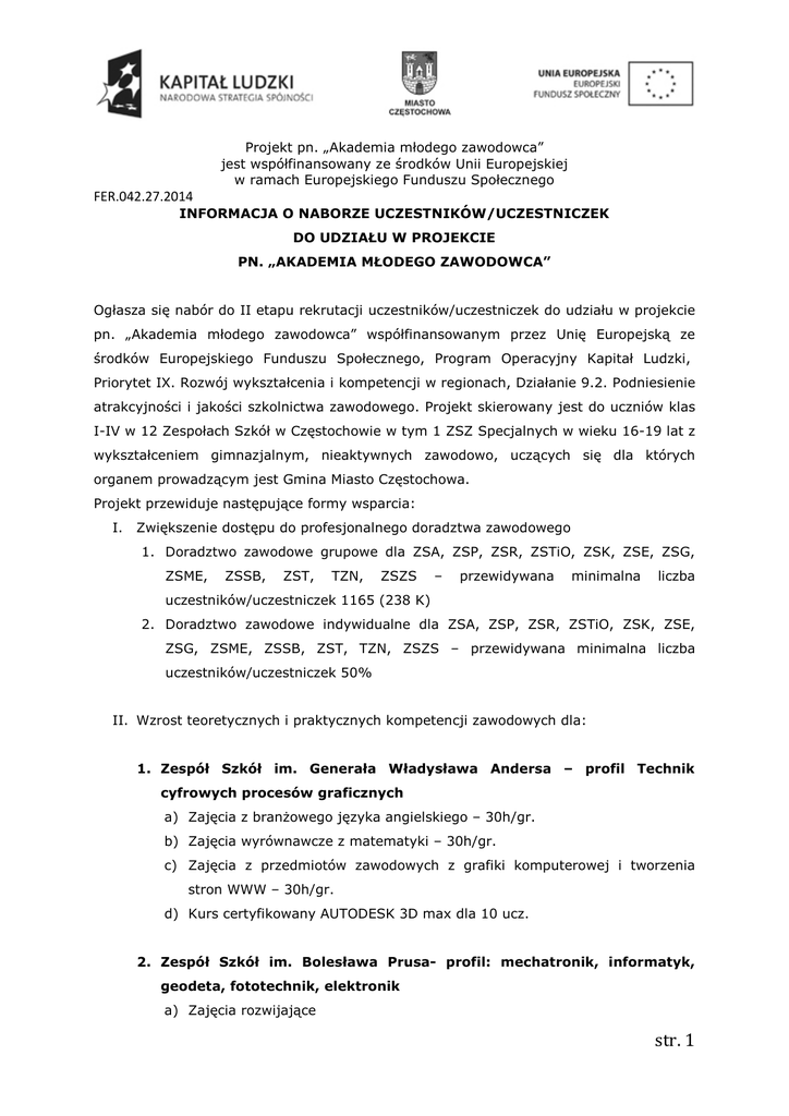 Projekt pn. „Akademia młodego zawodowca” jest współfinansowany ze środków Unii Europejskiej w ramach Europejskiego Funduszu Społecznego FER.042.27.2014 INFORMACJA O NABORZE UCZESTNIKÓW/UCZESTNICZEK DO UDZIAŁU W PROJEKCIE PN. „AKADEMIA MŁODEGO ZAWODOWCA” Ogłasza się nabór do II etapu rekrutacji uczestników/uczestniczek do udziału w projekcie pn. „Akademia młodego zawodowca” współfinansowanym przez Unię Europejską ze środków Europejskiego Funduszu Społecznego, Program Operacyjny Kapitał Ludzki, Priorytet IX. Rozwój wykształcenia i kompetencji w regionach, Działanie 9.2. Podniesienie atrakcyjności i jakości szkolnictwa zawodowego. Projekt skierowany jest do uczniów klas I-IV w 12 Zespołach Szkół w Częstochowie w tym 1 ZSZ Specjalnych w wieku 16-19 lat z wykształceniem gimnazjalnym, nieaktywnych zawodowo, uczących się dla których organem prowadzącym jest Gmina Miasto Częstochowa. Projekt przewiduje następujące formy wsparcia: I. Zwiększenie dostępu do profesjonalnego doradztwa zawodowego 1. Doradztwo zawodowe grupowe dla ZSA, ZSP, ZSR, ZSTiO, ZSK, ZSE, ZSG, ZSME, ZSSB, ZST, TZN, ZSZS – przewidywana minimalna liczba uczestników/uczestniczek 1165 (238 K) 2. Doradztwo zawodowe indywidualne dla ZSA, ZSP, ZSR, ZSTiO, ZSK, ZSE, ZSG, ZSME, ZSSB, ZST, TZN, ZSZS – przewidywana minimalna liczba uczestników/uczestniczek 50% II. Wzrost teoretycznych i praktycznych kompetencji zawodowych dla: 1. Zespół Szkół im. Generała Władysława Andersa – profil Technik cyfrowych procesów graficznych a) Zajęcia z branżowego języka angielskiego – 30h/gr. b) Zajęcia wyrównawcze z matematyki – 30h/gr. c) Zajęcia z przedmiotów zawodowych z grafiki komputerowej i tworzenia stron WWW – 30h/gr. d) Kurs certyfikowany AUTODESK 3D max dla 10 ucz. 2. Zespół Szkół im. Bolesława Prusa- profil: mechatronik, informatyk, geodeta, fototechnik, elektronik a) Zajęcia rozwijające str. 1 Projekt pn. „Akademia młodego zawodowca” jest współfinansowany ze środków Unii Europejskiej w ramach Europejskiego Funduszu Społecznego FER.042.27.2014 - informatyka – 30h/gr. − Fotografii artystycznej - 30h/gr. − Mechatroniki – 30h/gr. − Fotografii reklamowej - 30h/gr. − Warsztaty makijażu zdjęciowego i wizażu -30h/gr. − Tworzenie projektów artystycznych - 30h/gr. b) Warsztaty z zakresu estetyki fotografii + plener fotograficzny -30h/gr. c) Zajęcia z przedmiotów zawodowych − Naprawa i diagnostyka sprzętu elektronicznego i komputerowego 30h/gr. − Naprawa i konserwacja komputera i urządzeń peryferyjnych - 30h/gr. − Instalacja, konfigurowanie i programowanie elektronicznych systemów zabezpieczeń - 30h/gr. − Geodezyjna obsługa inwestycji- 30h/gr. − Techniki projektowania rysunku - 30h/gr. d) Kurs ECDL core 60h/gr.+ Egzamin dla 40 ucz. e) Wizyty studyjne dla 40 ucz.: − Huta Częstochowa − Politechnika Częstochowa − WSZ Mechatroniki Katowice f) Praktyki u przedsiębiorców ok. 112 ucz. 3. Zespół Szkół im. Władysława Stanisława Reymonta – profil Technik technologii odzieży a) Zajęcia z branżowego języka angielskiego - 30h/gr. b) Zajęcia z branżowego języka francuskiego - 30h/gr. c) Zajęcia zawodowe z Technik technologii odzieży - 30h/gr. d) Zajęcia zawodowe - modeling warsztaty technologii odzieży - 30h/gr. e) Kursy: − Obsługi programu Adobe Photoshop - 12h/gr. − szycia i technik haute couture - 15h/gr. − fotografia Mody - 20h/gr. − projektowania i konstrukcji bielizny- 25h/gr. − rysunku żurnalowego- 30h/gr. str. 2 Projekt pn. „Akademia młodego zawodowca” jest współfinansowany ze środków Unii Europejskiej w ramach Europejskiego Funduszu Społecznego FER.042.27.2014 f) Praktyki ok. 25 ucz. 4. Zespół Szkół Technicznych i Ogólnokształcących im. Stefana Żeromskiego - profil: Technik żywienia i usług gastronomicznych, Technik budownictwa, Technik usług fryzjerskich a) Zajęcia z branżowego języka angielskiego - 30h/gr. dla − Gastronomii b) Zajęcia z branżowego języka niemieckiego - 30h/gr. dla − Gastronomii − Fryzjerstwa − budownictwa c) Zajęcia rozwijające z przedsiębiorczości- 30h/gr. dla: − gastronomii − budownictwa d) Zajęcia wyrównawcze z matematyki - 30h/gr. dla: − Gastronomii − budownictwa e) Kursy f) − Z udziałem mistrza fryzjerstwa – 15h/gr. − Nowoczesne instalacje w budownictwie – 60h/gr − Konstrukcje budowlane – 60h/gr Wizyty studyjne − Uniwersytet Przyrodniczy we Wrocławiu dla gastronomii − Politechnika Częstochowska g) Praktyki 5. Zespół Szkół im. Jana Kochanowskiego – profil Technik logistyk a) Zajęcia z branżowego języka angielskiego - 30h/gr. b) Zajęcia zawodowe - 30h/gr. − Organizacja w procesach produkcji dystrybucyjnej i magazynów 30h/gr. − Przygotowanie do egzaminu zawodowego - 30h/gr. c) Kursy − Operator Koparko-ładowarki 12 os. str. 3 Projekt pn. „Akademia młodego zawodowca” jest współfinansowany ze środków Unii Europejskiej w ramach Europejskiego Funduszu Społecznego FER.042.27.2014 d) Praktyki 6. Zespół Szkół Ekonomicznych – profil: Technik ekonomista, Technik handlowiec a) Zajęcia z branżowego języka angielskiego - 30h/gr. b) Zajęcia rozwijające – Przedsiębiorczości - 30h/gr. c) Zajęcia wyrównawcze z matematyki - 30h/gr. d) Zajęcia z przedmiotów zawodowych − Rachunkowość - 30h/gr. − Finanse - 30h/gr. − Ekonomia - 30h/gr. e) Kursy f) − Kasy fiskalnej 14 os. − Socjotechnika 14 os. Praktyki 7. Zespół Szkół Gastronomicznych im. Marii Skłodowskiej – Curie – Profil: Technik żywienia i usług gastronomii, Technik technologii i żywności, kelner a) Zajęcia z branżowego języka angielskiego - 30h/gr. b) Zajęcia rozwijające z informatyki z wykorzystaniem programu WIKT 10h/gr. c) Zajęcia wyrównawcze − Matematyka 15h/gr − J. polski 15/h/gr. − J. angielski 15h/gr. − J. niemiecki 15/h/gr. d) Wizyty studyjne − Warsztaty w pracowni gas