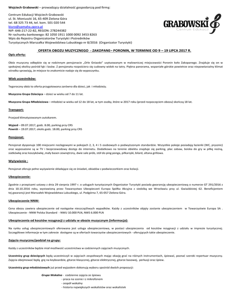 Wojciech Grabowski – prowadzący działalność gospodarczą pod firmą: Centrum Edukacji Wojciech Grabowski ul. St. Moniuszki 16, 65-409 Zielona Góra tel. 68 325 73 44, tel. kom. 501 020 544 [email protected] NIP: 646-217-22-82, REGON: 278244382 Nr rachunku bankowego: 82 1050 1911 1000 0092 3453 8263 Wpis do Rejestru Organizatorów Turystyki i Pośredników Turystycznych Marszałka Województwa Lubuskiego nr 8/2016 (Organizator Turystyki) OFERTA OBOZU MUZYCZNEGO - ZAKOPANE– PORONIN, W TERMINIE OD 9 – 19 LIPCA 2017 R. Opis oferty: Obóz muzyczny odbędzie się w rodzinnym pensjonacie „Orle Gniazdo” usytuowanym w malowniczej miejscowości Poronin koło Zakopanego. Znajduje się on w spokojnej okolicy pośród łąk i lasów. Z pensjonatu rozpościera się cudowny widok na tatry. Piękna panorama, wspaniałe górskie powietrze oraz niepowtarzalny klimat ośrodka sprawiają, że miejsce to znakomicie nadaje się do wypoczynku. Wiek uczestników: Tegoroczny obóz to oferta przygotowana zarówno dla dzieci, jak i młodzieży. Muzyczna Grupa Dziecięca – dzieci w wieku od 7 do 11 lat. Muzyczna Grupa Młodzieżowa – młodzież w wieku od 12 do 18 lat, w tym osoby, które w 2017 roku (przed rozpoczęciem obozu) skończą 18 lat. Transport: Przejazd klimatyzowanym autokarem. Wyjazd – 09.07.2017, godz. 8.00, parking przy CRS Powrót – 19.07.2017, około godz. 18.00, parking przy CRS Pensjonat: Pensjonat dysponuje 100 miejscami noclegowymi w pokojach 2, 3, 4 i 5 osobowych o podwyższonym standardzie. Wszystkie pokoje posiadają łazienki (WC, prysznic) oraz wyposażone są w TV i bezprzewodowy dostęp do internetu. Dodatkowo na terenie obiektu znajduje się parking, plac zabaw, boiska do gry w piłkę nożną, siatkówkę oraz koszykówkę ,mały basen zewnętrzny, dwie sale prób, stół do ping ponga, piłkarzyki, bilard, altana grillowa. Wyżywienie : Pensjonat oferuje pełne wyżywienie składające się ze śniadań, obiadów z podwieczorkiem oraz kolacji. Ubezpieczenie: Zgodnie z przepisami ustawy z dnia 29 sierpnia 1997 r. o usługach turystycznych Organizator Turystyki posiada gwarancję ubezpieczeniową o numerze GT 291/2016 z dnia 10.10.2016 roku, wystawioną przez Towarzystwo Ubezpieczeń Europa Spółka Akcyjna z siedzibą we Wrocławiu przy ul. Gwiaździstej 62. Beneficjentem tej gwarancji jest Marszałek Województwa Lubuskiego, ul. Podgórna 7, 65-057 Zielona Góra. Ubezpieczenie NNW: Cena obozu zawiera ubezpieczenie od następstw nieszczęśliwych wypadków. Każdy z uczestników objęty zostanie ubezpieczeniem w Towarzystwie Europa SA . Ubezpieczenie - NNW Polska Standard - NWU 10.000 PLN, NWS 6.000 PLN Ubezpieczenia od kosztów rezygnacji z udziału w obozie muzycznym (informacja): Na rynku usług ubezpieczeniowych oferowana jest usługa ubezpieczeniowa, w postaci ubezpieczenia od kosztów rezygnacji z udziału w imprezie turystycznej. Szczegółowe informacje w tym zakresie dostępne są w ofertach towarzystw ubezpieczeniowych - oferujących takie ubezpieczenie. Zajęcia muzyczne/podział na grupy: Każdy z uczestników będzie miał możliwość uczestnictwa w codziennych zajęciach muzycznych. Uczestnicy grup dziecięcych będą uczestniczyli w zajęciach zespołowych mając okazję grać na różnych instrumentach, śpiewać, poznać szeroki repertuar muzyczny. Zajęcia obejmować będą grę na keyboardzie, gitarze klasycznej, gitarze elektrycznej, gitarze basowej, perkusji oraz śpiew. Uczestnicy grup młodzieżowych już przed wyjazdem dokonują wyboru spośród dwóch propozycji: Grupa Wokalna - codzienne zajęcia ze śpiewu - praca na scenie i z mikrofonem - zespół wokalny - historia największych wokalistów oraz wokalistek Grupa Instrumentalna – keyboard, gitara klasyczna, gitara elektryczna, gitara basowa, perkusja. Propozycja idealna dla miłośników zespołowego grania oraz fanów takich gatunków muzycznych jak rock, pop, jazz. - codzienne zajęcia zespołowe - praca na scenie - historia największych zespołów - poznanie szerokiego repertuaru muzycznego - tworzenie własnych utworów Zajęcia prowadzone będą przez nauczycieli ze Szkoły Muzycznej YAMAHA w Zielonej Górze. Dodatkowe atrakcje – wycieczki: Tegoroczny obóz obfitował będzie nie tylko w atrakcje muzyczne ale również w wiele niezapomnianych wycieczek. Czekają nas : wycieczka nad Morskie Oko wycieczka do Doliny Kościeliskiej połączona z wizytą w Jaskini Mroźnej wycieczka wraz z wyjazdem wyciągiem na słynną skocznie narciarską Wielka Krokiew wycieczka do parku wodnego Termy Bania w Bukowinie Tatrzańskiej wycieczka do parku linowego Złota Grań na Gubałówce wycieczki do Zakopanego ognisko oraz wieczór z kapelą góralską dyskoteki, karaoke gry i zabawy sportowe całe mnóstwo dodatkowych atrakcji Termin obozu: 9 – 19 lipiec 2017 Cena uczestnictwa w obozie: 1699 zł. – dla uczniów Szkoły Muzycznej YAMAHA w Zielonej Górze 1799 zł. – dla wszystkich osób spoza Szkoły Muzycznej YAMAHA Zasady płatności ceny: wpłata zaliczki w wysokości 30% ceny w terminie 14 dni od zawarcia umowy, pozostałe 70% ceny płatne w terminie do dnia 30 dni od dnia zawarcia umowy, dokładny termin zostanie ustalony w umowie. Cena uczestnictwa w obozie obejmuje: zakwaterowanie - 10 noclegów pełne wyżywienie transport autokarem taksa klimatyczna codzienne zajęcia muzyczne wszystkie wycieczki oraz bilety wstępów wszystkie imprezy dodatkowe (grill, ognisko, dyskoteka itp.) ubezpieczenie TU Europa licencjonowany przewodnik górski w Tatry Informacja o możliwości ewentualnego odwołania obozu muzycznego: Jeżeli liczba uczestników zgłoszonych do udziału w obozie muzycznym nie przekroczy: 40 osób, Organizator Turystyki zastrzega sobie prawo do odwołania obozu muzycznego. Odwołanie może nastąpić najpóźniej na 30 dni przed terminem rozpoczęcia obozu muzycznego. Przedstawiciele ustawowi uczestników zostaną pisemnie poinformowany o odwołaniu w terminie 7 dni od