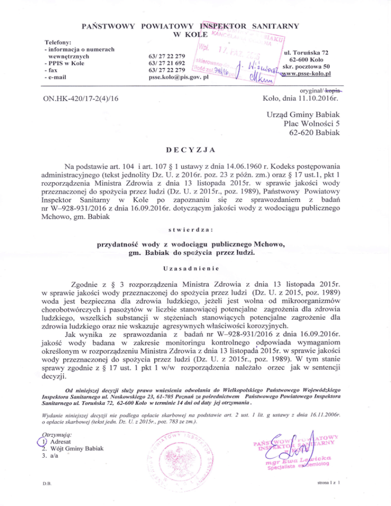 Telefony: PAŃSTwowY PowIATowY f,'pśF"'p'rron SANITARNY w KOLE ri' - informacja o numerach wewnętrznych - PPIS w Kole - fax - e-mail 692 :-: : 63t 27 22279 63t 27 2t 63t 27 22 27s ) skr. pocztowa 50 ?'qlt 'l ,l pl [email protected]. ul. Toruńska 72 62-600 Koło ,l 'w.psse-kolo.nl oryginał/.kopi+. Koło, dnia 1 I.I0.2016r. oN.HK-420/t7-2(4)116 Urząd Gminy Babiak Plac Wolności5 62-620 Babiak DECYZJA Na podstawie ań. 104 i art. I07 $ 1 ustawy z dnta |4.06.1960 r. Kodeks postępowania administracyjnego (tekst j ednolity Dz. U . z 2016r. poz. 23 z późn. zm.) oraz $ 1 7 ust. i , pkt i rozporządzenia Ministra Zdrowia z dnia 13 listopada 20I5r. w sprawie jakościwody przeznaczonej do spozycia przęz ludzi (Dz. U. z Ż0I5r., PoZ. 1989), Państwowy Powiatowy Inspektor Sanitarny w Kole po zapoznaniu się ze sprawozdaniem z badan nr W-928-93I|20I6 z dnia 16.09.2016r. dotyczącym jakoŚci wody z wodociągu publicznego Mchowo, gm. Babiak stwierdzaz prrydatnośćwody z wodociągu publicznego Mchowo, gm. Babiak do spożveia przez ludzi. Uzasadnienie Zgodnie z $ 3 rozporządzenia Ministra Zdrowia z dnia 13 listopada 20I5r. w sprawie jakościwody plzeznaczonej do spoŹycia przezludzi (Dz. U. z2015,poz. 1989) woda jest bezpięczna dla zdrowia ludzkiego, jeżeli jest wolna od mikroorganizmów chorobotwórczych i pasoŻytów w liczbie stanowiącej potencjalne zagroŻenia dla zdrowia ludzkiego, wszelkich substancji w stęzeniach stanowiących potencjalne zagroŻenle dla zdrowia ludzkiego oraz nie wskazuj e agresywnych właściwościkorozyjnych. Jak wynika ze sprawozdania z badan nr W-928-93I120I6 z dnia 16.09.2016r. jakośćwody badana w zakresie monitoringu kontrolnego odpowiada wymaganiom okreŚlonym w rozporządzeniu Ministra Zdrowiaz dnla 13 listopada2)I5r. w sprawie jakości wody przeznaczonej do spożycia przez ludzt (Dz. U. z 20I5r.' poz. 1989). W tym stanie Splawy zgodnie z $ 17 ust. 1 pkt 1 w/w rozporuądzenia należałoorzec jak w sentencji decyzji. od niniejszej rlecyzji służyprawo wniesienia odwołania do Wielkopolskiego Państwowego Wojewódzkiego Inspektora Sanitarnego ul. Noskowskiego 23, 61-705 Poznań za pośrednictwem Państwowego Powiatowego Inspektora Sanitarnego ul. Toruńska 72, 62-600 Koło w terminie 14 dni od daty jej otrzymania. Wydanie ninieiszej decyzji nie podlega opłacie skarbowej na podstawie art. 2 ust. 1 lit. g ustawy z dnią 16.11.2006r. o opłacie skarbowej (tekst jedn. Dz. U. z 2015r., poz. 78j ze zm.). Otrzvmuia: .Ą Y. ńa'.śut wojt Gminy Babiak 3. ala ,/, ' ł'--"',''' I ,t .ł- .".,,. ;l:,.:. ..::,'.1 ,, l 'ł'.'.ł :! '. .r: ,', : t,, ': . 1, l: . ' i ',, i:..',, ij : I .+;$, ee. r\;'ł " .,,,j , ź:. ''' : '' Jyq'-'ił:i]'''r ' i. rr,iij ,i,r i;:r!' _rł Y :1'.Si ij;i,rrr " r*!-atiu'1fili! ." sffona I z 1