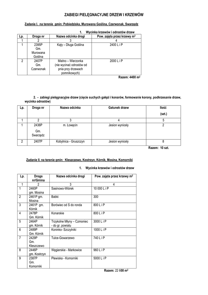 ZABIEGI PIELĘGNACYJNE DRZEW I KRZEWÓW Zadanie I. na terenie gmin: Pobiedziska, Murowana Goślina, Czerwonak, Swarzędz Lp. 1 1 2 Droga nr 2 2395P Gm. Murowana Goślina 2407P Gm. Czerwonak 1. Wycinka krzewów i odrostów drzew Nazwa odcinka drogi Pow. zajęta przez krzewy m2 3 4 Kąty – Długa Goślina 2400 L i P Mielno – Wierzonka (nie wycinać odrostów od pnia przy drzewach pomnikowych) 2000 L i P Razem: 4400 m2 2. - zabiegi pielęgnacyjne drzew (cięcie suchych gałęzi i konarów, formowanie korony, podkrzesanie drzew, wycinka odrostów) Lp. Droga nr Nazwa odcinka Gatunek drzew Ilość (szt.) 1 1 2 2436P 3 m. Łowęcin 4 Jesion wyniosły 5 2 Kobylnica - Gruszczyn Jesion wyniosły 8 Gm. Swarzędz 2 2407P Razem: 10 szt. Zadanie II. na terenie gmin: Kleszczewo, Kostrzyn, Kórnik, Mosina, Komorniki 1. Lp. 1 1 2 3 4 5 6 7 8 9 Droga nr/Gmina 2 2460P gm. Mosina 2461P gm. Mosina 2461P gm. Kórnik 2478P Gm. Kórnik 2464P gm. Kórnik 2489P Gm. Kórnik 2429P Gm. Kleszczewo 2446P gm. Kostrzyn 2387P Gm. Komorniki Wycinka krzewów i odrostów drzew Nazwa odcinka drogi Pow. zajęta przez krzewy m2 3 Sasinowo-Wiórek 10 000 L i P 4 Babki 300 Borówiec od S do ronda 800 L i P Konarskie 800 L i P Trzykolne Młyny – Czmoniec - do gr. powiatu Koninko- Szczytniki 3000 L i P Tulce-Gowarzewo 740 L i P Węgierskie - Markowice 960 L i P Plewiska - Komorniki 5000 L i P 1000 L i P Razem: 22 600 m2 2. - zabiegi pielęgnacyjne drzew (cięcie suchych gałęzi i konarów, formowanie korony, podkrzesanie drzew, wycinka odrostów) Lp. Droga nr Nazwa odcinka Gatunek drzew Ilość (szt.) 1 1 2 2429P 3 Gowarzewo ul. Tulecka 21 4 Lipa drobnolistna 5 5 Nagradowice – Komorniki Klony, jesiony, lipy 100 Daszewice ul. Poznańska dz. nr 178 Lipa drobnolistna 2 Krosno Kasztanowiec 1 Gułtowy - Siedlec Kasztanowiec 8 Jesion wyniosły 48 Topola kanadyjska 101 Topola włoska 2 Klon jawor 2 Jesion wyniosły 6 Topola kanadyjska 12 Jesion pensylwański 1 Wiąz szypułkowy 1 Klon jesionolistny 1 Węgierskie Robinia biała 9 Wiktorowo Robinia biała 5 Wróblewo-Trzek Topola kanadyjska 108 Jesion wyniosły 3 Wierzba biała 1 Lipa drobnolistna 5 Robinia akacjowa 5 Gm. Kleszczewo 2 2440P Gm. Kleszczewo 3 2461P Gm. Mosina 4 2465P Gm. Mosina 5 2445P gm. Kostrzyn 6 2411P Klony - Węgierskie Gm. Kostrzyn 7 2444P Iwno Gm. Kostrzyn 8 2446P Gm. Kostrzyn 9 2486P Gm. Kostrzyn 10 b. DW 434 gm. Kostrzyn 11 2412P Chomęcice Gm. Komorniki Razem: 426 szt. Zadanie III. na terenie gmin: Rokietnica, Suchy Las, Tarnowo Podgórne, Buk, Dopiewo, Stęszew 1. Lp. 1 1 2 3 4 5 6 7 8 9 10 Droga nr 2 1859P Gm. Rokietnica 2425P Gm. Rokietnica 2424P Gm. Rokietnica 2404P Gm. Rokietnica 2400P Gm. Rokietnica 2458P Gm. Buk 2061P Gm. Suchy Las 2412P Gm. Dopiewo 2402P Gm. Dopiewo 2452P Gm. Stęszew Wycinka krzewów i odrostów drzew: Nazwa odcinka drogi 3 Żydowo ul. Przecławska Pow. zajęta przez krzewy m2 4 400 L i P Rokietnica - Żydowo 4200 L i P Kiekrz ul. Kierska 800 L i P Napachanie – Gr. Gminy Ul. Tarnowska 3200 L i P Sobota - Bytkowo 5000 L i P Dobieżyn 2000 L i P Zielątkowo ul. Leśna 900 Trzcielin - Konarzewo 2700 L i P Joanka - Trzcielin 8000 L i P od gr. powiatu – Modrze (do znaku D-42) 1800 L i P Razem: 29 000 m2 2. Lp. Zabiegi pielęgnacyjne drzew (cięcie suchych gałęzi i konarów, formowanie korony, podkrzesanie drzew, wycinka odrostów): Droga nr Lokalizacja Gatunek drzew Ilość (szt.) 1 1 2 2402P Gm. Dopiewo 2 2401P 3 Dopiewo ul. Wyzwolenia dz. nr 685/2 4 Lipa drobnolistna 5 2 Dąbrówka ul. Poznańska Klon jesionolistny 120 Dąb 5 Jesion wyniosły 1 Kasztanowiec pospolity 3 Lipa drobnolistna 3 Lisówki Lipa drobnolistna 41 Wysogotowo ul. Skórzewska Brzozy 85 Gm. Dopiewo 3 2401P Dąbrówka ul. Poznańska Gm. Dopiewo 4 2457P Gm. Dopiewo 5 2418P gm. Tarnowo Podg. 6 2458P Gm. Buk 7 1859P Dobieżyn ul. Powstańców Wlkp. Lipa drobnolistna 40 Żydowo ul. Przecławska wierzba 13 Rokietnica lipa 1 Kiekrz Świerk pospolity 11 Modrze Lipa drobnolistna 23 Gm. Rokietnica 8 2424P Gm. Rokietnica 9 2424P Gm. Rokietnica 10 2452P Gm. Stęszew Razem: 348 szt. Razem Zad I-III: 784 szt. drzew do pielęgnacji oraz 56 000 m2 krzewów do usunięcia