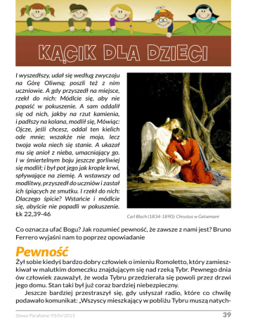 KAcik dla dzieci I wyszedłszy, udał się według zwyczaju na Górę Oliwną; poszli też z nim uczniowie. A gdy przyszedł na miejsce, rzekł do nich: Módlcie się, aby nie popaść w pokuszenie. A sam oddalił się od nich, jakby na rzut kamienia, i padłszy na kolana, modlił się, Mówiąc: Ojcze, jeśli chcesz, oddal ten kielich ode mnie; wszakże nie moja, lecz twoja wola niech się stanie. A ukazał mu się anioł z nieba, umacniający go. I w śmiertelnym boju jeszcze gorliwiej się modlił; i był pot jego jak krople krwi, spływające na ziemię. A wstawszy od modlitwy, przyszedł do uczniów i zastał ich śpiących ze smutku. I rzekł do nich: Dlaczego śpicie? Wstańcie i módlcie się, abyście nie popadli w pokuszenie. Łk 22,39-46 Carl Bloch (1834-1890): Chrystus w Getsemani Co oznacza ufać Bogu? Jak rozumieć pewność, że zawsze z nami jest? Bruno Ferrero wyjaśni nam to poprzez opowiadanie Pewność Żył sobie kiedyś bardzo dobry człowiek o imieniu Romoletto, który zamieszkiwał w malutkim domeczku znajdującym się nad rzeką Tybr. Pewnego dnia ów człowiek zauważył, że woda Tybru przedzierała się powoli przez drzwi jego domu. Stan taki był już coraz bardziej niebezpieczny. Jeszcze bardziej przestraszył się, gdy usłyszał radio, które co chwilę podawało komunikat: „Wszyscy mieszkający w pobliżu Tybru muszą natychSłowo Parafialne 93/IV/2015 39 WIELKANOC 2015 miast opuścić swoje domostwa; rzeka będzie wylewała coraz bardziej”. Romoletto był człowiekiem bardzo pobożnym i pokładał wielką ufność w Panu. Uklękł z pokorą i zaczął gorliwą modlitwę. „Panie, wybaw mnie!” W pewnym momencie usłyszał płynący z góry głos. „Nie lękaj się, Romoletto! Nie zapomniałem o tobie!” Był to głos Pana Boga. Romoletto wstał i jak gdyby nigdy nic zaczął wykonywać swoje codzienne obowiązki. Około jedenastej woda dotarła mu już do ramion i Romoletto musiał się przenieść na drugie piętro. Zauważył jak obok jego domu przepływała łódź ratunkowa. Strażacy, którzy go zauważyli zaczęli krzyczeć: „Szybko, uciekaj razem z nami! Pozostawać tutaj to szaleństwo!” „Nie. Mam zapewnienie z góry!” odpowiedział im ów człowiek, wskazując palcem na niebo. O godzinie piętnastej woda zaczęła pokrywać już jego łóżko i Romoletto musiał wycofać się na strych. Przepływała następna barka i znów ktoś zawołał: „Wychodź natychmiast! Woda wciąż się podnosi!” Romoletto i tym razem odmówił ostentacyjnie: „Już ja mam swojego protektora!” O siedemnastej piętnaście woda dochodziła już do rynien i Romoletto zmuszony był wdrapać się na dach. Przepływał znów jakiś ponton Czerwonego Krzyża i poszukiwał ostatnich zagubionych. Jednak i on na próżno usiłował zabrać ze sobą Romoletta. Przywarł mocno do komina jak rzep do psiego ogona. „Nie potrzebuję waszej pomocy. Mam kogoś, na kogo mogę liczyć”. Jednak woda wciąż wzbierała i wzbierała i... za dziesięć szósta Romoletto się utopił. Gdy tylko znalazł się w Raju zaczęły nim miotać furie. Przybiegł przed tron Pana Boga i powiedział: „Czy nie powiedziałeś mi, że będziesz o mnie myślał? Czy nie dziwi Cię to, że widzisz przed sobą topielca?” Pan Bóg przyjrzał się mu wzrokiem pełnym dobroci. „Jak to, nie myślałem o tobie, Romoletto. Przecież wysłałem ci aż trzy barki!” Bóg zawsze jest z nami! 40 Słowo Parafialne 93/IV/2015 KĄCIK DLA DZIECI Kącik małego kucharza Jajka są symbolem nowego życia. Ta potrawa jest nie tylko smaczna. Jej wiosenne składniki podkreślą tę ciepłą porę roku i ozdobią świąteczny stół. JAJA FASZEROWANE • 4 jajka • 2 rzodkiewki • 2 łodyżki szczypiorku • 1 gałązka koperku • 1 plasterek szynki • 1/4 papryki czerwonej • 1 łyżka jogurtu naturalnego lub majonezu ZANIM ZACZNIESZ: ugotuj jajka na twardo! 1. Obierz jajka i przepołów je wzdłuż. Łyżeczką wyjmij żółtka i przełóż je do miseczki. Do żółtek dodaj jogurt i widelcem ugnieć na gładką masę. 2. Rzodkiewkę zetrzyj na tarce o najmniejszych oczkach, szczypiorek bardzo drobno pokrój, koperek posiekaj, szynkę pokrój w bardzo drobną kosteczkę. Dodaj wszystko do masy jajecznej i wymieszaj. 3. Ułóż białka jajek na talerzu i łyżeczką nakładaj farsz do wgłębień po żółtku tak, by wystawał ponad. 4. Podawaj posypane kiełkami np. brokułu. Farsz jajeczny możesz doprawić solą i pieprzem, oraz dodać do niego pokrojony w drobną kosteczkę żółty ser. Słowo Parafialne 93/IV/2015 41 WIELKANOC 2015 Pisanki Wielkanocną tradycją jest barwienie pisanek. Jest wiele sposobów na to, by były piękne, kolorowe i wesołe. Poznajcie kilka z nich: • kraszanki – jajka barwione w wywarze uzyskiwanym z naturalnych składników, np. z buraków, z łupin cebuli, kory drzew, • pisanki – jajka zdobione za pomocą patyczka zanurzanego w gorącym wosku, a następnie zanurzane w barwniku, • oklejanki – jajka zdobione poprzez przyklejanie do nich kolorowej bibuły, włóczki, słomy, tkaniny, • drapanki – kraszanki, na których wydrapuje się wzorki za pomocą igły lub malutkiego nożyka, • ażurki – pisanki ażurowe, wykonywane są z wydmuszek jaj poprzez wywiercanie w skorupce maleńkich otworków przy pomocy malutkiego wiertła. Wydmuszka jest malowana najczęściej farbą akrylową. • rysowanki – jajka ozdabiane poprzez malowanie wzorów farbami, flamastrami. Jeśli chcesz, spróbuj z nami stworzyć kraszanki. To nie jest trudne, a do wykonania ich wystarczą Ci produkty, które na pewno masz w domu. Kilka podstawowych kolorów dadzą nam na przykład: • żółty – liście brzozy, olchy i młodej jabłoni, suszone kwiaty jaskrów polnych, rumianek, suche łupinki cebuli oraz igły modrzewiowe; • czerwony – kora dębu, owoce czarnego bzu, suszone jagody, suche łupiny cebuli; • różowy – sok z buraka (intensywność koloru zale