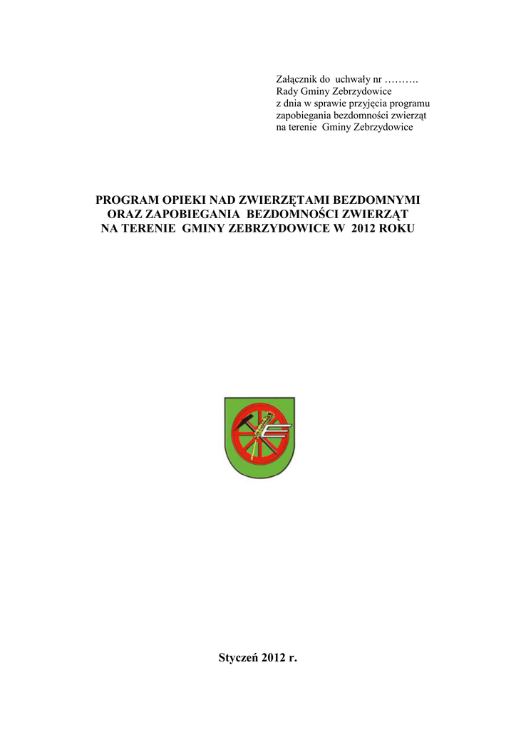 Załącznik do uchwały nr ………. Rady Gminy Zebrzydowice z dnia w sprawie przyjęcia programu zapobiegania bezdomności zwierząt na terenie Gminy Zebrzydowice PROGRAM OPIEKI NAD ZWIERZĘTAMI BEZDOMNYMI ORAZ ZAPOBIEGANIA BEZDOMNOŚCI ZWIERZĄT NA TERENIE GMINY ZEBRZYDOWICE W 2012 ROKU Styczeń 2012 r. WPROWADZENIE Z dniem 1 stycznia 2012 r. nastąpiła nowelizacja ustawy z dnia 21 sierpnia 1997 r. o ochronie zwierząt. Zgodnie z postanowieniami zawartymi w ustawie zapewnienie opieki bezdomnym zwierzętom należy do zadań własnych gminy . Natomiast artykuł 11a tej ustawy zobowiązuje radę gminy do corocznego w terminie do 31 marca określania w drodze uchwały programu opieki nad zwierzętami bezdomnymi oraz zapobiegania bezdomności zwierząt . Niniejszy program opieki nad zwierzętami bezdomnymi oraz zapobiegania bezdomności zwierząt na terenie gminy Zebrzydowice ma zastosowanie do zwierząt domowych, w szczególności psów i kotów, w tym kotów wolno żyjących oraz do zwierząt gospodarskich . Głównymi przyczynami bezdomności zwierząt są : 1) niekontrolowane rozmnażanie , 2) porzucanie zwierząt przez właścicieli , 3) ucieczki zwierząt 4) brak edukacji i wiedzy społeczeństwa w zakresie metod zapobiegania bezdomności ze szczególnym uwzględnieniem sterylizacji i kastracji . I. Celem programu jest : Celem programu jest realizacja zadań własnych polegających na : - prowadzeniu działań służących zapewnieniu odpowiedniej opieki bezdomnym zwierzętom z terenu gminy Zebrzydowice ; współpraca z organizacjami pozarządowymi , których statutowym celem działania jest przeciwdziałanie bezdomności zwierząt ; współpraca z Inspekcją Weterynaryjną , a także wszystkimi osobami , które podejmują działania zmierzające do poprawy bytowania zwierząt ; edukacja mieszkańców gminy w zakresie traktowania zwierząt oraz obowiązków właścicieli wobec zwierząt domowych . 2. Zakres realizacji programu : Program obejmuje wszelkie działania gminy mające na celu realizację założonych celów poprzez : 1) 2) 3) 4) zapewnienie bezdomnym zwierzętom miejsca w schronisku dla zwierząt ; opiekę nad wolno żyjącymi kotami , w tym ich dokarmianie ; odławianie bezdomnych zwierząt ; obligatoryjną sterylizację albo kastrację zwierząt w schronisku ; 5) poszukiwanie właścicieli dla bezdomnych zwierząt ; 6) usypianie ślepych miotów ; 7) wskazanie gospodarstwa rolnego w celu zapewnienia miejsca dla zwierząt ; 8) zapewnienie całodobowej opieki weterynaryjnej w przypadkach zdarzeń drogowych z udziałem zwierząt . Ad.1 . W celu zapewnienia bezdomnym zwierzętom miejsca w schronisku spisana została stosowna umowa ze schroniskiem w Cieszynie . Bezdomne zwierzęta przewożone są do schroniska po uprzednim telefonicznym zgłoszeniu przez policję oraz pracowników Referatu Gospodarki Przestrzennej , Rolnictwa , Ochrony Środowiska i Mienia Komunalnego Urzędu Gminy Zebrzydowice . Ad.2 . Celem zapewnienia opieki nad wolno żyjącymi kotami Gmina zawarła umowę z Fundacją w Cieszynie do wyłapywania bezdomnych dla Zwierząt i Środowiska „Lepszy Świat „ oswojonych kotów pozostających bez opieki . Ad.3 do 6 Obligatoryjna sterylizacja , kastracja zwierząt , poszukiwanie właścicieli dla bezdomnych zwierząt , usypianie ślepych miotów , odławianie bezdomnych zwierząt została powierzona schronisku dla zwierząt w Cieszynie oraz Fundacji dla Zwierząt i Środowiska „Lepszy Świat „ w Cieszynie . Ad. 7 W przypadku czasowego odebrania zwierzęcia ( zwierząt ) właścicielowi lub opiekunowi na podstawie decyzji wójta zwierzęta umieszczone zostaną w pomieszczeniach PPUH AGROSPED w Zebrzydowicach . Ad.8 Celem zapewnienia całodobowej opieki weterynaryjnej w przypadkach zdarzeń drogowych z udziałem zwierząt gmina przygotowuje stosowny projekt umowy z Przychodnią Weterynaryjną TRIOVET w Jastrzębiu Zdroju . 3. Edukacja w zakresie ochrony zwierząt : W celu edukacji ekologicznej z zakresu ochrony zwierząt planuje się realizację następujących zadań : 1) promowanie prawidłowych postaw i zachowań człowieka w stosunku do zwierząt ; 2) uświadamianie potencjalnym właścicielom zwierząt praw i obowiązków wynikających z faktu nabycia, posiadania zwierzęcia . Edukacja mieszkańców z zakresu ochrony zwierząt jest kluczowym elementem Programu . Kampania ta będzie skierowana zarówno dla dzieci jak i dorosłych. W placówkach oświatowych prowadzone będą pogadanki. Narzędziem edukacyjnym będą broszury, ulotki, publikacje dotyczące ochrony zwierząt i zapobiegania ich bezdomności . Akcja edukacyjna będzie organizowana wspólnie przez gminę oraz organizację społeczne , których statutowym celem jest ochrona zwierząt, a także przez zainteresowane placówki oświatowe. Akcja będzie miała na celu uświadomienie potencjalnym właścicielom zwierząt wszystkich aspektów związanych z nabyciem, posiadaniem zwierzęcia , a także promowanie prawidłowych postaw i zachowań człowieka w stosunku do zwierząt . 4. Finansowanie programu : Środki finansowe przeznaczone na realizację zadań wynikających z Programu, w wysokości 36.500,00 zł zabezpieczone są w budżecie gminy Zebrzydowice . Środki finansowe przewiduje się do wydatkowania poprzez zlecenie : 1) wykonywania usług i dostaw , zgodnie z ustawą z dnia 29 stycznia 2004 r. Prawo zamówień publicznych ( Dz. U. z 2010 r. Nr 113 , poz. 759 z późn. zm. ) 2) realizacji zadań organizacjom pozarządowym , zgodnie z ustawą z dnia 24 kwietnia 2003 r. o działalności pożytku publicznego i o wolontariacie ( Dz. U. z 2010 r. Nr 234, poz. 1536 , z późn. zm. ) .