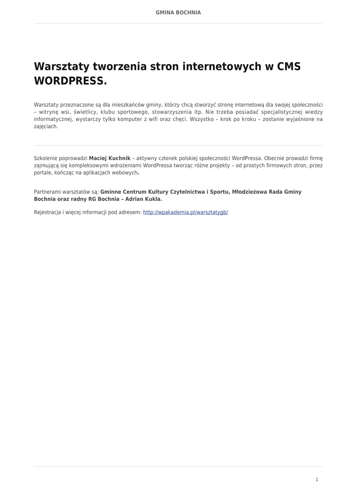 GMINA BOCHNIA Warsztaty tworzenia stron internetowych w CMS WORDPRESS. Warsztaty przeznaczone są dla mieszkańców gminy, którzy chcą stworzyć stronę internetową dla swojej społeczności – witrynę wsi, świetlicy, klubu sportowego, stowarzyszenia itp. Nie trzeba posiadać specjalistycznej wiedzy informatycznej, wystarczy tylko komputer z wifi oraz chęci. Wszystko – krok po kroku – zostanie wyjaśnione na zajęciach. Szkolenie poprowadzi Maciej Kuchnik – aktywny członek polskiej społeczności WordPressa. Obecnie prowadzi firmę zajmującą się kompleksowymi wdrożeniami WordPressa tworząc różne projekty – od prostych firmowych stron, przez portale, kończąc na aplikacjach webowych. Partnerami warsztatów są: Gminne Centrum Kultury Czytelnictwa i Sportu, Młodzieżowa Rada Gminy Bochnia oraz radny RG Bochnia – Adrian Kukla. Rejestracja i więcej informacji pod adresem: http://wpakademia.pl/warsztatygb/ 1