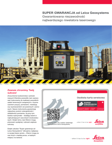 SUPER GWARANCJA od Leica Geosystems Gwarantowana niezawodność najtwardszego niwelatora laserowego Zawsze chronimy Twój sukces! Zrozumienie budownictwa i potrzeb naszych Klientów pozwoliło nam opracować instrumenty do realizacji wszystkich zadań terenowych związanych z wyznaczaniem pozycji, pomiarami, niwelacją czy wyznaczaniem osi poziomych i pionowych. Nasze instrumenty gwarantują najwyższy poziom wiarygodności i dokładności pomiarów, są przy tym bardzo wytrzymałe – działają nawet w najtrudniejszych warunkach środowiskowych. Dzięki temu nasi Klienci mogą pracować wydajniej i odnosić większe sukcesy. Dzięki usłudze "Super gwarancja od Leica Geosystems" oferujemy najlepszy w swojej klasie serwis – Klienci mogą na nas liczyć o każdej porze, w każdym miejscu na świecie. Osobista karta serwisowa SUPER GWARANCJA od Leica Geosystems Dożywotnia Bezpłatne gwarancja naprawy Zeskanuj kod, aby znaleźć lokalnego dystrybutora Leica Geosystems. Wysoka jakość Szwajcarska technologia SUPER gwarancja od Leica Geosystems Najlepsze produkty dostarczane są z najlepszą gwarancją i serwisem SUPER GWARANCJA od Leica Geosystems Dożywotnia gwarancja Bezpłatne naprawy Wysoka jakość Szwajcarska technologia Dożywotnia gwarancja producenta Certyfikowana wysoka jakość Gwarancja przez cały okres użytkowania produktu, zgodnie z warunkami Międzynarodowej Gwarancji Leica Geosystems. Obejmuje darmowe naprawy lub wymianę produktu posiadającego defekt wynikający z wad materiałowych lub błędów w procesie produkcji. Leica Geosystems prowadzi laboratorium kalibracyjne (nr SCS079) oraz laboratorium testowe (nr STS549). Obydwa są akredytowane przez SAS - Szwajcarski Urząd Akredytacyjny. Certyfikaty kalibracyjne i testowe wydawane przez Leica Geosystems są uznawane na świecie, dotyczą pomiaru kąta i odległości oraz częstotliwość i klasyfikacji lasera. Te certyfikaty gwarantują największą dokładność i wiarygodność naszych produktów. Wszystkie laboratoria są regularnie kontrolowane przez niezależną instytucję wydającą certyfikaty ISO 17025. 5 lat bez żadnych kosztów Gwarantujemy najlepszy serwis – jeśli Twój produkt zostanie uszkodzony w wyniku normalnego użytkowania opisanego w instrukcji obsługi – zostanie bezpłatne naprawiony. Nasze usługi obejmują: Koszta robocizny oraz naprawę, lub wymianę wadliwych części Rektyfikację i kalibrację Testy funkcjonalne i bezpieczeństwa pracy z urządzeniem Konserwację, czyszczenie produktu i pojemnika transportowego Zarejestruj swój produkt na stronie www.leica-geosystems. com/registration w ciągu 8 tygodni od daty zakupu i przedłuż gwarancję do 5 lat*. Szwajcarska technologia Szwajcarska technologia buduje zaufanie. Nasza działalność na świecie skupia się m. in. w centrach produkcyjnych, gdzie na pierwszym miejscu stawiamy na szwajcarską precyzję, dbałość o każdy szczegół w procesie produkcji i najnowocześniejszą technologię. Testy na wszystkich etapach projektowania i produkcji sprawiają, że nasze instrumenty spełniają najwyższe standardy w zakresie dokładności pomiaru i jakości wykonania. * Opcja przedłużenia gwarancji dotyczy Leica Rugby 100, Leica Rugby 100LR, Leica Rugby 260SG, Leica Rugby 270SG & Leica Rugby 280DG. Pracujemy dla Ciebie. Dzięki globalnej sieci składającej się z 260 centrów serwisowych w 87 krajach, Leica Geosystems wspiera Cię w każdym miejscu na świecie. Dowiedz się więcej: http://www.leica-geosystems.pl/ supergwarancja http://www.leica-geosystems.pl/supergwarancja Leica Geosystems Sp. z o.o. ul. Przasnyska 6b, 01-756 Warszawa Tel.: +48 22 350 59 00 Fax.: +48 22 350 59 01 www.leica-geosystems.pl Ilustracje, opisy i dane techniczne nie są wiążące i mogą ulec zmianie. Wszystkie prawa zastrzeżone. Drukowano w Polsce – Copyright Leica Geosystems AG, Heerbrugg, Szwajcaria, 2012. 02.14 – galledia