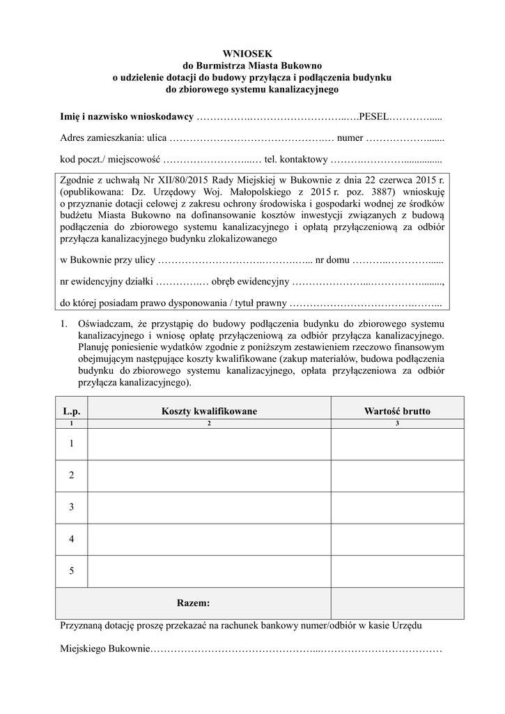 WNIOSEK do Burmistrza Miasta Bukowno o udzielenie dotacji do budowy przyłącza i podłączenia budynku do zbiorowego systemu kanalizacyjnego Imię i nazwisko wnioskodawcy …………….………………………..….PESEL…………..... Adres zamieszkania: ulica ……………………………………….… numer ………………....... kod poczt./ miejscowość ……………………...… tel. kontaktowy ……….…………............... Zgodnie z uchwałą Nr XII/80/2015 Rady Miejskiej w Bukownie z dnia 22 czerwca 2015 r. (opublikowana: Dz. Urzędowy Woj. Małopolskiego z 2015 r. poz. 3887) wnioskuję o przyznanie dotacji celowej z zakresu ochrony środowiska i gospodarki wodnej ze środków budżetu Miasta Bukowno na dofinansowanie kosztów inwestycji związanych z budową podłączenia do zbiorowego systemu kanalizacyjnego i opłatą przyłączeniową za odbiór przyłącza kanalizacyjnego budynku zlokalizowanego w Bukownie przy ulicy ………………………….……….…... nr domu ………..…………...... nr ewidencyjny działki ………….… obręb ewidencyjny …………………...……………........, do której posiadam prawo dysponowania / tytuł prawny ……………………………….……... Oświadczam, że przystąpię do budowy podłączenia budynku do zbiorowego systemu kanalizacyjnego i wniosę opłatę przyłączeniową za odbiór przyłącza kanalizacyjnego. Planuję poniesienie wydatków zgodnie z poniższym zestawieniem rzeczowo finansowym obejmującym następujące koszty kwalifikowane (zakup materiałów, budowa podłączenia budynku do zbiorowego systemu kanalizacyjnego, opłata przyłączeniowa za odbiór przyłącza kanalizacyjnego). 1. L.p. Koszty kwalifikowane Wartość brutto 1 2 3 1 2 3 4 5 Razem: Przyznaną dotację proszę przekazać na rachunek bankowy numer/odbiór w kasie Urzędu Miejskiego Bukownie…………………………………………...……………………………… Oświadczam, że zapoznałem się z Uchwałą i spełniam warunki określone w „Regulaminie udzielania dotacji ze środków budżetu Miasta Bukowo na dofinansowanie kosztów inwestycji związanych z budową podłączeń budynków do zbiorowego systemu kanalizacyjnego i opłaty przyłączeniowej za odbiór przyłącza kanalizacyjnego” stanowiącym załącznik Nr 1 do Uchwały Nr XII/80/2015 Rady Miejskiej w Bukownie z dnia 22czerwca 2015 r. (Dz. Urzędowy Woj. Małopolskiego z 2015 r. poz. 3887), w szczególności oświadczam, że wskazany we wniosku budynek podłączany do zbiorczego systemu kanalizacyjnego służy zaspakajaniu potrzeb mieszkaniowych. Ponadto oświadczam, że: - znane mi są skutki składania fałszywych oświadczeń wynikające z art. 297 §1 Kodeksu karnego; - podane we wniosku informacje są zgodne z aktualnym stanem faktycznym i prawnym; - znane mi są prawa dotyczące przetwarzania moich danych osobowych wynikające z art. 32 ustawy z dnia 29 sierpnia 1997 r. o ochronie danych osobowych (t.j.: Dz. U. z 2015 r. poz. 2135 z późn. zm.) oraz wyrażam zgodę na przetwarzanie moich danych osobowych dla potrzeb niezbędnych z uzyskaniem i rozliczeniem dotacji zgodnie z ww. ustawą. …………………………………………. (czytelny podpis Wnioskodawcy) Załączniki: 1. Dokument potwierdzający tytuł prawny do dysponowania nieruchomością podłączaną do sieci kanalizacyjnej (aktualny odpis księgi wieczystej nieruchomości - oryginał lub kopia, lub inny dokument własności np. akt własności ziemi, dowód opłacania podatku od nieruchomości w przypadku wnioskodawców będących samoistnymi posiadaczami takich nieruchomości). 2. Upoważnienie udzielone przez właściciela, jeżeli wnioskodawca nie jest właścicielem lub użytkownikiem wieczystym nieruchomości podłączanej do sieci kanalizacyjnej. 3. Upoważnienie do wystąpienia z wnioskiem i odbioru dotacji udzielone przez współwłaściciela/współwłaścicieli nieruchomości podłączanej do sieci kanalizacyjnej (jeżeli dotyczy). 4. Uzyskana od odbiorcy ścieków informacja o zakończeniu budowy kolektora sanitarnego i możliwości podłączenia budynku Wnioskodawcy do zbiorczej kanalizacji sanitarnej wraz z odbitką planu sytuacyjnego z wkreślonym sięgaczem do działki oraz projektowanym przebiegiem przyłącza kanalizacyjnego do budynku mieszkalnego. Zarejestrowano pod nr …...… ……………….… …………………………… data (dzień/mc./rok) imię i nazwisko rejestrującego ….……. podpis