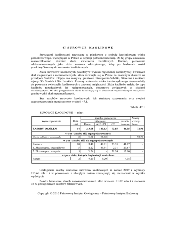 47. S U R O W C E KAOLINOWE Surowcami kaolinowymi nazywane są piaskowce o spoiwie kaolinitowym wieku górnokredowego, występujące w Polsce w depresji północnosudeckiej. Do tej grupy surowców zakwalifikowano równieŜ złoŜe zwietrzelin bazaltowych Dunino, pierwotnie udokumentowanych jako złoŜe surowca haloizytowego, który po badaniach został przeklasyfikowany do surowców kaolinitowych. ZłoŜa surowców kaolinowych powstały w wyniku regionalnej kaolinityzacji kwaśnych skał magmowych i metamorficznych, która rozwinęła się w Polsce na znacznym obszarze na przedpolu Sudetów. Objęła ona masywy granitowe Strzegomia-Sobótki, Strzelina i niektóre rejony Gór Sowich i Gór Izerskich. Procesy wietrzenia wieku trzeciorzędowego doprowadziły do powstania zwietrzelin kaolinowych o znacznej miąŜszości. ZłoŜa kaolinów naleŜą do typu kaolinów rezydualnych lub redeponowanych, obszarowo związanych ze skałami macierzystymi. W obu przypadkach złoŜa lokalizują się w obszarach wymienionych masywów granitowych i skał metamorficznych. Stan zasobów surowców kaolinowych, ich strukturę rozpoznania oraz stopień zagospodarowania przedstawiono w tabeli 47.1. Tabela 47.1 SUROWCE KAOLINOWE - mln t Wyszczególnienie ZASOBY OGÓŁEM ZłoŜa zakładów czynnych Ilość złóŜ 14 Razem 213.68 Zasoby geologiczne bilansowe A+B+C1 C2 140.13 w tym - zasoby złóŜ zagospodarowanych 2 81.02 81.02 Zasoby pozabi- przemylansowe słowe 73.55 46.05 72.96 - - 72.96 w tym - zasoby złóŜ nie zagospodarowanych Razem 10 123.46 49.91 73.55 1. ZłoŜa rozpoz. szczegółowo 5 52.22 49.91 2.31 2. ZłoŜa rozpoz. wstępnie 5 71.24 71.24 41.67 29.67 12.00 - w tym - złoŜa, których eksploatacji zaniechano 2 9.20 9.20 - 4.38 - Razem - Geologiczne zasoby bilansowe surowców kaolinowych na koniec 2009 r. wyniosły 213,68 mln t i w porównaniu z ubiegłym rokiem zmniejszyły się nieznacznie w wyniku wydobycia. Zasoby bilansowe dwóch zagospodarowanych złóŜ wynoszą 81,02 mln t i stanowią 38 % geologicznych zasobów bilansowych. Copyright © 2010 Państwowy Instytut Geologiczny – Państwowy Instytut Badawczy SUROWCE KAOLINOWE 2 Zasoby przemysłowe uległy zmniejszeniu w wyniku wydobycia i wyniosły w 2009 r. 72,96 mln t, co stanowi 90 % geologicznych zasobów bilansowych złóŜ zagospodarowanych. Wydobycie surowców kaolinowych było nieco niŜsze niŜ w ubiegłym roku i wyniosło 261 tys. t. W 2009 r. ze złoŜa Dunino wydobyto 45 ton kaolinów. Kaoliny wysokogatunkowe – obecnie uznaje się za nie frakcję poniŜej 15 µm, wykorzystywane są przez przemysł ceramiczny, gumowy, polimerów czy włókna szklanego. Grubsze frakcje mają natomiast zastosowanie do produkcji popularnych w ostatnich latach płytek ceramicznych typu „gres porcellanato”, do produkcji których wymagane są kaoliny szlamowane o bardzo niskich zawartościach tlenków barwiących (TiO2, Fe2O3). Ponadto surowce kaolinowe stosowane są do produkcji ceramiki kamionkowej, białego cementu oraz materiałów ogniotrwałych. Krajowe zapotrzebowanie na surowce kaolinowe pokrywane jest produkcją z własnych złóŜ i w niewielkim stopniu importem. Kaolin produkuje się teŜ w kopalniach piasków szklarskich (Biała Góra) i piasków formierskich (Grudzeń-Las). Import kaolinów w 2009 r. był mniejszy o około 30 % i wyniósł 98,68 tys. t, w tym 89,31 tys. t kaolinu surowego i 9,37 tys. t kaolinu wypalonego. Eksport był niewielki i wyniósł 11,66 tys. t (tabela 47.2). Tabela 47.2 Kierunki polskiego importu i eksportu kaolinu i glin kaolinowych IMPORT Lp. Kraj Ilość tys. ton Świat (ogółem) 98.68 1 2 3 4 5 6 Niemcy Czechy Wielka Brytania Stany Zjednoczone Ukraina Francja 57.38 25.07 8.45 3.24 2.54 1.17 EKSPORT Wartość Lp. Kraj Ilość tys. PLN tys. ton 41 979 Świat (ogółem) 11.66 16 652 10 265 7 915 3 948 1 289 737 1 2 3 4 5 6 Słowacja Niemcy Włochy Łotwa Dania Francja 6.79 4.02 0.55 0.06 0.10 0.03 Wartość tys. PLN 3 203 1 715 993 258 69 68 30 Stopień rozpoznania zasobów i stan zagospodarowania, a takŜe wielkość wydobycia z poszczególnych złóŜ zestawiono w tabeli 47.3. Copyright © 2010 Państwowy Instytut Geologiczny – Państwowy Instytut Badawczy SUROWCE KAOLINOWE 3 Tabela 47.3 Wykaz złóŜ surowców kaolinowych - tys. t Lp. 1 2 3 4 5 6 7 8 9 10 11 12 13 14 Stan zag. złoŜa ZŁOśA UDOKUMENTOWANE złóŜ: 14; OGÓŁEM woj. dolnośląskie złóŜ: 14 Andrzej (śarów) Z Antoni (Kalno) R Dunino E Gola R Julia (Dzierzków-Roztoka) P Kazimierz (Godziszówek-T.) P Maria I (Czerna) Z Maria III E Michał (Dzierzków-Roztoka) P Monika P Stefan (Bolesławice) P Śmiałowice R Zofia (Czerwona Woda) R śarów R Nazwa złoŜa Zasoby przemygeologiczne bilansowe słowe 213 682 72 960 Wydobycie 261 213 682 72 960 261 tylko pzb. 19 904 479 1 324 6 900 36 755 9 203 80 540 20 980 2 968 3 641 12 234 14 456 4 298 383 72 577 - 0 261 - Powiat świdnicki świdnicki legnicki świdnicki świdnicki świdnicki bolesławiecki bolesławiecki świdnicki strzeliński świdnicki świdnicki zgorzelecki świdnicki Opracowała: Agnieszka Malon Copyright © 2010 Państwowy Instytut Geologiczny – Państwowy Instytut Badawczy