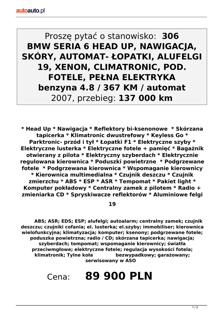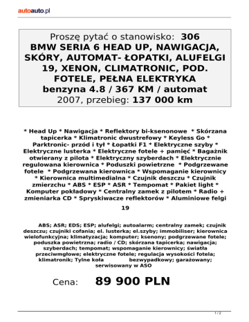 Proszę pytać o stanowisko: 306 BMW SERIA 6 HEAD UP, NAWIGACJA, SKÓRY, AUTOMAT- ŁOPATKI, ALUFELGI 19, XENON, CLIMATRONIC, POD. FOTELE, PEŁNA ELEKTRYKA benzyna 4.8 / 367 KM / automat 2007, przebieg: 137 000 km * Head Up * Nawigacja * Reflektory bi-ksenonowe * Skórzana tapicerka * Klimatronic dwustrefowy * Keyless Go * Parktronic- przód i tył * Łopatki F1 * Elektryczne szyby * Elektryczne lusterka * Elektryczne fotele + pamięć * Bagażnik otwierany z pilota * Elektryczny szyberdach * Elektrycznie regulowana kierownica * Poduszki powietrzne * Podgrzewane fotele * Podgrzewana kierownica * Wspomaganie kierownicy * Kierownica multimedialna * Czujnik deszczu * Czujnik zmierzchu * ABS * ESP * ASR * Tempomat * Pakiet light * Komputer pokładowy * Centralny zamek z pilotem * Radio + zmieniarka CD * Spryskiwacze reflektorów * Aluminiowe felgi 19 ABS; ASR; EDS; ESP; alufelgi; autoalarm; centralny zamek; czujnik deszczu; czujniki cofania; el. lusterka; el.szyby; immobiliser; kierownica wielofunkcyjna; klimatyzacja; komputer; ksenony; podgrzewane fotele; poduszka powietrzna; radio / CD; skórzana tapicerka; nawigacja; szyberdach; tempomat; wspomaganie kierownicy; światła przeciwmgłowe; elektryczne fotele; regulacja wysokości fotela; klimatronik; Tylne koła bezwypadkowy; garażowany; serwisowany w ASO Cena: 89 900 PLN 1/2 brutto Opiekun: Piotr Murawski +48 519 022 420 Al. Krakowska 178, Punkt A 2/2