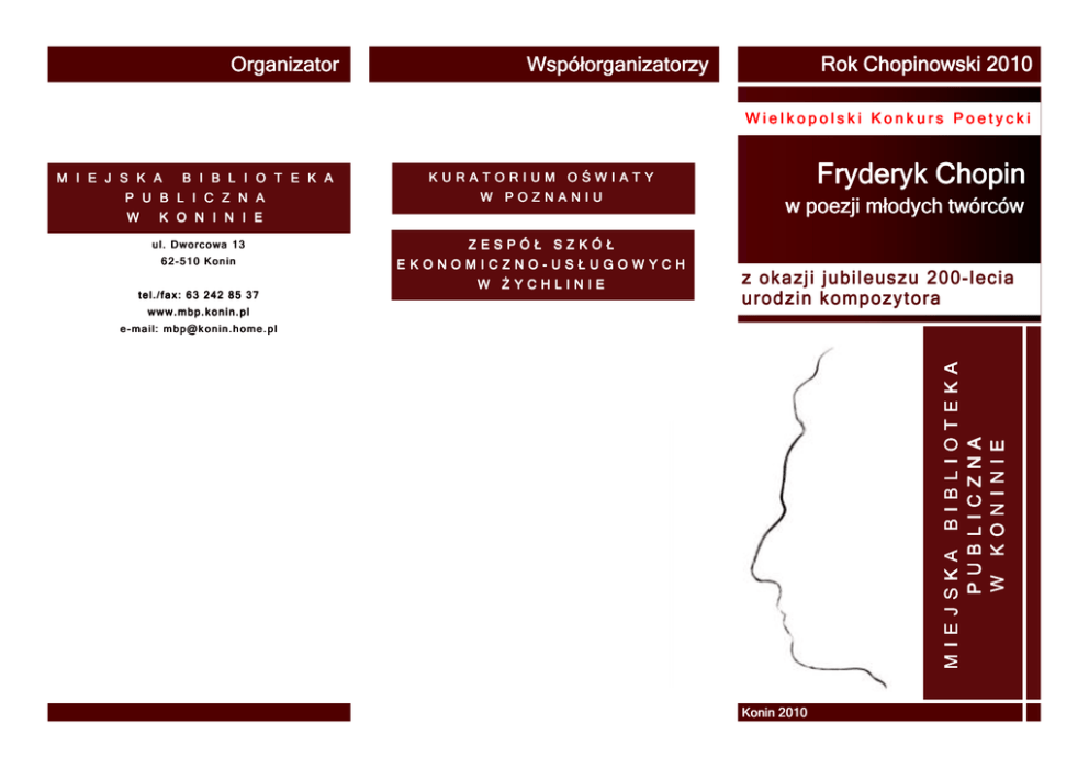 Organizator Rok Chopinowski 2010 Współorganizatorzy Wielkopolski Konkurs Poetycki M I E J S K A B I B L I O T E K A P U B L I C Z N A W W POZNANIU K O N I N I E u l . Dw o rc o wa 1 3 ZESPÓŁ SZKÓŁ 62-510 Konin EKONOMICZNO-USŁUGOWYCH tel./fax: 63 242 85 37 w w w. m b p . k o n i n . p l Fryderyk Chopin KURATORIUM OŚWIATY W ŻYCHLINIE w poezji młodych twórców z okazji jubileuszu 200 - lecia urodzin kompozytora MIEJSKA BIBLIOTEKA PUBLICZNA W KONINIE e - m a i l: m b p @ k o n i n . h o m e . p l Konin 2010 Regulamin Wielkopolskiego Konkursu Poetyckiego „Fryderyk Chopin w poezji młodych twórców” Cele konkursu: • • Zainteresowanie życiem i twórczością Fryderyka Chopina inspiracja i popularyzacja twórczości poetyckiej • promowanie młodych twórców • stworzenie możliwości wydania najlepszych prac w zbiorze poetyckim Zasady: Do udziału w konkursie zapraszamy młodzież szkół podstawowych (klasy V i VI), gimnazjów i szkół ponadgimnazjalnych Wielkopolski. Warunkiem uczestnictwa w konkursie jest nadesłanie wierszy (max. 3) w formie maszynopisu oraz w formie pliku tekstowego w formacie doc lub rtf. Wiersze wraz z własnoręcznie podpisaną kartą zgłoszenia (stanowiącą załącznik do regulaminu) należy przesłać do dnia 30 czerwca 2010 na adres: Miejska Biblioteka Publiczna w Koninie ul. Dworcowa 13 6262 -510 Konin z dopiskiem Chopin. Chopin. Organizator nie zwraca nadesłanych prac. Powołane przez Organizatora Jury dokona oceny prac do 15 sierpnia 2010. O g ł o s z e n i e wy n i k ó w: Ogłoszenie wyników konkursu, wręczenie nagród i spotkanie z jurorami nastąpi we wrześniu 2010 o czym laureaci zostaną powiadomieni indywidualnie i zaproszeni na uroczystość wręczenia nagród. Na zwycięzców czekają atrakcyjne nagrody. Organizator nie pokrywa kosztów przyjazdu na uroczystość wręczenia nagród. Nagrodzone, wyróżnione i zauważone wiersze zostaną wydane w okolicznościowym tomiku. Informacje o konkursie dostępne na stronie: www.mbp.konin.pl .