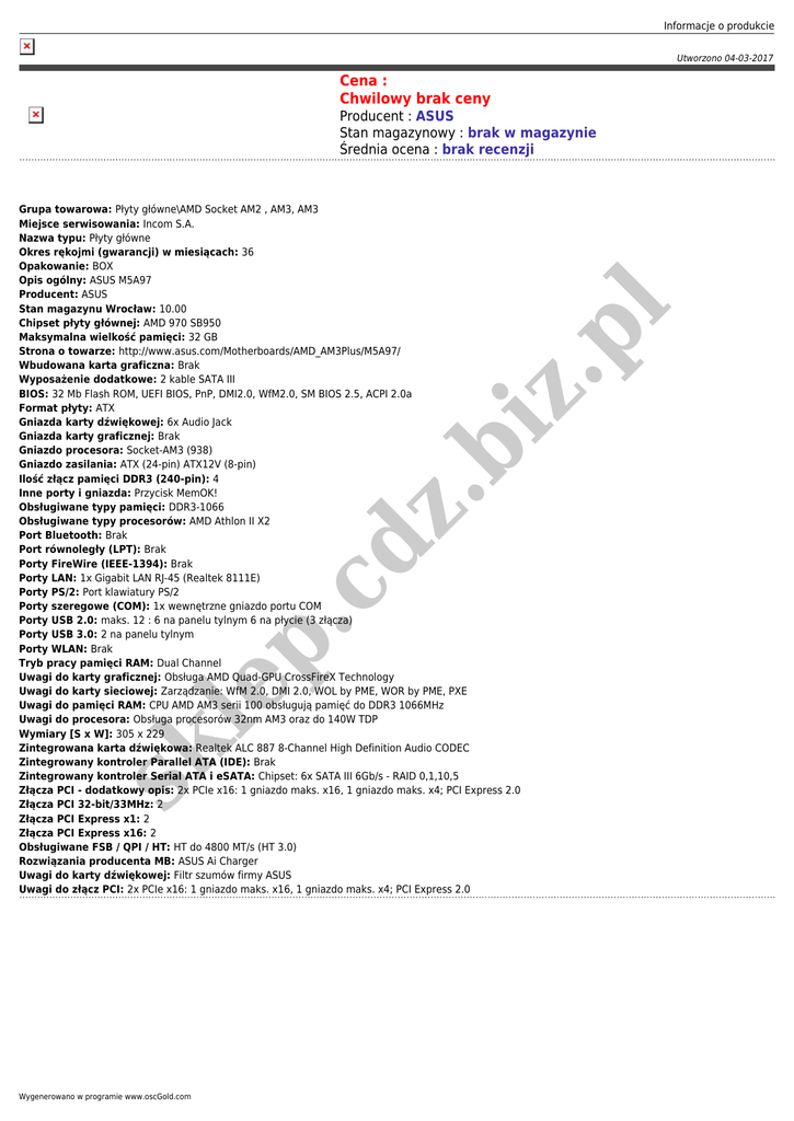 Informacje o produkcie Utworzono 04-03-2017 Cena : Chwilowy brak ceny sk le p .c dz .b iz .p Grupa towarowa: Płyty główne\AMD Socket AM2 , AM3, AM3 Miejsce serwisowania: Incom S.A. Nazwa typu: Płyty główne Okres rękojmi (gwarancji) w miesiącach: 36 Opakowanie: BOX Opis ogólny: ASUS M5A97 Producent: ASUS Stan magazynu Wrocław: 10.00 Chipset płyty głównej: AMD 970 SB950 Maksymalna wielkość pamięci: 32 GB Strona o towarze: http://www.asus.com/Motherboards/AMD_AM3Plus/M5A97/ Wbudowana karta graficzna: Brak Wyposażenie dodatkowe: 2 kable SATA III BIOS: 32 Mb Flash ROM, UEFI BIOS, PnP, DMI2.0, WfM2.0, SM BIOS 2.5, ACPI 2.0a Format płyty: ATX Gniazda karty dźwiękowej: 6x Audio Jack Gniazda karty graficznej: Brak Gniazdo procesora: Socket-AM3 (938) Gniazdo zasilania: ATX (24-pin) ATX12V (8-pin) Ilość złącz pamięci DDR3 (240-pin): 4 Inne porty i gniazda: Przycisk MemOK! Obsługiwane typy pamięci: DDR3-1066 Obsługiwane typy procesorów: AMD Athlon II X2 Port Bluetooth: Brak Port równoległy (LPT): Brak Porty FireWire (IEEE-1394): Brak Porty LAN: 1x Gigabit LAN RJ-45 (Realtek 8111E) Porty PS/2: Port klawiatury PS/2 Porty szeregowe (COM): 1x wewnętrzne gniazdo portu COM Porty USB 2.0: maks. 12 : 6 na panelu tylnym 6 na płycie (3 złącza) Porty USB 3.0: 2 na panelu tylnym Porty WLAN: Brak Tryb pracy pamięci RAM: Dual Channel Uwagi do karty graficznej: Obsługa AMD Quad-GPU CrossFireX Technology Uwagi do karty sieciowej: Zarządzanie: WfM 2.0, DMI 2.0, WOL by PME, WOR by PME, PXE Uwagi do pamięci RAM: CPU AMD AM3 serii 100 obsługują pamięć do DDR3 1066MHz Uwagi do procesora: Obsługa procesorów 32nm AM3 oraz do 140W TDP Wymiary [S x W]: 305 x 229 Zintegrowana karta dźwiękowa: Realtek ALC 887 8-Channel High Definition Audio CODEC Zintegrowany kontroler Parallel ATA (IDE): Brak Zintegrowany kontroler Serial ATA i eSATA: Chipset: 6x SATA III 6Gb/s - RAID 0,1,10,5 Złącza PCI - dodatkowy opis: 2x PCIe x16: 1 gniazdo maks. x16, 1 gniazdo maks. x4; PCI Express 2.0 Złącza PCI 32-bit/33MHz: 2 Złącza PCI Express x1: 2 Złącza PCI Express x16: 2 Obsługiwane FSB / QPI / HT: HT do 4800 MT/s (HT 3.0) Rozwiązania producenta MB: ASUS Ai Charger Uwagi do karty dźwiękowej: Filtr szumów firmy ASUS Uwagi do złącz PCI: 2x PCIe x16: 1 gniazdo maks. x16, 1 gniazdo maks. x4; PCI Express 2.0 l Producent : ASUS Stan magazynowy : brak w magazynie Średnia ocena : brak recenzji Wygenerowano w programie www.oscGold.com