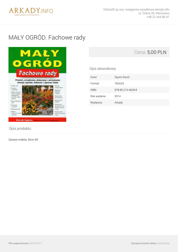 Dobra28 sp zoo. księgarnia wysyłkowa arkady.info ul. Dobra 28, Warszawa +48 22 444 86 97 MAŁY OGRÓD. Fachowe rady Cena: 5,00 PLN Opis słownikowy Autor Squire David Format 18,5x23 ISBN 978-83-213-4629-8 Rok wydania 2014 Wydawca Arkady Opis produktu Oprawa miękka, Stron 80 Plik wygenerowano: 04-03-2017 Powered by TCPDF (www.tcpdf.org) Oprogramowanie sklepu: AptusShop