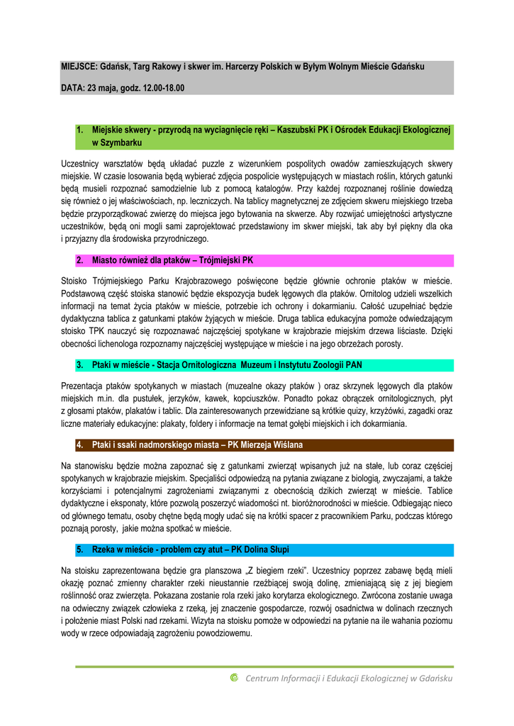 MIEJSCE: Gdańsk, Targ Rakowy i skwer im. Harcerzy Polskich w Byłym Wolnym Mieście Gdańsku DATA: 23 maja, godz. 12.00-18.00 1. Miejskie skwery - przyrodą na wyciagnięcie ręki – Kaszubski PK i Ośrodek Edukacji Ekologicznej w Szymbarku Uczestnicy warsztatów będą układać puzzle z wizerunkiem pospolitych owadów zamieszkujących skwery miejskie. W czasie losowania będą wybierać zdjęcia pospolicie występujących w miastach roślin, których gatunki będą musieli rozpoznać samodzielnie lub z pomocą katalogów. Przy każdej rozpoznanej roślinie dowiedzą się również o jej właściwościach, np. leczniczych. Na tablicy magnetycznej ze zdjęciem skweru miejskiego trzeba będzie przyporządkować zwierzę do miejsca jego bytowania na skwerze. Aby rozwijać umiejętności artystyczne uczestników, będą oni mogli sami zaprojektować przedstawiony im skwer miejski, tak aby był piękny dla oka i przyjazny dla środowiska przyrodniczego. 2. Miasto również dla ptaków – Trójmiejski PK Stoisko Trójmiejskiego Parku Krajobrazowego poświęcone będzie głównie ochronie ptaków w mieście. Podstawową część stoiska stanowić będzie ekspozycja budek lęgowych dla ptaków. Ornitolog udzieli wszelkich informacji na temat życia ptaków w mieście, potrzebie ich ochrony i dokarmianiu. Całość uzupełniać będzie dydaktyczna tablica z gatunkami ptaków żyjących w mieście. Druga tablica edukacyjna pomoże odwiedzającym stoisko TPK nauczyć się rozpoznawać najczęściej spotykane w krajobrazie miejskim drzewa liściaste. Dzięki obecności lichenologa rozpoznamy najczęściej występujące w mieście i na jego obrzeżach porosty. 3. Ptaki w mieście - Stacja Ornitologiczna Muzeum i Instytutu Zoologii PAN Prezentacja ptaków spotykanych w miastach (muzealne okazy ptaków ) oraz skrzynek lęgowych dla ptaków miejskich m.in. dla pustułek, jerzyków, kawek, kopciuszków. Ponadto pokaz obrączek ornitologicznych, płyt z głosami ptaków, plakatów i tablic. Dla zainteresowanych przewidziane są krótkie quizy, krzyżówki, zagadki oraz liczne materiały edukacyjne: plakaty, foldery i informacje na temat gołębi miejskich i ich dokarmiania. 4. Ptaki i ssaki nadmorskiego miasta – PK Mierzeja Wiślana Na stanowisku będzie można zapoznać się z gatunkami zwierząt wpisanych już na stałe, lub coraz częściej spotykanych w krajobrazie miejskim. Specjaliści odpowiedzą na pytania związane z biologią, zwyczajami, a także korzyściami i potencjalnymi zagrożeniami związanymi z obecnością dzikich zwierząt w mieście. Tablice dydaktyczne i eksponaty, które pozwolą poszerzyć wiadomości nt. bioróżnorodności w mieście. Odbiegając nieco od głównego tematu, osoby chętne będą mogły udać się na krótki spacer z pracownikiem Parku, podczas którego poznają porosty, jakie można spotkać w mieście. 5. Rzeka w mieście - problem czy atut – PK Dolina Słupi Na stoisku zaprezentowana będzie gra planszowa „Z biegiem rzeki”. Uczestnicy poprzez zabawę będą mieli okazję poznać zmienny charakter rzeki nieustannie rzeźbiącej swoją dolinę, zmieniającą się z jej biegiem roślinność oraz zwierzęta. Pokazana zostanie rola rzeki jako korytarza ekologicznego. Zwrócona zostanie uwaga na odwieczny związek człowieka z rzeką, jej znaczenie gospodarcze, rozwój osadnictwa w dolinach rzecznych i położenie miast Polski nad rzekami. Wizyta na stoisku pomoże w odpowiedzi na pytanie na ile wahania poziomu wody w rzece odpowiadają zagrożeniu powodziowemu. Centrum Informacji i Edukacji Ekologicznej w Gdańsku 6. Zielona Szkoła Krajobrazu - Zespół Szkół Architektury Krajobrazu i Handlowo-Usługowych Zielona przestrzeń może powstać wszędzie. Zaprośmy przyrodę do naszych miast! Niech ogrody wyrosną na niewielkiej przestrzeni: parapecie, balkonie, przed wejściem do domu. Pokażemy jak prosto a zarazem ciekawie można zaaranżować zielony kącik. Dla koneserów będą porady dotyczące kształtowania ogrodów ekologicznych, w których natura i człowiek są we wzajemnej harmonii. Zapraszamy! 7. Słonecznik na każdym balkonie – warsztaty ogrodnicze – Pracownia pod Błękitnym Drzewem Każdy balkon może być "morzem zieleni", przystanią dla zmęczonych oczu i małym ogrodem. Zapraszamy do posiania pierwszego ziarnka słonecznika, który zasadzimy na balkonie. Spróbujemy swoich sił w rozpoznawaniu sadzonek znanych warzyw. Zachęcimy do zaplanowania zieleni czy mini ogrodu na własnym balkonie. 8. Ujście Wisły. Ścieżki natury - Grupa Badawcza Ptaków Wodnych KULING Rezerwat przyrody „Mewia Łacha” to perła polskiego wybrzeża, jeden z najbardziej unikatowych i urokliwych zakątków Polski i Europy, ostoja ptaków o randze europejskiej. Jest przykładem tego jak człowiek i przyroda mogą współistnieć dzięki sobie nawzajem. Znajduje się na wschodnich rubieżach Gdańska i nie miałby racji bytu, gdyby nie wykonanie Przekopu Wisły w 1895 r. Od tego czasu niesione z prądem osady rzeczne oraz działalność wiatru i fal morskich kształtują malownicze łachy i wyspy tzw. stożka ujściowego Wisły. Stały się one obecnie lęgowiskiem dla jedynej w Polsce kolonii rybitw czubatych i wielu innych cennych gatunków, np. ostrygojada, sieweczki obrożnej, czy rybitwy białoczelnej. Rezerwat stanowi również miejsce odpoczynku i żerowisko dla wielu ptaków podczas migracji. Regularnie występują tu też foki szare, a niekiedy i rzadsze gatunki: pospolita i obrączkowana. Obecnie największym zagrożeniem tego przyrodniczego eldorado jest to, co przyczyniło się do jego powstania – ludzka aktywność. 9. Zielone łamigłówki - Naukowe Studenckie Koło Botaniczne "Zioło" Czy wiesz jakie gatunki drzew można spotkać w mieście? Chcesz się dowiedzieć jak je rozpoznawać? Co może być pomnikiem przyrody i jak złożyć wniosek o jego powołanie? Zapraszamy na warsztaty o drzewach w przestrzeni miejskiej, na których każ