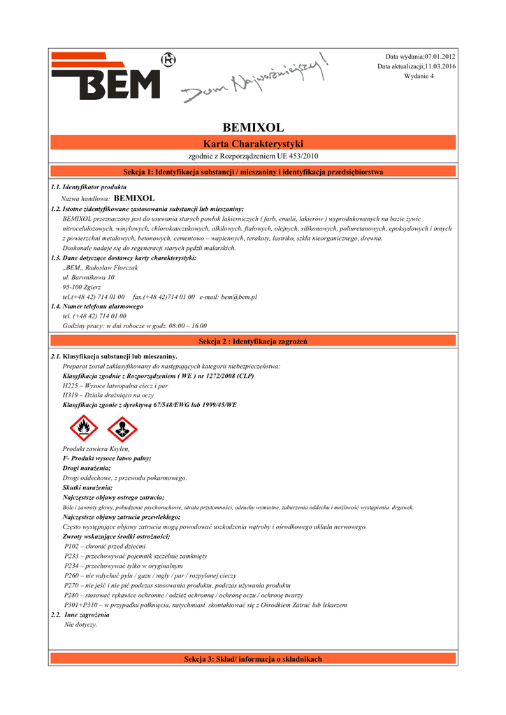 Data wydania;07.01.2012 Data aktualizacji;11.03.2016 Wydanie 4 BEMIXOL Karta Charakterystyki zgodnie z Rozporządzeniem UE 453/2010 Sekcja 1: Identyfikacja substancji / mieszaniny i identyfikacja przedsiębiorstwa 1.1. Identyfikator produktu Nazwa handlowa: BEMIXOL 1.2. Istotne zidentyfikowane zastosowania substancji lub mieszaniny; BEMIXOL przeznaczony jest do usuwania starych powłok lakierniczych ( farb, emalii, lakierów ) wyprodukowanych na bazie żywic nitrocelulozowych, winylowych, chlorokauczukowych, alkilowych, ftalowych, olejnych, silikonowych, poliuretanowych, epoksydowych i innych z powierzchni metalowych, betonowych, cementowo – wapiennych, terakoty, lastriko, szkła nieorganicznego, drewna. Doskonale nadaje się do regeneracji starych pędzli malarskich. 1.3. Dane dotyczące dostawcy karty charakterystyki: ,,BEM,, Radosław Florczak ul. Barwnikowa 10 95-100 Zgierz tel.(+48 42) 714 01 00 fax.(+48 42)714 01 00 e-mail: [email protected] 1.4. Numer telefonu alarmowego tel. (+48 42) 714 01 00 Godziny pracy: w dni robocze w godz. 08:00 – 16.00 Sekcja 2 : Identyfikacja zagrożeń 2.1. Klasyfikacja substancji lub mieszaniny. Preparat został zaklasyfikowany do następujących kategorii niebezpieczeństwa: Klasyfikacja zgodnie z Rozporządzeniem ( WE ) nr 1272/2008 (CLP) H225 – Wysoce łatwopalna ciecz i par H319 – Działa drażniąco na oczy Klasyfikacja zgonie z dyrektywą 67/548/EWG lub 1999/45/WE Produkt zawiera Ksylen, F- Produkt wysoce łatwo palny; Drogi narażenia; Drogi oddechowe, z przewodu pokarmowego. Skutki narażenia; Najczęstsze objawy ostrego zatrucia; Bóle i zawroty głowy, pobudzenie psychoruchowe, utrata przytomności, odruchy wymiotne, zaburzenia oddechu i możliwość wystąpienia drgawek. Najczęstsze objawy zatrucia przewlekłego; Często występujące objawy zatrucia mogą powodować uszkodzenia wątroby i ośrodkowego układu nerwowego. Zwroty wskazujące środki ostrożności; P102 – chronić przed dziećmi P233 – przechowywać pojemnik szczelnie zamknięty P234 – przechowywać tylko w oryginalnym P260 – nie wdychać pyłu / gazu / mgły / par / rozpylonej cieczy P270 – nie jeść i nie pić podczas stosowania produktu, podczas używania produktu P280 – stosować rękawice ochronne / odzież ochronną / ochronę oczu / ochronę twarzy P301+P310 – w przypadku połknięcia, natychmiast skontaktować się z Ośrodkiem Zatruć lub lekarzem 2.2. Inne zagrożenia Nie dotyczy. Sekcja 3: Skład/ informacja o składnikach 3.1. Substancje Składniki stwarzające zagrożenia; Zawartość wagowa w% ( lub przedział ) Numer CAS Numer WE Izopropanol 4-10% 67-63-0 200-661-7 H225, H319, H315 Aceton 2-8% 67-64-1 200-662-2 H225, H319, H315 Methylal 30-40% 109-87-5 203-714-2 H225, H319, H315 Nazwa identyfikująca Klasyfikacja Symbol kategorii niebezpieczeństwa Sekcja 4 : Środki pierwszej pomocy 4.1. Opis środków pierwszej pomocy; - po narażeniu przez drogi oddechowe osobę poszkodowaną wyprowadzić z miejsca narażenia, zapewnić ciepło i spokój, wezwać pomoc medyczną. - po kontakcie ze skórą poszkodowanego wyprowadzić z miejsca narażenia. Zdjąć skażoną odzież i obuwie. Spłukać skórę dużą ilością bieżącej wody z mydłem. Przy zmianach skórnych wezwać pomoc medyczną. - po kontakcie z oczami niezwłocznie płukać oczy dużą ilości chłodnej bieżącej wody przy podwiniętych powiekach przez co najmniej 15 minut. Usunąć szkła kontaktowe o ile nie przywarły do oczu. Zapewnić pomoc okulistyczna - po narażeniu przez przewód pokarmowy Nie prowokować poszkodowanego do wymiotów nie podawać mleka oraz tłuszczów. W razie duszności podawać tlen. W każdym przypadku połknięcia, konieczny jest transport karetką pogotowia do szpitala. Pokazywać opakowanie lub etykietę produktu. - uwagi We wszystkich przypadkach pojawienia się niepokojących objawów lub jakichkolwiek wątpliwości, należy zasięgnąć porady lekarza. - uwagi dla lekarza Odtrutki nie są znane. Sekcja 5 : Postępowanie w przypadku pożaru Zawiadomić otoczenie o pożarze. Usunąć z obszaru zagrożenia wszelkie osoby nie biorące udziału w likwidowaniu awarii. Wezwać Państwową Straż Pożarną – 998 i Policję – 997. Opary strącać rozproszonymi strumieniami wody. 5.1. Środki gaśnicze Odpowiednie środki gaśnicze; Proszki gaśnicze, tlenek węgla (gaśnice śniegowe), piasek, piana, woda – strumienie rozproszone. Środki właściwe dla palącego się w sąsiedztwie materiału. Nieodpowiednie środki gaśnicze Nie stosować zwartych strumieni wody na powierzchnię palącego się produktu 5.2. Szczególne zagrożenia związane z substancją lub mieszaniną Zbiorniki narażone na działanie ognia i wysokiej temperatury chłodzić strumieniem wody z bezpiecznej odległości 5.3. Informacja dla straży pożarnej Odzież ochronna gazoszczelna z aparatem izolującym drogi oddechowe. W temperaturze około 120ºC może powstawać gazowy chlorowodór Sekcja 6 : Postępowanie w przypadku niezamierzonego uwolnienia do środowiska Zawiadomić otoczenie o wycieku. Ewakuować z obszaru zagrożenia osoby postronne. Awaria musi być jak najszybciej zlokalizowana i zlikwidowana. Wezwać Straż Pożarną i Policję. 6.1. Indywidualne środki ostrożności, wyposażenie ochronne i procedury w sytuacjach awaryjnych. Unikać bezpośredniego kontaktu z produktem. Stosować odzież ochronną, rękawice, obuwie, aparat izolujący drogi oddechowe. Usunąć źródła zapłonu – nie palić nie używać otwartego ognia, nie używać narzędzi iskrzących ( produkt łatwopalny ) 6.2. Środki ostrożności w zakresie ochrony środowiska Nie dopuszczać do przedostania się produktu do kanalizacji, wód powierzchniowych, wód gruntowych - zabezpieczyć studzienki kanalizacyjne 6.3. Metody i materiały zapobiegające rozprzestrzenianiu się skażenia i służące do usuwania skażenia. Zapobieganie rozprzestrzenianiu się skażenia: o ile to możliwe, zlikwidowa