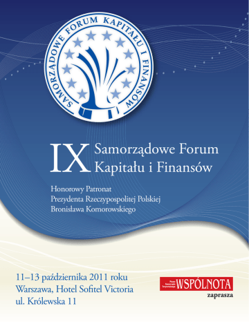 IX Samorządowe Forum Kapitału i Finansów Honorowy Patronat Prezydenta Rzeczypospolitej Polskiej Bronisława Komorowskiego 11–13 października 2011 roku Warszawa, Hotel Sofitel Victoria ul. Królewska 11 zaprasza Samorządowe Forum Kapitału i Finansów jest imprezą gromadzącą rokrocznie kilkuset uczestników – prezydentów, burmistrzów, wójtów, starostów, skarbników, przedstawicieli rządu i ważnych instytucji finansowych. Dzięki udziałowi specjalistów – wybitnych ekonomistów Forum jest imprezą, która podnosi poziom wiedzy ekonomicznej wśród samorządowych przedstawicieli administracji publicznej w Polsce. W tegorocznej edycji Forum w wykładach, debatach i dyskusjach podejmiemy następujące wątki: – urealnienie oczekiwań samorządów w warunkach globalnego kryzysu finansów publicznych; – poszukiwanie dodatkowych źródeł finansowania w istniejących – często nieracjonalnych – ulgach i zwolnieniach podatkowych, zarówno ustawowych, jak i lokalnych; – uruchomienie drzemiącego kapitału społecznego jak i bardziej ofensywne wykorzystanie instrumentów uruchamiających kapitał zamrożony w majątku samorządów; – skupienie się na szansach, które daje wykorzystanie środków europejskich. Także tych, które dotyczą następnej perspektywy budżetowej Unii; – lepsze wykorzystanie instytucji oraz narzędzi lobbingowych, które są w rękach samorządu. Integralną częścią Forum jest Kongres Skarbników Polskich Samorządów, którego tegoroczny program zawiera następujące tematy: – Kompleksowa kontrola gospodarki finansowej JST – nowy ramowy zakres kontroli i nowe wytyczne przyjęte przez Krajową Radę RIO. – Realność i użyteczność wieloletniej prognozy finansowej. – Ile samorządy dopłacają do zadań oświatowych? – Konsolidacja zamówień publicznych. – Transport publiczny i sieci szerokopasmowe. – Organizacja nowego systemu gospodarki odpadami. – Nowe zasady procedury absolutoryjnej za 2010 r. – błędy i uchybienia w ocenie RIO. Forum to: ● blisko 300 gości – przedstawicieli władz lokalnych i państwowych oraz ważnych instytucji finansowych ● współpraca największych samorządowych instytucji w kraju ● wybitni eksperci i politycy Wydarzenia specjalne: – rankingi tygodnika WSPÓLNOTA W najważniejszym z nich – rankingu wydatków na budowę infrastruktury technicznej – honorujemy samorządy statuetkami im. Kazimierza Wielkiego i dyplomami. Uznajemy ten ranking za najważniejszy, ponieważ to te wydatki tworzą warunki do rozwoju gospodarczego Polski oraz podnoszą jakość życia mieszkańców naszego kraju. Ponadto w kolejnych latach publikowane są różne rankingi samorządów w zależności od zmieniającego się kontekstu sytuacji ekonomicznej. W roku bieżącym opublikujemy ranking zadłużenia wraz z nadwyżką operacyjną obliczoną dla każdego z samorządów, bowiem to jest dzisiaj przedmiotem gorącego sporu, którego stawką jest z jednej strony rozwój cywilizacyjny, z drugiej zaś konstytucyjna granica długu publicznego. Rankingi tygodnika WSPÓLNOTA opracowywane są przez Pawła Swianiewicza, profesora Uniwersytetu Warszawskiego, na podstawie obiektywnych danych Głównego Urzędu Statystycznego oraz danych Ministerstwa Finansów. Nie ma w nich więc żadnej uznaniowości ani niejasnych reguł. Mimo prostoty zastosowanych algorytmów są one jednak wiarygodną i wyczekiwaną przez samorządy informacją dotyczącą ich kondycji oraz osiągnięć. – spotkanie z bohaterami filmu oraz projekcja „Zdarzyło się tylko w Polsce” Film jest opowieścią o najważniejszym czynniku przemiany ustrojowej w Polsce, jakim była likwidacja monopolu władzy centralnej, o powstaniu i umocnieniu się samorządu lokalnego, o tym jak idea zrodzona w umysłach kilku ludzi doczekała się swej realizacji. Jest to również zapis przemiany mentalności społecznej, która musiała nastąpić, żeby decentralizacja władzy stała się możliwa.Wiodącymi narratorami są profesorowie Michał Kulesza, Jerzy Regulski i sędzia Jerzy Stępień. (za: http://www.frdl.org.pl/main/film_Zdarzylo_sie_w_Polsce.htm) Naszym Partnerom Medialnym oferujemy: – nadanie tytułu Partner Medialny Forum, – akredytację uzgodnionej liczby dziennikarzy Partnera, – ekspozycję logo Partnera na płaszczyznach promocyjnych Forum, – umieszczenie informacji o Partnerze na stronie internetowej poświęconej Forum, – ekspozycję baneru Partnera w pomieszczeniach, w których będzie odbywało się Forum, – możliwość dystrybucji materiałów promocyjnych Partnera w teczkach przekazywanych uczestnikom Forum. Organizator: Pismo Samorządu Terytorialnego WSPÓLNOTA od ponad 20 lat towarzyszy samorządom w ich przedsięwzięciach. O kilka tygodni wyprzedziło ich restytucję w Polsce w 1990 roku i uczestniczyło we wszystkich przemianach ustrojowych administracji terytorialnej. Dzisiaj pozostaje liderem rynku samorządowego. Stąd też większość inicjatyw podejmowanych przez naszą redakcję jest żywo i z szacunkiem podejmowana przez środowisko samorządowe. Mamy nadzieję, że tę rolę będziemy wypełniali nadal, służąc instytucjom samorządowym oraz interesowi publicznemu naszego kraju. Organizator MUNICIPIUM SA, ul. Uprawna 3, 02-967 Warszawa Kontakt Michał Sierpiński tel. (22) 242 80 24, [email protected] Monika Bukowska tel. (22) 242 80 18, [email protected] www.samorzadoweforum.pl patronat środowiskowy UNIA MIASTECZEK POLSKICH wspierają nas