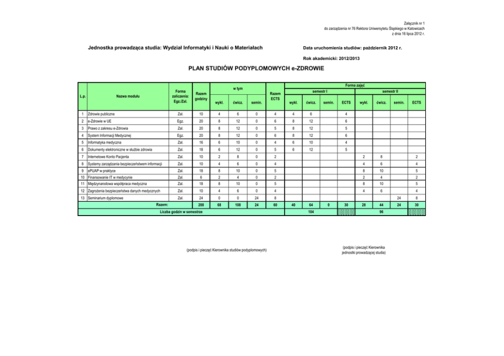 Załącznik nr 1 do zarządzenia nr 76 Rektora Uniwersytetu Śląskiego w Katowicach z dnia 16 lipca 2012 r. Jednostka prowadząca studia: Wydział Informatyki i Nauki o Materiałach Data uruchomienia studiów: październik 2012 r. Rok akademicki: 2012/2013 PLAN STUDIÓW PODYPLOMOWYCH e-ZDROWIE L.p. Nazwa modułu Forma zajęć w tym Forma zaliczenia: Egz./Zal. Razem godziny wykł. ćwicz. semin. Razem ECTS semestr I wykł. ćwicz. semestr II semin. ECTS wykł. ćwicz. semin. ECTS 1 Zdrowie publiczne Zal. 10 4 6 0 4 4 6 4 2 e-Zdrowie w UE Egz. 20 8 12 0 6 8 12 6 3 Prawo z zakresu e-Zdrowia Zal. 20 8 12 0 5 8 12 5 4 System Informacji Medycznej Egz. 20 8 12 0 6 8 12 6 5 Informatyka medyczna Zal. 16 6 10 0 4 6 10 4 6 Dokumenty elektroniczne w służbie zdrowia Zal. 18 6 12 0 5 6 12 5 7 Internetowe Konto Pacjenta Zal. 10 2 8 0 2 2 8 2 8 Systemy zarządzania bezpieczeństwem informacji Zal. 10 4 6 0 4 4 6 4 9 ePUAP w praktyce Zal. 18 8 10 0 5 8 10 5 10 Finansowanie IT w medycynie Zal. 6 2 4 0 2 2 4 2 11 Międzynarodowa współpraca medyczna Zal. 18 8 10 0 5 8 10 5 12 Zagrożenia bezpieczeństwa danych medycznych Zal. 10 4 6 0 4 4 6 13 Seminarium dyplomowe Zal. 24 0 0 24 8 200 68 108 24 60 Razem: Liczba godzin w semestrze (podpis i pieczęć Kierownika studiów podyplomowych) 40 64 104 0 30 28 44 96 (podpis i pieczęć Kierownika jednostki prowadzącej studia) 4 24 8 24 30