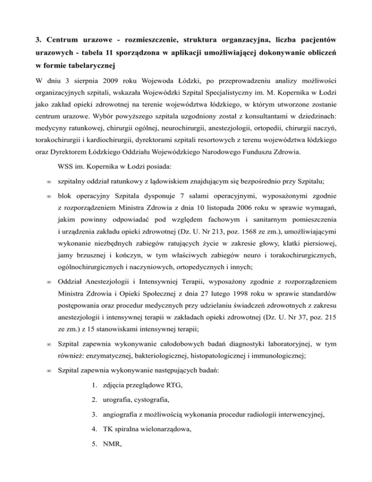 3. Centrum urazowe - rozmieszczenie, struktura organzacyjna, liczba pacjentów urazowych - tabela 11 sporządzona w aplikacji umożliwiającej dokonywanie obliczeń w formie tabelarycznej W dniu 3 sierpnia 2009 roku Wojewoda Łódzki, po przeprowadzeniu analizy możliwości organizacyjnych szpitali, wskazała Wojewódzki Szpital Specjalistyczny im. M. Kopernika w Łodzi jako zakład opieki zdrowotnej na terenie województwa łódzkiego, w którym utworzone zostanie centrum urazowe. Wybór powyższego szpitala uzgodniony został z konsultantami w dziedzinach: medycyny ratunkowej, chirurgii ogólnej, neurochirurgii, anestezjologii, ortopedii, chirurgii naczyń, torakochirurgii i kardiochirurgii, dyrektorami szpitali resortowych z terenu województwa łódzkiego oraz Dyrektorem Łódzkiego Oddziału Wojewódzkiego Narodowego Funduszu Zdrowia. WSS im. Kopernika w Łodzi posiada: • szpitalny oddział ratunkowy z lądowiskiem znajdującym się bezpośrednio przy Szpitalu; • blok operacyjny Szpitala dysponuje 7 salami operacyjnymi, wyposażonymi zgodnie z rozporządzeniem Ministra Zdrowia z dnia 10 listopada 2006 roku w sprawie wymagań, jakim powinny odpowiadać pod względem fachowym i sanitarnym pomieszczenia i urządzenia zakładu opieki zdrowotnej (Dz. U. Nr 213, poz. 1568 ze zm.), umożliwiającymi wykonanie niezbędnych zabiegów ratujących życie w zakresie głowy, klatki piersiowej, jamy brzusznej i kończyn, w tym właściwych zabiegów neuro i torakochirurgicznych, ogólnochirurgicznych i naczyniowych, ortopedycznych i innych; • Oddział Anestezjologii i Intensywniej Terapii, wyposażony zgodnie z rozporządzeniem Ministra Zdrowia i Opieki Społecznej z dnia 27 lutego 1998 roku w sprawie standardów postępowania oraz procedur medycznych przy udzielaniu świadczeń zdrowotnych z zakresu anestezjologii i intensywnej terapii w zakładach opieki zdrowotnej (Dz. U. Nr 37, poz. 215 ze zm.) z 15 stanowiskami intensywnej terapii; • Szpital zapewnia wykonywanie całodobowych badań diagnostyki laboratoryjnej, w tym również: enzymatycznej, bakteriologicznej, histopatologicznej i immunologicznej; • Szpital zapewnia wykonywanie następujących badań: 1. zdjęcia przeglądowe RTG, 2. urografia, cystografia, 3. angiografia z możliwością wykonania procedur radiologii interwencyjnej, 4. TK spiralna wielonarządowa, 5. NMR, 6. USG stacjonarne, 7. USG mobilne, 8. RTG przewodu pokarmowego z użyciem kontrastu; • Szpital dysponuje m.in. Oddziałami: Chirurgii Ogólnej, Ortopedii i Traumatologii Narządu Ruchu, Chirurgii Naczyniowej, Neurochirurgii, Torakochirurgii, Urologii i Laryngologii. W listopadzie 2010 roku Dyrektor WSS im. M. Kopernika w Łodzi powołał Zespół Urazowy, zgodnie z § 4 rozporządzeniem Ministra Zdrowia z dnia 18 czerwca 2010 roku w sprawie centrum urazowego (Dz. U. Nr 118, poz. 803). TABELA 11 - Centra urazowe – stan na dzień 31 grudnia 2010 r. 1 Lp. 2 4 5 Zakład opieki zdrowotLiczba pacjentów urazoŚredni czas Maksymalny nej, w strukturach które- wych przyjętych do centrum pobytu paczas pobytu go działa centrum urazocjenta urazo- w centrum we wego w centrum 2 3a 3b Nazwa Obywatele RP Cudzoziemcy (kraj pochodzenia) - - Adres 1 3 6 Liczba zgonów pacjentów urazowych 6a 6b Obywatele Cudzoziemcy RP (kraj pochodzenia Wojewódzki Szpital Specjalistyczny im. M. Kopernika w Łodzi, 93-513 Łódź ul. Pabianicka 62 - - - -