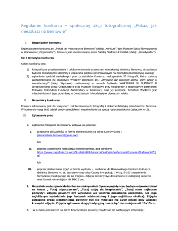 Regulamin konkursu – społecznej akcji fotograficznej „Pokaż, jak mieszkasz na Bemowie” I. Organizator konkursu Organizatorem konkursu pn. „Pokaż jak mieszkasz na Bemowie” (dalej: „Konkurs”) jest Muzeum Sztuki Nowoczesnej w Warszawie („Organizator”). Konkurs jest koordynowany przez Natalię Fiedorczuk Cieślak (dalej: „Koordynator”). Cel i tematyka konkursu Celem Konkursu jest: 1) fotograficzne przedstawienie i udokumentowanie przestrzeni mieszkalnej dzielnicy Bemowo, aktywizacja twórcza mieszkańców dzielnicy i wspieranie postaw zorientowanych na mikrodokumentalistykę lokalną; wyłonienie spośród nadesłanych prac uczestników Konkursu maksymalnie 20 fotografii, które zostaną zaprezentowane na ekspozycji wystawy zbiorowej pn.: „Wreszcie we własnym domu. Dom polski w transformacji” (dalej: Wystawa) realizowanej w ramach festiwalu WARSZAWA W BUDOWIE 8 (organizowanej przez Organizatora oraz Muzeum Warszawy przy współpracy z tegorocznym partnerem festiwalu Instytutem Fundacja Architektury w Krakowie), oraz jej promocji. Tematem Wystawy jest mieszkalnictwo i jego przemiany w dwudziestym i dwudziestym pierwszym wieku. 2) II. Uczestnicy konkursu Konkurs adresowany jest do wszystkich zainteresowanych fotografią i dokumentalistyką mieszkańców Bemowa. W konkursie mogą brać udział osoby pełnoletnie i niepełnoletnie za zgodą rodzica/opiekuna (załącznik nr 2). III. Zgłaszanie prac 1. Zgłoszenie fotografii do konkursu odbywa się poprzez: I. przesłanie pliku/plików w formie elektronicznej na adres Koordynatora : [email protected] lub II. poprzez wypełnienie formularza elektronicznego, pod adresem: https://www.cognitoforms.com/StudioImAMickiewicza/JakŻyjeszNaBemowieFormuiarzDodawaniaZdj ęć lub III. 2. 3. poprzez dostarczenie zdjęć w formie wydruku – osobiście, do Bemowskiego Centrum Kultury w dzielnicy Bemowo m. st. Warszawy przy ulicy Czumy 8 w pokoju 144 (g. 8-16) i wypełnienie formularza znajdującego się na miejscu. Zdjęcia powinny być dostarczone w zaklejonej kopercie i mieć format nie mniejszy niż 10x15 cm. Uczestnik może zgłosić do konkursu maksymalnie 3 prace pojedyncze, będące odpowiedziami na temat „ Tutaj odpoczywam”, „Tutaj czuję się bezpiecznie”, „Tutaj mam najlepsze pomysły”. Zdjęcia powinny być wykonane we wnętrzu mieszkania uczestnika, lub jego najbliższym sąsiedztwie (np. budynek wielorodzinny i jego najbliższa okolica). Zdjęcia zgłoszone drogą elektroniczną powinny być nie mniejsze niż 1000 pikseli przy węższej krawędzi zdjęcia. Zdjęcia zgłoszone drogą tradycyjną muszą być nie mniejsze niż 10x15 cm. W e-mailu przesłanym na adres Koordynatora powinny znajdować się następujące informacje: A. numer telefonu, adres e-mail, B. Tytuł bądź opis zdjęcia, nie dłuższy niż 1000 znaków (ok. pół strony znormalizowanego maszynopisu). C. Dopuszczalne formaty fotografii: JPG, TIFF, PNG D. plik JPG/TIFF/PNG podpisany ma być adresem mailowym z kolejnym numerem fotografii np. [email protected]_1, [email protected]_2, a nie numerem nadanym przez aparat fotograficzny E. nazwę ulicy, przy której znajduje się fotografowane mieszkanie i datę w formie miesiąca i roku, w którym została wykonana (fotografie mogą być archiwalne) Oświadczenie o wyrażeniu zgody na ujawnienie autorstwa zdjęcia/braku zgody na ujawnienie autorstwa zdjęcia. Oświadczenie o wyrażeniu zgody na przetwarzanie danych osobowych na cele konkursu. Administratorem danych osobowych jest Muzeum Sztuki Nowoczesnej w Warszawie. F. G. 4. Zgłoszenia prac będą przyjmowane do 15 września 2016r. 5. Obróbka zdjęć przesłanych na konkurs może polegać jedynie na działaniach odpowiadających zabiegom stosowanym w ciemni fotograficznej, polegających na globalnych zmianach - rozjaśnianiu, kontrastowaniu, redukcji koloru. Wszelkie inne zmiany, a zwłaszcza fotomontaż, są niedopuszczalne. 6. Zdjęcie niespełniające wymagań konkursowych zostanie zdyskwalifikowane. 7. Fotografie zgłaszane na Konkurs mogą być wcześniej nagradzane w innych konkursach. 8. Zdjęcia mogą przesyłać tylko ich autorzy. 9. Zgłoszenie fotografii do konkursu jest równoznaczne z wyrażeniem zgody na udział fotografii w wystawie festiwalu WARSZAWA W BUDOWIE 8 pt. „Wreszcie we własnym domu. Dom polski w transformacji” Brak kontaktu zwrotnego z organizatorem po zakwalifikowaniu fotografii do Wystawy oznacza automatyczną zgodę na ekspozycję fotografii bez wynagrodzenia licencyjnego dla autora. 10. Przekazanie prac konkursowych oznacza jednocześnie, że nie będą one zagrażały ani naruszały praw osób trzecich, w szczególności nie będą naruszały ich majątkowych i osobistych praw autorskich, oraz że osoba przekazująca prace konkursowe ma zgody osób, których wizerunki utrwalono na fotografiach, i uprawnienia do wyrażania zgody na wykorzystanie tych wizerunków w zakresie opisanym w punkcie 9 powyżej. W przypadku wystąpienia przez osobę trzecią z roszczeniami wynikającymi z tytułu naruszenia praw określonych powyżej osoba przekazująca zrekompensuje Organizatorowi Wystawy, jako wyłącznie odpowiedzialna, koszty poniesione w związku ze skierowaniem przeciwko niemu roszczeń odszkodowawczych, zwalniając Organizatora Wystawy od wszelkich zobowiązań, jakie powstaną z tego tytułu. IV. Ocena prac i rozstrzygnięcie konkursu 1. Wszystkie zdjęcia nadesłane do Konkursu podlegają ocenie Jury powołanego przez Organizatora w składzie: Natalia Fiedorczuk-Cieślak (Koordynator), Tomasz Fudala lub w zastępstwie Szymon Maliborski (kuratorzy, Muzeum Sztuki Nowoczesnej w Warszawie), Marcin Jasiński (dyrektor Bemowskiego Centrum Kultury). 2. Spośród nadesłanych prac Jury wybierze maksymalnie 20 fotografii, które wezmą udział w Wystawie. 3. Ocena Jury będzie brała pod uwagę zgodność fotografii i opisów z zaproponowanym tematem. 4. Decyzje Jury są ostateczne i wiążące dla wszystkich uczestn