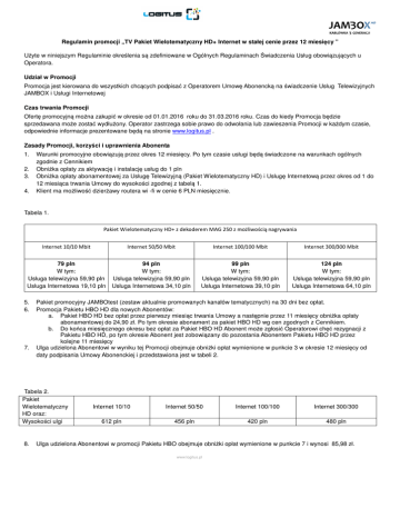 Regulamin promocji „TV Pakiet Wielotematyczny HD+ Internet w stałej cenie przez 12 miesięcy ” Użyte w niniejszym Regulaminie określenia są zdefiniowane w Ogólnych Regulaminach Świadczenia Usług obowiązujących u Operatora. Udział w Promocji Promocja jest kierowana do wszystkich chcących podpisać z Operatorem Umowę Abonencką na świadczenie Usług Telewizyjnych JAMBOX i Usługi Internetowej Czas trwania Promocji Ofertę promocyjną można zakupić w okresie od 01.01.2016 roku do 31.03.2016 roku. Czas do kiedy Promocja będzie sprzedawana może zostać wydłużony. Operator zastrzega sobie prawo do odwołania lub zawieszenia Promocji w każdym czasie, odpowiednie informacje prezentowane będą na stronie www.logitus.pl . Zasady Promocji, korzyści i uprawnienia Abonenta 1. 2. 3. 4. Warunki promocyjne obowiązują przez okres 12 miesięcy. Po tym czasie usługi będą świadczone na warunkach ogólnych zgodnie z Cennikiem Obniżka opłaty za aktywację i instalację usług do 1 pln Obniżka opłaty abonamentowej za Usługę Telewizyjną (Pakiet Wielotematyczny HD) i Usługę Internetową przez okres od 1 do 12 miesiąca trwania Umowy do wysokości zgodnej z tabelą 1. Klient ma możliwość dzierżawy routera wi -fi w cenie 6 PLN miesięcznie. Tabela 1. Pakiet Wielotematyczny HD+ z dekoderem MAG 250 z możliwością nagrywania Internet 10/10 Mbit Internet 50/50 Mbit Internet 100/100 Mbit Internet 300/300 Mbit 79 pln W tym: Usługa telewizyjna 59,90 pln Usługa Internetowa 19,10 pln 94 pln W tym: Usługa telewizyjna 59,90 pln Usługa Internetowa 34,10 pln 99 pln W tym: Usługa telewizyjna 59,90 pln Usługa Internetowa 39,10 pln 124 pln W tym: Usługa telewizyjna 59,90 pln Usługa Internetowa 64,10 pln 5. 6. 7. Pakiet promocyjny JAMBOtest (zestaw aktualnie promowanych kanałów tematycznych) na 30 dni bez opłat. Promocja Pakietu HBO HD dla nowych Abonentów: a. Pakiet HBO HD bez opłat przez pierwszy miesiąc trwania Umowy a następnie przez 11 miesięcy obniżka opłaty abonamentowej do 24,90 zł. Po tym okresie abonament za pakiet HBO HD wg cen zgodnych z Cennikiem. b. Do końca miesięcznego okresu bez opłat za Pakiet HBO HD Abonent może zgłosić Operatorowi chęć rezygnacji z Pakietu HBO HD, po tym okresie Abonent jest zobowiązany do pozostania Abonentem Pakietu HBO HD przez kolejne 11 miesięcy Ulga udzielona Abonentowi w wyniku tej Promocji obejmuje obniżki opłat wymienione w punkcie 3 w okresie 12 miesięcy od daty podpisania Umowy Abonenckiej i przedstawiona jest w tabeli 2. Tabela 2. Pakiet Wielotematyczny HD oraz: Wysokości ulgi 8. Internet 10/10 Internet 50/50 Internet 100/100 Internet 300/300 612 pln 456 pln 420 pln 480 pln Ulga udzielona Abonentowi w promocji Pakietu HBO obejmuje obniżki opłat wymienione w punkcie 7 i wynosi 85,98 zł. www.logitus.pl Zobowiązania Uczestnika Promocji 1. Abonent zobowiązany jest do pozostania Abonentem Usługi Telewizyjnej i Usługi Internetowej przez pełen okres od dnia zawarcia Umowy do końca miesiąca kalendarzowego oraz przez kolejne 12 pełne miesiące kalendarzowe (12 pełne Okresy Rozliczeniowe). 2. Rozwiązanie Umowy w okresie opisanym w punkcie 1 wiąże się z karą w wysokości udzielonej Abonentowi ulgi określonej w niniejszym Regulaminie, pomniejszonej proporcjonalnie, z uwzględnieniem okresu który upłynął od dnia zawarcia Umowy Abonenckiej. Dodatkowo stosuje się zapisy Ogólnego Regulaminu Świadczenia Usług Telewizyjnych i Ogólnego Regulaminu Świadczenia Usług Telekomunikacyjnych obowiązującego u Operatora. Postanowienia końcowe 1. 2. 3. Regulamin Promocji jest częścią Umowy Abonenckiej, jeśli Abonent podpisał Umowę Abonencką w ramach oferty promocyjnej na zasadach niniejszej Promocji. W sprawach nieuregulowanych niniejszym Regulaminem mają zastosowanie postanowienia Ogólnych Regulaminów Świadczenia Usług obowiązujące u Operatora. Podpisując Umowę Promocyjną, Abonent wyraża zgodę na otrzymywanie comiesięcznych faktur drogą elektroniczną (mail, system rozliczeń Operatora) oraz oświadcza, że zapoznał się z Regulaminem Promocji, Ogólnym Regulaminem Świadczenia Usług Telekomunikacyjnych i Telewizyjnych, Cennikiem Usług i akceptuje warunki w nich zawarte. 4. Regulamin w niniejszej wersji obowiązuje od dnia 1 stycznia 2016r.