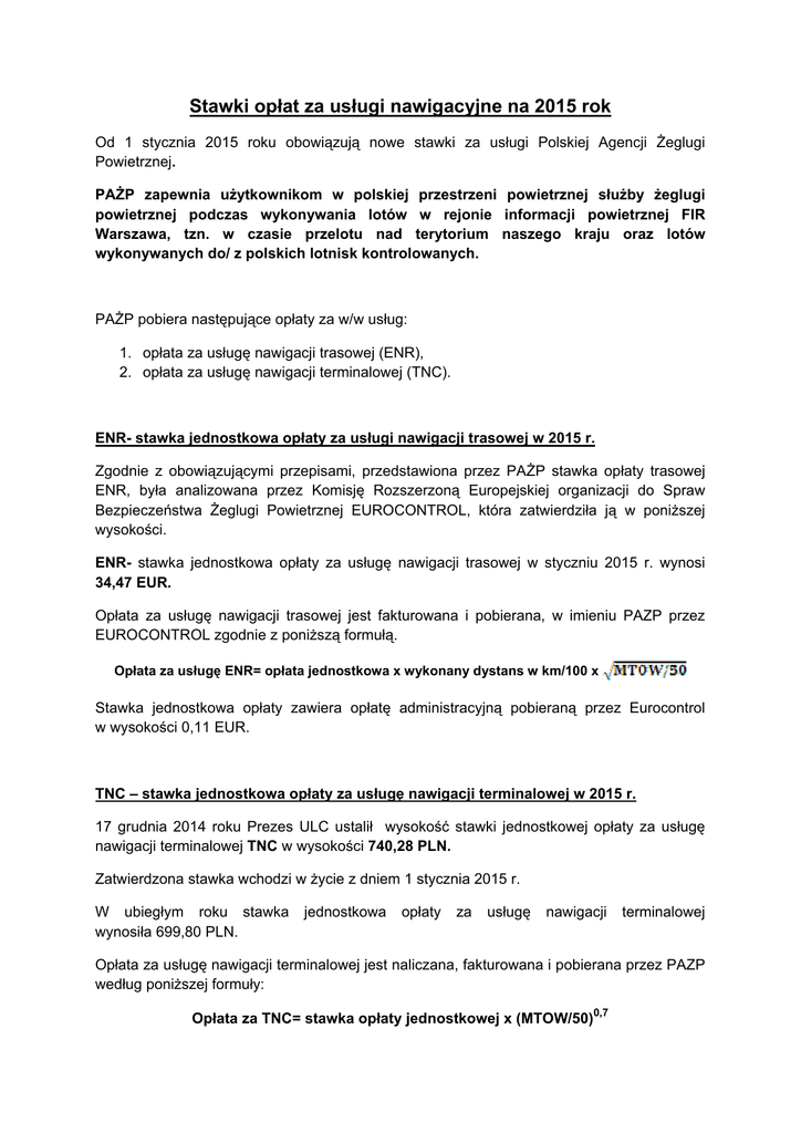 Stawki opłat za usługi nawigacyjne na 2015 rok Od 1 stycznia 2015 roku obowiązują nowe stawki za usługi Polskiej Agencji Żeglugi Powietrznej. PAŻP zapewnia użytkownikom w polskiej przestrzeni powietrznej służby żeglugi powietrznej podczas wykonywania lotów w rejonie informacji powietrznej FIR Warszawa, tzn. w czasie przelotu nad terytorium naszego kraju oraz lotów wykonywanych do/ z polskich lotnisk kontrolowanych. PAŻP pobiera następujące opłaty za w/w usług: 1. opłata za usługę nawigacji trasowej (ENR), 2. opłata za usługę nawigacji terminalowej (TNC). ENR- stawka jednostkowa opłaty za usługi nawigacji trasowej w 2015 r. Zgodnie z obowiązującymi przepisami, przedstawiona przez PAŻP stawka opłaty trasowej ENR, była analizowana przez Komisję Rozszerzoną Europejskiej organizacji do Spraw Bezpieczeństwa Żeglugi Powietrznej EUROCONTROL, która zatwierdziła ją w poniższej wysokości. ENR- stawka jednostkowa opłaty za usługę nawigacji trasowej w styczniu 2015 r. wynosi 34,47 EUR. Opłata za usługę nawigacji trasowej jest fakturowana i pobierana, w imieniu PAZP przez EUROCONTROL zgodnie z poniższą formułą. Opłata za usługę ENR= opłata jednostkowa x wykonany dystans w km/100 x Stawka jednostkowa opłaty zawiera opłatę administracyjną pobieraną przez Eurocontrol w wysokości 0,11 EUR. TNC – stawka jednostkowa opłaty za usługę nawigacji terminalowej w 2015 r. 17 grudnia 2014 roku Prezes ULC ustalił wysokość stawki jednostkowej opłaty za usługę nawigacji terminalowej TNC w wysokości 740,28 PLN. Zatwierdzona stawka wchodzi w życie z dniem 1 stycznia 2015 r. W ubiegłym roku stawka wynosiła 699,80 PLN. jednostkowa opłaty za usługę nawigacji terminalowej Opłata za usługę nawigacji terminalowej jest naliczana, fakturowana i pobierana przez PAZP według poniższej formuły: 0,7 Opłata za TNC= stawka opłaty jednostkowej x (MTOW/50) Prezes ULC utrzymał jedną wspólną strefę pobierania opłat za nawigację terminalową na 14 polskich lotniskach kontrolowanych (FIR Warszawa).To oznacza, że ustalona przez Prezesa ULC jednostkowa stawka za usługę nawigacji terminalowej będzie taka sama we wszystkich portach lotniczych. Wspólną strefą pobierania opłat za usługę nawigacji terminalowej w roku 2015 objęte zostaną następujące lotniska: EPBY Port Lotniczy Bydgoszcz – Szwederowo im. J. Paderewskiego EPGD Port Lotniczy Gdańsk im. L. Wałęsy EPKK Port Lotniczy Kraków - Balice EPKT Port Lotniczy Katowice – Pyrzowice EPLB Port Lotniczy Lublin/Świdnik EPLL Port Lotniczy Łódź –Lublinek im. W. Reymonta EPPO Port Lotniczy Poznań – Ławica im. H. Wieniawskiego EPRA Port Lotniczy Radom/Sadków EPRZ Port Lotniczy Rzeszów - Jasionka EPSC Port Lotniczy Szczecin – Goleniów im. NSZZ Solidarność EPWA Port Lotniczy Warszawa im. F. Chopina EPMO Port Lotniczy Warszawa/Modlin EPWR Port Lotniczy Wrocław - Strachowice EPZG Port Lotniczy Zielona Góra – Babimost W celu uzyskania informacji dotyczących naliczania i pobierania opłat za usługi nawigacyjne prosimy o kontakt na poniższe adresy: ENR- www.eurocontrol.int TNC- [email protected]; [email protected] Powyższe adresy znajdują się także na każdej fakturze wystawionej przez CRCO lub PAŻP.