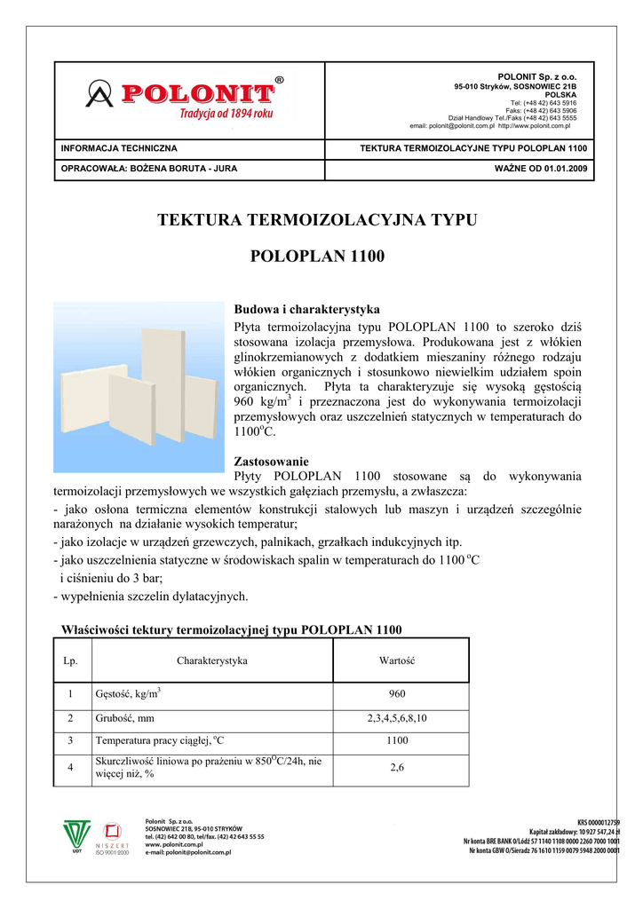 POLONIT Sp. z o.o. 95-010 Stryków, SOSNOWIEC 21B POLSKA Tel: (+48 42) 643 5916 Faks: (+48 42) 643 5906 Dział Handlowy Tel./Faks (+48 42) 643 5555 email: [email protected] http://www.polonit.com.pl INFORMACJA TECHNICZNA TEKTURA TERMOIZOLACYJNE TYPU POLOPLAN 1100 OPRACOWAŁA: BOŻENA BORUTA - JURA WAŻNE OD 01.01.2009 TEKTURA TERMOIZOLACYJNA TYPU POLOPLAN 1100 Budowa i charakterystyka Płyta termoizolacyjna typu POLOPLAN 1100 to szeroko dziś stosowana izolacja przemysłowa. Produkowana jest z włókien glinokrzemianowych z dodatkiem mieszaniny różnego rodzaju włókien organicznych i stosunkowo niewielkim udziałem spoin organicznych. Płyta ta charakteryzuje się wysoką gęstością 960 kg/m3 i przeznaczona jest do wykonywania termoizolacji przemysłowych oraz uszczelnień statycznych w temperaturach do 1100oC. Zastosowanie Płyty POLOPLAN 1100 stosowane są do wykonywania termoizolacji przemysłowych we wszystkich gałęziach przemysłu, a zwłaszcza: - jako osłona termiczna elementów konstrukcji stalowych lub maszyn i urządzeń szczególnie narażonych na działanie wysokich temperatur; - jako izolacje w urządzeń grzewczych, palnikach, grzałkach indukcyjnych itp. - jako uszczelnienia statyczne w środowiskach spalin w temperaturach do 1100 oC i ciśnieniu do 3 bar; - wypełnienia szczelin dylatacyjnych. Właściwości tektury termoizolacyjnej typu POLOPLAN 1100 Lp. Charakterystyka Wartość 1 Gęstość, kg/m3 960 2 Grubość, mm 2,3,4,5,6,8,10 3 Temperatura pracy ciągłej, oC 4 Skurczliwość liniowa po prażeniu w 850OC/24h, nie więcej niż, % 1100 2,6 POLONIT Sp. z o.o. 95-010 Stryków, SOSNOWIEC 21B POLSKA Tel: (+48 42) 643 5916 Faks: (+48 42) 643 5906 Dział Handlowy Tel./Faks (+48 42) 643 5555 email: [email protected] http://www.polonit.com.pl INFORMACJA TECHNICZNA TEKTURA TERMOIZOLACYJNE TYPU POLOPLAN 1100 OPRACOWAŁA: BOŻENA BORUTA - JURA 5 WAŻNE OD 01.01.2009 Ubytek masy po prażeniu w 850OC/24h, nie więcej niż, % < 19,00 Współczynnik przewodzenia ciepła λ, W/mK w temperaturze: 6 - 400 oC 0,10 - 600 oC 0,11 o - 800 C 0,13 o - 1000 C 0,14 Skład chemiczny: 7 8 Al2O3, % 34,10 SiO2, % 43,60 Fe2O3, % < 0,90 TiO2, % < 0,80 MgO, % < 0,30 CaO, % < 0,60 Na2O + K2O, % < 1,00 Włókna organiczne, % 11,50 Wymiary, mm 1000 x 1000 UWAGA! Na życzenie oferujemy także płyty w/w rodzaju wykonane z włókiem biodegradowalnych. W celu uzyskania informacji prosimy o kontakt z Działem Handlowym +48 42 643 55 55.