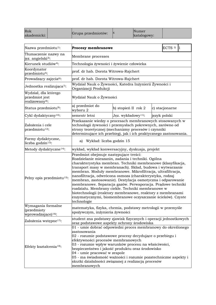 Rok akademicki: Grupa przedmiotów: Nazwa przedmiotu1): Procesy membranowe Tłumaczenie nazwy na jęz. angielski3): Kierunek studiów4): Koordynator przedmiotu5): Prowadzący zajęcia6): Jednostka realizująca7): Wydział, dla którego przedmiot jest realizowany8): Status przedmiotu9): Cykl dydaktyczny10): Założenia i cele przedmiotu12): Formy dydaktyczne, liczba godzin13): Metody dydaktyczne14): K Numer katalogowy: ECTS 2) 1 Membrane processes Technologia żywności i żywienie człowieka prof. dr hab. Dorota Witrowa-Rajchert prof. dr hab. Dorota Witrowa-Rajchert Wydział Nauk o Żywności, Katedra Inżynierii Żywności i Organizacji Produkcji Wydział Nauk o Żywności a) przedmiot do b) stopień II rok 2 c) stacjonarne wyboru 2 semestr letni Jęz. wykładowy11): język polski Przekazanie wiedzy o procesach membranowych stosowanych w technologii żywności i przemysłach pokrewnych, zarówno od strony teoretycznej (mechanizmy procesów i czynniki determinujące ich przebieg), jak i ich praktycznego zastosowania. a) Wykład: liczba godzin 15 wykład, wykład konwersacyjny, dyskusja, projekt Przedmiot obejmuje następujące treści: Rozdzielanie mieszanin, zadania i techniki. Ogólna charakterystyka membran. Techniki membranowe (klasyfikacja, transport masy w membranach). Skład, budowa i wytwarzanie membran. Moduły membranowe. Mikrofiltracja, ultrafiltracja, nanofiltracja, odwrócona osmoza (charakterystyka, rodzaj Pełny opis przedmiotu15): membran, zastosowanie). Destylacja osmotyczna i odparowanie membranowe. Separacja gazów. Perwaporacja. Prądowe techniki rozdziału. Membrany ciekłe. Techniki membranowe w biotechnologii (reaktory membranowe, reaktory z membranami enzymatycznymi, biomembranowe oczyszczanie ścieków). Czyste technologie Wymagania formalne matematyka, fizyka, chemia, podstawy metrologii w przemyśle (przedmioty spożywczym, inżynieria żywności wprowadzające)16): student zna podstawy zjawisk fizycznych i operacji jednostkowych Założenia wstępne17): oraz podstawowe aspekty ochrony środowiska 01 - umie dobrać odpowiedni proces membranowy do określonego zastosowania 02 - rozumie podstawowe procesy decydujące o przebiegu i efektywności procesów membranowych 03 - rozumie wpływ warunków procesu na właściwości, Efekty kształcenia18): bezpieczeństwo i jakość produktu oraz środowisko 04 - umie pracować w zespole 05 - ma świadomość ważności i rozumie pozatechniczne aspekty i skutki działalności związanej z realizacją procesów membranowych Sposób weryfikacji efektów kształcenia19): efekt 01, 04 – ocena projektu efekt 01, 02, 03, 05 – kolokwium zaliczeniowe pisemne Forma dokumentacji osiągniętych efektów kształcenia 20): złożone projekty, imienne karty oceny studenta; treść pytań kolokwium zaliczeniowego z listą ocen studentów Na ocenę efektów kształcenia składa się: 1. ocena projektu (40% oceny końcowej) 2. sprawdzenie wiedzy i umiejętności podczas zaliczenia (60% oceny końcowej) Miejsce realizacji zajęć22): Sala dydaktyczna wykładowa Literatura podstawowa i uzupełniająca23): 1. Rautenbach R.: Procesy membranowe, WNT, Warszawa 1996 2. Praca zbiorowa pod red. A. Narębskiej: Membrany i membranowe techniki rozdziału, Wydawnictwo Uniwersytetu Mikołaja Kopernika, Toruń 1997; 3. Praca zbiorowa pod red. A. Noworytu, A. Trusek-Hołowina: Membrane separation, Agencja Wydawnicza „ARGI”, Wrocław 2001; 4. Materiały konferencji „Membrany i techniki membranowe w przemyśle spożywczym”, Oficyna Wydawnicza Politechniki Warszawskiej, Warszawa 2002 5. Johansson A.: Czysta technologia. Środowisko technika przyszłość, WNT, Warszawa, 1992 UWAGI24): Elementy i wagi mające wpływ na ocenę końcową21): Wskaźniki ilościowe charakteryzujące moduł/przedmiot25) Szacunkowa sumaryczna liczba godzin pracy studenta (kontaktowych i pracy własnej) niezbędna dla osiągnięcia zakładanych efektów kształcenia 18) - na tej podstawie należy wypełnić pole ECTS2: Łączna liczba punktów ECTS, którą student uzyskuje na zajęciach wymagających bezpośredniego udziału nauczycieli akademickich: Łączna liczba punktów ECTS, którą student uzyskuje w ramach zajęć o charakterze praktycznym, takich jak zajęcia laboratoryjne, projektowe, itp.: Tabela zgodności kierunkowych efektów kształcenia efektami przedmiotu Nr /symbol Wymienione w wierszu efekty kształcenia: efektu 01 umie dobrać odpowiedni proces membranowy do określonego zastosowania 02 rozumie podstawowe procesy decydujące o przebiegu i efektywności procesów membranowych 03 rozumie wpływ warunków procesu na właściwości, jakość i bezpieczeństwo produktu oraz środowisko 04 05 umie pracować w zespole ma świadomość ważności i rozumie pozatechniczne aspekty i skutki działalności związanej z realizacją procesów jednostkowych 25 h 0,5 ECTS 0 ECTS 26) Odniesienie do efektów dla programu kształcenia na kierunku K_W02, K_W04, K_W06, K_U02, K_U05 K_W02, K_W04, K_W06, K_U02 K_W02, K_W13, K_W14, KU_02, KU_08 K_K05 K_K01, K_K03