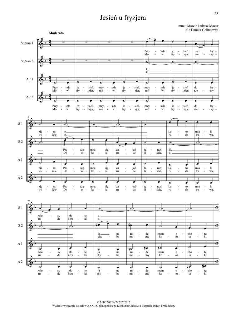 23 Jesień u fryzjera muz.: Marcin Łukasz Mazur sl.: Danuta Gellnerowa Moderato Sopran 1 Sopran 2 Alt 1 & b 43 ∑ & b 43 ∑ 3 &b 4 ˙ & b 43 ˙ Przy Mó 8 S1 &b ˙ zje wi S2 A1 & b ˙. &b ˙ zje wi A2 - &b ˙ zje wi 15 S1 &b œ wło ru S2 A1 A2 & b ˙. &b &b - - szła wi je fry œ ˙ szła wi ra: ście! o, o, œ Pro Do - ˙ Pro Do œ ˙ - ˙ œ sień, zjer, przy mó œ ˙ sień, zjer, przy mó Pro Do - sy de zło krza szę mną o - ko œ - ˙ wło ru - ˙. - ˙ sy de zło krza œ ˙ sy de - - - œ ˙. te, ki, o, o, zło krza - - œ te, ki, œ te, ki, œ ˙ szła wi je fry œ ˙ szła wi się ła œ ˙ szę mną o - ko - - ˙ œ - ˙ œ - œ #œ ja chy wło ru - ˙. je fry - - przy mó œ ˙ sień, zjer, ˙ œ szła wi je fry œ ˙ - ˙. œ œ œ sień zjer: za ru - jąć de te li œ ˙ ˙ za ru - - jąć de te li œ ˙ jąć de te li ˙. œ œ #˙ - na ba ru mo œ n˙ - ˙ ja chy ˙ œ ˙ ja chy œ za ru na ba œ - na ba - je fry œ ˙ do rze ˙. - ru mo ˙ ru mo - œ raz! ście, - - - ˙ de dny mam ko #œ #˙ de dny œ de dny mam ko ˙ œ ˙ La ru - to da mia tra œ ˙ ˙. fry czy - do rze ˙. œ fry czy - - œ fry czy - - œ - ło wa, O, o, ˙ La ru ˙ La ru - to da - to da mia tra œ ˙ mia tra œ - o lor ło wa, - ło wa, œ - o lor œ - o lor © MTC NOTA 742/07/2012 Wydanie wyłącznie do celów XXXII Ogólnopolskiego Konkursu Chórów a Cappella Dzieci i Młodzieży - - cho ta ˙ cho ta n˙ cho ta œ c ˙ - œ - ˙. ˙ mam ko œ œ ˙. œ do rze œ raz! ście, raz! ście, sień zjer: sień zjer: je fry œ - - ˙ - szła wi œ - œ szła wi ˙. œ się ła - przy mó œ ˙ się ła ˙ sień, zjer, ˙. ˙ szę mną o - ko - œ ˙ Przy Mó ∑ œ ˙. œ ra: ście! - je fry œ - œ œ œ ∑ ∑ œ ˙ œ ˙. ra: ście! - ∑ œ œ - ∑ O, O, Przy Mó Alt 2 ∑ - - - œ c œ c tę. ki. tę. ki. #œ tę. ki. c Jesień u fryzjera 24 1. 21 S1 S2 &b c Œ &b c Œ œ. j j j œ œ œ No, bo niech pan, niech pan spo - jrzy sam, bo niech pan, niech pan spo - jrzy sam, j j œj œ œ œ. No, A1 j j œ œj œj œ ˙ j j Œ œ œj œ œj œj œj j j j œ œ œ œ œ œ J ‰ j j j j j œ œ œ œ œ #˙ Œ &b c ‰ j j j j j œ œ œ œ œ Œ bo niech pan spo - jrzy bœ No, bo niech pan spo - jrzy 25 S1 j j Œ œJ Jœ œ œj œ œ œ œj œj ˙ J &b c œ No, A2 j œ n Jœ # œJ Jœ ˙ &b w ˙. Œ .. Œ 2. sam, ˙ Szczo-tka, grze-bień, fa S2 &b w ˙. Œ .. Œ tam! A1 Szczo-tka, grze-bień, fa & b œ # œj œj ˙ ˙. ru - do tam! A2 &b j j œ œ ˙. ˙. &b œ œ ˙ ˙ - &b œ œ ˙ jest fry - zu A1 Œ .. ru - do tam! jest fry - zu S2 Œ .. j jŒ œ œ Szczo-tka, 31 S1 œ Œ ra. ˙ - &b œ œ œ œ ˙ &b œ œ œ œ ˙ j jŒ œ œ Szczo-tka, œ Œ ra. œ Œ to - wa jest fry - zu - ra. A2 j œ œj œj œj œ œ œ Œ to - wa jest fry - zu - ra. ru - do tam! ru - do tu, ru - do tu i ru - do tam, j œ ‰ œ œ j j œ œ œ œ œ ru - do rby fu - ra, œ œ œœ˙ - i tu œnœ#œ œ ˙ - tu ru - do ru - do, j j j j œ œ œ œ œ ru - do j j œ œ œ œ ru - do, sam, ru - do tu, rby fu - ra, tu i ru - do ‰ j œ œ - do i œ Œ j j œ œ œœ œ już go - to- wa już go - to- wa œ œ œ œ Œ œ œ œ œ œ. œ œ œ ˙ J J J J J J J Wo - ła je - sień: W sa - mą po - rę! Pła - cę pa - nu mu œ œ œ œ Œ œ œ œ œ œ . œj œ œ J J J J J J ˙ jest, jest, go - to ‰ j œ œ ‰ j œ œ œ ˙ cho - mo - rem! wa jest, go - ˙ ˙ œœœ ˙ ˙ ˙ œœœ ˙ ˙ ˙ œœœ ˙ - cho - mo Wo - ła je - sień: W sa - mą po - rę! Pła - cę pa - nu mu - cho - mo j j j j j j œ œ œ œ Œ œ œ œ œ # œ . œj œ œ ˙ - cho - mo pa - nu mu jest, go - ˙ pa - nu mu po - rę! Pła - cę wa ˙ po - rę! Pła - cę W sa - mą - - W sa - mą j j j j j j œ œ œ œ Œ œ œ œ œ œ . œj œ œ ˙ j œ œ ‰œ go - to ˙ - ‰ j œ œ Wo - ła je - sień: Wo - ła je - sień: ˙ tam, już go - to - wa, już go - to - wa, już go- to- wa j j j j œ œ œ œ œ fu - ra, œ j j j Œ œ œ œj œj Jœ œ œ œ œJ Jœ œ œ J J œ grze-bień, fa - rby tam, już go - to - wa, już go - to - wa, już go- to- wa Œ j j œ œ œ œœ fu - ra, ru #˙ Œ œJ œJ œ œ Jœ œJ œJ œ œJ Jœ œ œ J JJ j j j j œ œ œ œ #œ grze-bień, fa - rby œ ru - do © MTC NOTA 742/07/2012 Wydanie wyłącznie do celów XXXII Ogólnopolskiego Konkursu Chórów a Cappella Dzieci i Młodzieży - - - rem! rem! rem!