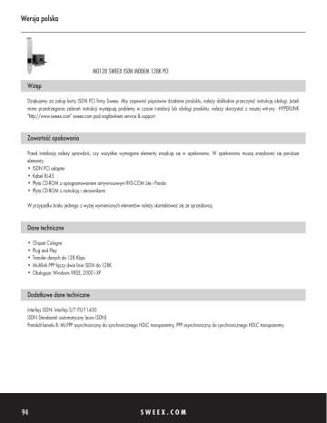 Wersja polska MO128 SWEEX ISDN MODEM 128K PCI Wstęp Dziękujemy za zakup karty ISDN PCI firmy Sweex. Aby zapewnić poprawne działanie produktu, należy dokładnie przeczytać instrukcję obsługi. Jeżeli mimo przestrzegania zaleceń instrukcji występują problemy w czasie instalacji lub obsługi produktu, należy skorzystać z naszej witryny HYPERLINK "http://www.sweex.com" sweex.com pod nagłówkiem service & support. Zawartość opakowania Przed instalacją należy sprawdzić, czy wszystkie wymagane elementy znajdują się w opakowaniu. W opakowaniu muszą znajdować się poniższe elementy: •ISDN PCI adapter •Kabel RJ-45 •Płyta CD-ROM z oprogramowaniem antywirusowym RVS-COM Lite i Panda •Płyta CD-ROM z instrukcją i sterownikami W przypadku braku jednego z wyżej wymienionych elementów należy skontaktować się ze sprzedawcą. Dane techniczne •Chipset Cologne •Plug and Play •Transfer danych do 128 Kbps •Multilink PPP łączy dwie linie ISDN do 128K •Obsługuje: Windows 98SE, 2000 i XP Dodatkowe dane techniczne Interfejs ISDN: Interfejs S/T ITU-T I.430 ISDN Standaard: automatyczny (euro ISDN) Protokół kanału B: ML-PPP asynchroniczny do synchronicznego HDLC transparentny, PPP asynchroniczny do synchronicznego HDLC transparentny 94 SWEEX.COM Wersja polska Instalacja urządzenia Przed instalacją sprzętu, należy podjąć następujące środki ostrożności: •Należy upewnić się, że komputer jest wyłączony i odłączony od zasilania. •Należy również odłączyć kable drukarki i monitora (ponieważ posiadają one własne zasilanie), aby uzyskać pewność, że komputer nie jest zasilany. •Odkręcić obudowę komputera. •Rozładować ładunki elektrostatyczne. Wykonać to dotykając grzejnika lub nie malowanej rury wody lub innego podobnego elementu. Do tego celu nie należy używać wkrętaka magnetycznego. Przed wykonaniem dalszych czynności, krótko dotknąć ramy obudowy komputera. Należy maksymalnie ograniczyć kontakt ze stykami karty PC lub pamięci. •Znaleźć puste gniazdo komputera i wyjąć część metalową płytki ochronnej obudowy komputera przed odpowiednim gniazdem. Czasami włożenie karty w złącze PCI sprawia trudność. W takim przypadku nie należy stosować siły, ale należy wypróbować inne złącze. •Po zainstalowaniu karty, należy sprawdzić, czy pozostałe karty nadal są poprawnie zainstalowane w złączach PCI. Istnieje ryzyko wysunięcia innych kart podczas instalacji nowej karty PCI; w wyniku czego te karty, a nawet cały komputer mogą nie działać prawidłowo. •Można założyć obudowę na komputer i prawidłowo podłączyć kable. •Włączyć zasilanie komputera. Instalacja Windows 98SE Po zainstalowaniu karty w systemie, należy włączyć komputer. Windows wykryje kartę i pojawi się następujący ekran. W tym miejscu kliknąć “Dalej” (Next). 95 Wersja polska W następnym ekranie, należy wybrać opcję “Wyszukaj najlepszego sterownika” (Search for the best driver) i kliknąć “Dalej” (Next). W następnym ekranie, zaznaczyć “Określ lokalizację” (Specify a location). Poniżej wpisać “X:\98me2kxp “ (X jest literą sterownika CD-ROM, który jest inny niż w tym przykładzie). Włożyć płytę CD-ROM Sweex do odtwarzacza CD-ROM i kliknąć “Dalej” (Next). Lub kliknąć “Przeglądaj” (Browse). Wybrać napęd CD-ROM i folder “98me2kxp”, kliknąć “OK” (OK). Użytkownik zostanie przekierowany z powrotem do powyższego ekranu. W tym miejscu kliknąć “Dalej” (Next). 96 SWEEX.COM Wersja polska Windows odnajdzie sterownik we wskazanym położeniu. Kliknąć “Dalej” (Next) aby rozpocząć instalację. Następnie, użytkownik zostanie poproszony o zrestratowanie komputera. Po zrestartowaniu komputera, pojawi się następujący ekran. W tym miejscu należy wybrać EURO-ISDN (DSS1) i kliknąć “Dalej” (Next). W następujących dwóch ekranach użytkownik będzie miał możliwość wpisania numeru ISDN. Może pozostawić puste pola i kliknąć “Dalej” (Next). 97 Wersja polska Kliknąć “Zakończ” (Finish). Po zgłoszeniu, należy włożyć płytę CD-ROM Windows 98SE do napędu CD-ROM. W następującym ekranie, należy wpisać “X:\win98 “ (X jest literą napędu CD-ROM, która jest inny niż w tym przykładzie). Kliknąć “OK” (OK). Kliknąć “Zakończ” (Finish) aby zakończyć instalację. 98 SWEEX.COM Wersja polska ,W następującym ekranie kliknąć “Dalej” (Next), aby zrestartować komputer. Instalacja została zakończona. Karta ISDN PCI Sweex jest gotowa do użycia. Instalacja Windows 2000 i XP Po zainstalowaniu karty w systemie, należy włączyć komputer. Windows wykryje kartę i pojawi się następujący ekran. W tym miejscu wybrać “Nie, nie tym razem” (No, not this time) i kliknąć “Dalej” (Next). Teraz włożyć płytę CD-ROM Sweex do odtwarzacza CD-ROM. Po wykonaniu tej czynności, należy otworzyć odtwarzacz CD-ROM i zamknąć go ponownie. Windows rozpocznie automatycznie wyszukiwanie sterowników na płycie CD-ROM. Lub: Jeżeli Windows nie rozpocznie automatycznego wyszukiwania lub nie odnajdzie sterowników, należy wybrać “Zainstaluj z listy lub określ lokalizację” i kliknąć “Dalej” (Next). 99 Wersja polska W następnym ekranie, zaznaczyć tylko “W wyszukiwaniu obejmij tę lokalizację” (Include this location in the search). Poniżej wpisać “X:\98me2kxp “ (X jest literą sterownika CD-ROM, który jest inny niż w tym przykładzie). Włożyć płytę CD-ROM Sweex do odtwarzacza CD-ROM i kliknąć “Dalej” (Next). Sweex testuje sterowniki wszystkich swoich produktów. W tym miejscu kliknąć “Kontynuuj” (Continue Anyway) aby zatwierdzić test logo. Wybrać europejski ISDN (DSS1) i kliknąć “Dalej” (Next). 100 SWEEX.COM Wersja polska W tym miejscu potwierdzić numer ISDN. Może pozostawić puste pola i kliknąć “Dalej” (Next). Kliknąć “Zakończ” (Finish). W nast