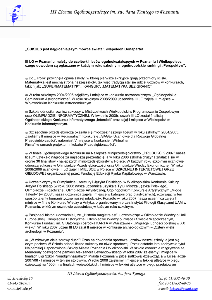 III Liceum Ogólnokształcące im. św. Jana Kantego w Poznaniu ,,SUKCES jest najgłośniejszym mówcą świata”. /Napoleon Bonaparte/ III LO w Poznaniu należy do czołówki liceów ogólnokształcących w Poznaniu i Wielkopolsce, czego dowodem są ogłaszane w każdym roku szkolnym ogólnopolskie rankingi „Perspektyw”. Do ,,Trójki” przylgnęła opinia szkoły, w której pierwsze skrzypce grają przedmioty ścisłe. Matematyka jest mocną stroną naszej szkoły, tak więc tradycją stał się udział uczniów w konkursach, takich jak: ,,SUPERMATEMATYK”, ,,KANGUR”, „MATEMATYKA BEZ GRANIC”. W roku szkolnym 2004/2005 zajęliśmy I miejsce w konkursie astronomicznym ,,Ogólnopolskie Seminarium Astronomiczne”. W roku szkolnym 2008/2009 uczennica III LO zajęła III miejsce w Wojewódzkim Konkursie Astronomicznym. Szkoła odnosiła również sukcesy w Mistrzostwach Wielkopolski w Programowaniu Zespołowym oraz OLIMPIADZIE INFORMATYCZNEJ. W kwietniu 2008r. uczeń III LO został finalistą Ogólnopolskiego Konkursu Informatycznego „Intersieć” oraz zajął I miejsce w Wielkopolskim Konkursie Informatycznym. Szczególnie przedsiębiorcza okazała się młodzież naszego liceum w roku szkolnym 2004/2005. Zajęliśmy II miejsce w Regionalnym Konkursie ,,SAGE- Uczniowie dla Rozwoju Globalnej Przedsiębiorczości”, natomiast V miejsce w konkursie ,,Wirtualna Firma” w ramach projektu ,,Inkubator Przedsiębiorczości”. W finale Ogólnopolskiego Konkursu na Najlepsze Miniprzedsiębiorstwo ,,PRODUKCIK 2007” nasze liceum uzyskało nagrodę za najlepszą prezentację, a w roku 2008 szkolna drużyna znalazła się w gronie 30 finalistów - najlepszych miniprzedsiębiorstw w Polsce. W każdym roku szkolnym uczniowie odnoszą sukcesy w Olimpiadzie Przedsiębiorczości oraz Olimpiadzie Wiedzy Ekonomicznej. W roku 2008/2009 uczniowie III LO zajęli I MIEJSCE w Polsce w SZKOLNEJ INTERNETOWEJ GRZE GIEŁDOWEJ organizowanej przez Fundację Edukacji Rynku Kapitałowego w Warszawie. Uczestniczymy w Olimpiadzie Literatury i Języka Polskiego, w Wielkopolskim Konkursie Kultury Języka Polskiego (w roku 2008 nasza uczennica uzyskała Tytuł Mistrza Języka Polskiego), Olimpiadzie Filozoficznej, Olimpiadzie Artystycznej, Ogólnopolskim Konkursie Artystycznym „Młode Talenty” (w 2008r. nasza uczennica zajęła I miejsce w kategorii prac plastycznych), rozwijając w ten sposób talenty humanistyczne naszej młodzieży. Ponadto w roku 2007 nasza uczennica zajęła I miejsce w finale Konkursu Wiedzy o Antyku, organizowanym przez Instytut Filologii Klasycznej UAM w Poznaniu, w którym uczniowie uczestniczą w każdym roku szkolnym. Pasjonaci historii udowadniali, że ,,Historia magistra est”, uczestnicząc w Olimpiadzie Wiedzy o Unii Europejskiej, Olimpiadzie Historycznej, Olimpiadzie Wiedzy o Polsce i Świecie Współczesnym, Konkursie Fundacji im. S.Batorego i ośrodka KARTA w Warszawie - ,,Migracje ludności polskiej w XX wieku”. W roku 2007 uczeń III LO zajął II miejsce w konkursie archeologicznym – „Cztery wieki archeologii w Poznaniu”. ,,W zdrowym ciele zdrowy duch”! Czas na dokonania sportowe uczniów naszej szkoły, a jest się czym pochwalić! Szkoła odnosi liczne sukcesy na niwie sportowej. Przez ostatnie lata zdobywała tytuł Najbardziej Usportowionej Szkoły Miasta Poznania i Wielkopolski. W szkole corocznie rozgrywane są Memoriały poświęcone pamięci Aleksandra Lewandowskiego W roku 2007 zajęliśmy I miejsce w finałach Ligi Szkół Ponadgimnazjalnych Miasta Poznania w piłce siatkowej dziewcząt, a w Licealiadzie 2007/08 - I miejsce w tenisie stołowym. W roku 2008 zajęliśmy I miejsce w lekkiej atletyce w biegu dziewcząt na 1500 m w finałach wojewódzkich, I miejsce w lekkiej atletyce w biegu przełajowym III Liceum Ogólnokształcące im. św. Jana Kantego ul. Strzelecka 10 61-845 Poznań www.lo3.edu.pl tel. (0-61) 852-46-50 fax. (0-61) 852-68-15 e-mail: [email protected] III Liceum Ogólnokształcące im. św. Jana Kantego w Poznaniu (indywidualnym) dziewcząt na 1500 m w finałach wojewódzkich, II miejsce w piłce ręcznej dziewcząt oraz III miejsce w piłce ręcznej chłopców w Licealiadzie 2008/09. OSIĄGNIĘCIA UCZNIÓW W ROKU SZKOLNYM 2009/2010 Do finału Konkursu Wiedzy o Antyku zakwalifikowało się 14 uczniów III LO. Uczeń klasy akademickiej uzyskał tytuł Laureata Olimpiady Informatycznej, uczeń klasy akademickiej - tytuł Finalisty Olimpiady Informatycznej. I miejsce w półfinale konkursu Supermatematyk dla klas pierwszych poznańskich szkół ponadgimnazjalnych – uczeń klasy akademickiej. - W eliminacjach okręgowych Olimpiady Filozoficznej - 2 uczniów. W eliminacjach okręgowych Olimpiady Przedsiębiorczości – 2 uczniów. W eliminacjach centralnych Olimpiady Wiedzy Ekonomicznej – 1 finalista. W eliminacjach okręgowych Olimpiady Biologicznej – 3 uczniów. W eliminacjach okręgowych Misyjnej Olimpiady Znajomości Afryki – 2 uczniów. W Wojewódzkim Konkursie Literackim ZIELONE PIÓRA – 2 finalistów. I miejsce w Rejonowych Mistrzostwach Pierwszej Pomocy, III miejsce w etapie okręgowym Ogólnopolskich Mistrzostw Pierwszej Pomocy. Poznańskie Igrzyska Młodzieży Szkolnej – Licealiada: III miejsce piłka ręczna dziewcząt, II miejsce – koszykówka chłopców. II miejsce w IV Poznańskiej Lidze Liceów w Szachach. OSIAGNIĘCIA UCZNIÓW W ROKU SZKOLNYM 2010/2011 - W eliminacjach okręgowych Olimpiady Biologicznej – 3 uczniów. - W eliminacjach okręgowych Olimpiady Geograficznej – 1 uczeń. - W eliminacjach okręgowych Olimpiady Historycznej – 3 uczniów. - W eliminacjach okręgowych Olimpiady Informatycznej – 3 uczniów. - W eliminacjach okręgowych Olimpiady Przedsiębiorczości – 6 uczniów. - W eliminacjach okręgowych Olimpiady Wiedzy Ekonomicznej – 1 uczeń. - W eliminacjach okręgowych Olimpiady Wiedzy o Podatkach – 5 uczniów. - W eliminacjach okręgowych Olimpiady Teologii Katolickiej – 2 
