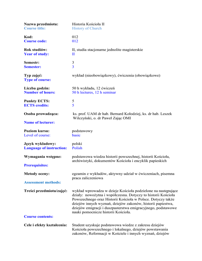 Nazwa przedmiotu: Course title: Historia Kościoła II History of Church Kod: Course code: 012 012 Rok studiów: Year of study: II, studia stacjonarne jednolite magisterskie II Semestr: Semester: 3 3 Typ zajęć: Type of course: wykład (nieobowiązkowy), ćwiczenia (obowiązkowe) Liczba godzin: Number of hours: 50 h wykładu, 12 ćwiczeń 50 h lectures, 12 h seminar Punkty ECTS: ECTS credits: 5 5 Osoba prowadząca: ks. prof. UAM dr hab. Bernard Kołodziej, ks. dr hab. Leszek Wilczyński, o. dr Paweł Zając OMI Name of lecturer: Poziom kursu: Level of course: podstawowy basic Język wykładowy: Language of instruction: polski Polish Wymagania wstępne: podstawowa wiedza historii powszechnej, historii Kościoła, archiwistyki, dokumentów Kościoła i encyklik papieskich Prerequisites: Metody oceny: egzamin z wykładów, aktywny udział w ćwiczeniach, pisemna praca zaliczeniowa Assessment methods: Treści przedmiotu/zajęć: wykład wprowadza w dzieje Kościoła podzielone na następujące działy: nowoŜytna i współczesna. Dotyczy to historii Kościoła Powszechnego oraz Historii Kościoła w Polsce. Dotyczy takŜe dziejów innych wyznań, dziejów zakonów, historii papiestwa, dziejów emigracji i duszpasterstwa emigracyjnego, podstawowe nauki pomocnicze historii Kościoła. Course contents: Cele i efekty kształcenia: Student uzyskuje podstawowa wiedze z zakresu dziejów Kościoła powszechnego i lokalnego, dziejów powstawania zakonów, Reformacji w Kościele i innych wyznań, dziejów 2 papiestwa, podstawową wiedzę z zakresu prowadzenia kwerendy i badań archiwalnych oraz aktualnych spraw i problemów w Kościele. Objectives and learning outcomes: Zalecana literatura: Ks. B. Kumor, Historia Kościoła, 8 tomów, Lublin 1973(t.1) do 1995 (t.8). Ks. M. Banaszak, Historia Kościoła Katolickiego, 4 tomy, Warszawa 1987 (t.1) do 1992 (t.4). P. Pierrard, Historia Koscioła Katolickiego, Warszawa 1981. J. Danielou, H.I. Marrou, Historia Kościoła, Warszawa t. 1, 1984. M.D. Knowles, D. Obolensky, Historia Kościoła, Warszawa t. 2, 1988. H. Tüchle, Historia Kościoła, Warszawa t. 3, 1986. L.J. Rogier, G. De Bergier de Sauvigny, J. Hajjar, Historia Kościoła, Warszawa t. 4, 1987. R.Aubert i in., Historia Kościoła, Warszawa t. 5, 1985. Sokrates Scholastyk, Historia Kościoła, Warszawa 1986. Hermiasz Sozomen, Historia Kościoła, Warszawa 1980. G. Bedoulle OP, Kościół w dziejach, Poznań 1994. Historia chrześcijaństwa, praca zbiorowa, Warszawa 2002. (przekład: The History of Christianity). Historia Kościoła w Polsce, red. ks. B. Kumor, ks. Z. Obertyński, Poznań-Warszawa t. 1 (vol. 1 i 2), 1974; t. 2 (vol. 1 i 2). K. Dopierała, Księga PapieŜy, Poznań 1996. Szymański, Nauki pomocnicze historii, Warszawa 1976. Recommended reading: KALKULACJA NAKŁADU PRACY STUDENTA: 1. Godziny kontaktowe: 62 h (50 h wykładów + 12 h ćwiczeń) = 2 pkt. ECTS 2. Praca w grupie nad róŜnymi zagadnieniami badawczymi: 12 h 3. Przygotowanie ćwiczeń: 10 h 4. Czytanie zadanych lektur: 20 h 5. Napisanie pracy zaliczeniowej: 10 h 6. Przygotowanie do egzaminu: 40 h Razem: 154 h = 5 pkt. ETCS