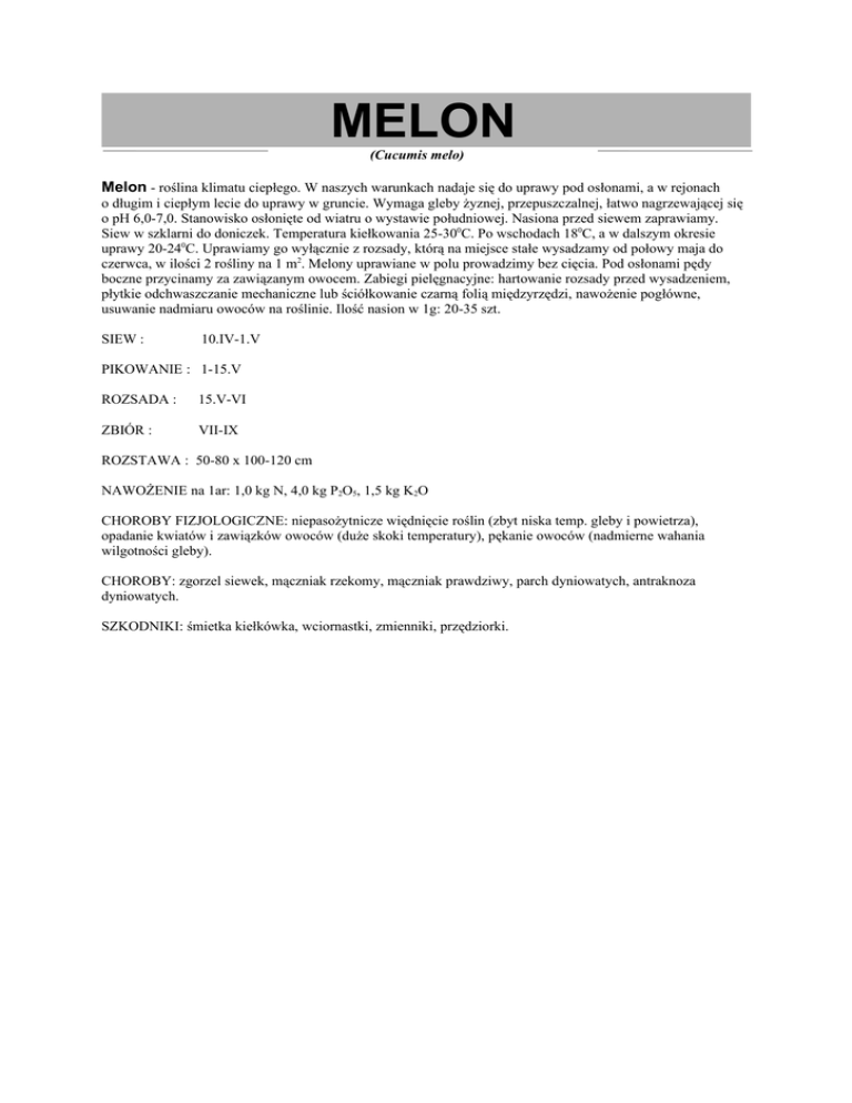 MELON (Cucumis melo) Melon - roślina klimatu ciepłego. W naszych warunkach nadaje się do uprawy pod osłonami, a w rejonach o długim i ciepłym lecie do uprawy w gruncie. Wymaga gleby żyznej, przepuszczalnej, łatwo nagrzewającej się o pH 6,0-7,0. Stanowisko osłonięte od wiatru o wystawie południowej. Nasiona przed siewem zaprawiamy. Siew w szklarni do doniczek. Temperatura kiełkowania 25-300C. Po wschodach 180C, a w dalszym okresie uprawy 20-240C. Uprawiamy go wyłącznie z rozsady, którą na miejsce stałe wysadzamy od połowy maja do czerwca, w ilości 2 rośliny na 1 m2. Melony uprawiane w polu prowadzimy bez cięcia. Pod osłonami pędy boczne przycinamy za zawiązanym owocem. Zabiegi pielęgnacyjne: hartowanie rozsady przed wysadzeniem, płytkie odchwaszczanie mechaniczne lub ściółkowanie czarną folią międzyrzędzi, nawożenie pogłówne, usuwanie nadmiaru owoców na roślinie. Ilość nasion w 1g: 20-35 szt. SIEW : 10.IV-1.V PIKOWANIE : 1-15.V ROZSADA : 15.V-VI ZBIÓR : VII-IX ROZSTAWA : 50-80 x 100-120 cm NAWOŻENIE na 1ar: 1,0 kg N, 4,0 kg P2O5, 1,5 kg K2O CHOROBY FIZJOLOGICZNE: niepasożytnicze więdnięcie roślin (zbyt niska temp. gleby i powietrza), opadanie kwiatów i zawiązków owoców (duże skoki temperatury), pękanie owoców (nadmierne wahania wilgotności gleby). CHOROBY: zgorzel siewek, mączniak rzekomy, mączniak prawdziwy, parch dyniowatych, antraknoza dyniowatych. SZKODNIKI: śmietka kiełkówka, wciornastki, zmienniki, przędziorki.