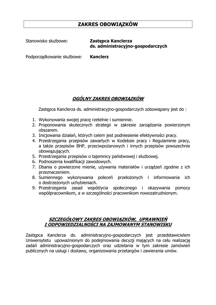 ZAKRES OBOWIĄZKÓW Stanowisko służbowe: Zastępca Kanclerza ds. administracyjno-gospodarczych Podporządkowanie służbowe: Kanclerz OGÓLNY ZAKRES OBOWIĄZKÓW Zastępca Kanclerza ds. administracyjno-gospodarczych zobowiązany jest do : 1. Wykonywania swojej pracę rzetelnie i sumiennie. 2. Proponowania skutecznych strategii w zakresie zarządzania powierzonym obszarem. 3. Inicjowania działań, których celem jest podniesienie efektywności pracy. 4. Przestrzegania przepisów zawartych w Kodeksie pracy i Regulaminie pracy, a także przepisów BHP, przeciwpożarowych i innych przepisów powszechnie obowiązujących. 5. Przestrzegania przepisów o tajemnicy państwowej i służbowej. 6. Podnoszenia kwalifikacji zawodowych. 7. Dbania o powierzone mienie, używania materiałów i urządzeń zgodnie z ich przeznaczeniem. 8. Sumiennego wykonywania poleceń przełożonych i informowania ich o dostrzeżonych uchybieniach. 9. Przestrzegania zasad współżycia społecznego i okazywania pomocy współpracownikom, a w szczególności pracownikom nowozatrudnionym. SZCZEGÓŁOWY ZAKRES OBOWIĄZKÓW, UPRAWNIEŃ I ODPOWIEDZIALNOŚCI NA ZAJMOWANYM STANOWISKU Zastępca Kanclerza ds. administracyjno-gospodarczych jest przedstawicielem Uniwersytetu upoważnionym do podejmowania decyzji mających na celu realizację zadań administracyjno-gospodarczych oraz udzielania w tym zakresie zamówień publicznych na usługi i dostawy, organizowania przetargów i zawierania umów. Do bezpośredniego zakresu działania Zastępcy Kanclerza ds. administracyjnogospodarczych należą zadania określone w Regulaminie Organizacyjnym, a w szczególności: 1. Nadzór nad całokształtem usług i dostaw realizowanych na potrzeby Uczelni, wynikających z powierzonego zakresu obowiązków oraz zakupów finansowanych z Zakładowego Funduszu Świadczeń Socjalnych. 2. Prowadzenie postępowań z zakresu zamówień publicznych oraz zawieranie umów związanych z wykonywanym zakresem czynności do kwoty 40.000. Euro brutto. a. Akceptacja poszczególnych zamówień przygotowywanych przez Dział Zaopatrzenia oraz inne jednostki organizacyjne UAM. b. Analizowanie materiałów przetargowych, uczestniczenie w posiedzeniach komisji przetargowych oraz zawieranie umów. 3. Administrowanie nieruchomościami, a w szczególności : a. Zapewnienie właściwej gospodarki ekonomiczno-finansowej nieruchomości poprzez : - Prowadzenie całości spraw związanych z funkcjonowaniem na terenie Uczelni stołówek, bufetów, automatów do sprzedaży napojów i żywności oraz punktów ksero. - Prowadzenie całości spraw związanych z wynajmem przez Uczelnię obiektów, pomieszczeń, terenów oraz innych powierzchni. b. Zapewnienie bezpieczeństwa użytkowania i właściwej eksploatacji nieruchomości poprzez : - Prowadzenie całości spraw związanych z dostawą mediów (prąd, woda, ścieki, gaz, energia cieplna, telefony). - Prowadzenie całości spraw związanych z funkcjonowaniem oraz bieżącą konserwacją infrastruktury (urządzenia dźwigowe, monitoring wizyjny, sygnały włamaniowe i pożarowe). - Bieżące administrowanie nieruchomościami. 4. Przygotowywanie sprawozdań rzeczowych i finansowych z zakresu wykonywanych zadań, a w szczególności materiałów do planu budżetu i innych dokumentów wymaganych przez MNiSW. 5. Analizowanie i akceptowanie faktur, wszelkich dokumentów finansowych oraz rozliczeń materiałowych w zakresie powierzonych obowiązków. 6. Nadzór nad Działem Administracyjno-Gospodarczym, Działem Zaopatrzenia, domami studenckimi i obiektami naukowo-dydatycznymi. a. Zatwierdzanie ogólnych i szczegółowych planów zaopatrzenia materiałowo-magazynowego. b. Nadzór nad prawidłową gospodarką transportową. c. Nadzór nad gospodarką materiałowo - magazynową i właściwym zabezpieczeniem magazynów. d. Nadzór nad utrzymaniem porządku i czystości oraz systemów bezpieczeństwa domów studenckich i obiektów naukowo-dydaktycznych. e. Nadzór nad prawidłowym gospodarowaniem sprzętem biurowym, meblami i sprzętem dydaktycznym z wyłączeniem aparatury naukowobadawczej. f. Koordynacja i kontrola dyscypliny pracy podległych kierowników i pracowników. g. Zatwierdzanie premii i nadgodzin pracowników obsługi. 7. Kontrola wszelkich wyjazdów służbowych, w tym wyjazdów samochodami prywatnymi w celach służbowych, rozliczanie limitów kilometrowych oraz rozliczanie remontów samochodów. 8. Nadzór nad Samodzielną Sekcją Inwentaryzacji oraz pełnienie funkcji Przewodniczącego Uczelnianej Komisji Inwentaryzacyjnej. 9. Opracowywanie projektów zarządzeń, instrukcji i regulaminów wynikających z zakresu czynności. 10. Zastępowanie Kanclerza w zakresie przez niego zleconym. 11. Wykonywanie innych prac zleconych przez JM Rektora lub Kanclerza. ZAKRES UPRAWNIEŃ Niezależnie od uprawnień wynikających z Kodeksu pracy i Regulaminu pracy Zastępca Kanclerza ds. administracyjno-gospodarczych uprawniony jest do: 1. Samodzielnego działania i kontaktowania się z pracownikami innych komórek organizacyjnych w zakresie powierzonych działań. 2. Reprezentowania uzgodnionego z przełożonym stanowiska w zakresie prowadzonych spraw. 3. Odwołania się od decyzji i poleceń przełożonego, jeżeli są one sprzeczne z obowiązującymi przepisami. ZAKRES ODPOWIEDZIALNOŚCI 1. Zastępca Kanclerza ds. administracyjno-gospodarczych jest odpowiedzialny za merytoryczną i rzeczową stronę załatwianych spraw i ich terminowość. 2. Ponosi odpowiedzialność finansową za podjęte przez siebie decyzje. 3. Ponosi pełną odpowiedzialność w przypadku podjęcia decyzji niezgodnych z przepisami BHP i przeciwpożarowymi, Prawem Zamówień Publicznych, Ustawą o finansach publicznych oraz pozostałymi przepisami prawa.