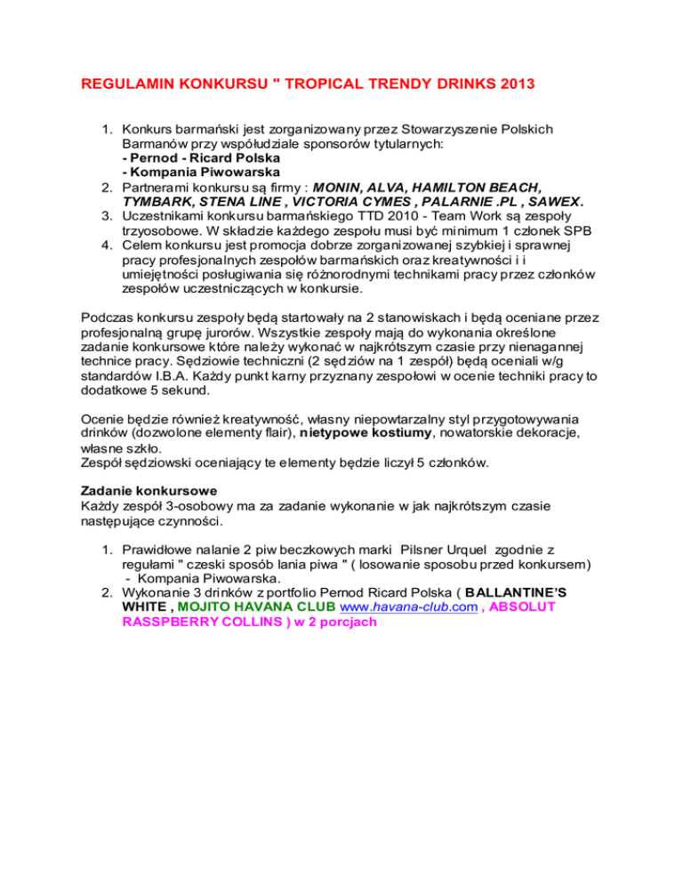 REGULAMIN KONKURSU " TROPICAL TRENDY DRINKS 2013 1. Konkurs barmański jest zorganizowany przez Stowarzyszenie Polskich Barmanów przy współudziale sponsorów tytularnych: - Pernod - Ricard Polska - Kompania Piwowarska 2. Partnerami konkursu są firmy : MONIN, ALVA, HAMILTON BEACH, TYMBARK, STENA LINE , VICTORIA CYMES , PALARNIE .PL , SAWEX. 3. Uczestnikami konkursu barmańskiego TTD 2010 - Team Work są zespoły trzyosobowe. W składzie każdego zespołu musi być minimum 1 członek SPB 4. Celem konkursu jest promocja dobrze zorganizowanej szybkiej i sprawnej pracy profesjonalnych zespołów barmańskich oraz kreatywności i i umiejętności posługiwania się różnorodnymi technikami pracy przez członków zespołów uczestniczących w konkursie. Podczas konkursu zespoły będą startowały na 2 stanowiskach i będą oceniane przez profesjonalną grupę jurorów. Wszystkie zespoły mają do wykonania określone zadanie konkursowe które należy wykonać w najkrótszym czasie przy nienagannej technice pracy. Sędziowie techniczni (2 sęd ziów na 1 zespół) będą oceniali w/g standardów I.B.A. Każdy punkt karny przyznany zespołowi w ocenie techniki pracy to dodatkowe 5 sekund. Ocenie będzie również kreatywność, własny niepowtarzalny styl przygotowywania drinków (dozwolone elementy flair), nietypowe kostiumy, nowatorskie dekoracje, własne szkło. Zespół sędziowski oceniający te elementy będzie liczył 5 członków. Zadanie konkursowe Każdy zespół 3-osobowy ma za zadanie wykonanie w jak najkrótszym czasie następujące czynności. 1. Prawidłowe nalanie 2 piw beczkowych marki Pilsner Urquel zgodnie z regułami " czeski sposób lania piwa " ( losowanie sposobu przed konkursem) - Kompania Piwowarska. 2. Wykonanie 3 drinków z portfolio Pernod Ricard Polska ( BALLANTINE’S WHITE , MOJITO HAVANA CLUB www.havana-club.com , ABSOLUT RASSPBERRY COLLINS ) w 2 porcjach - receptury drinków konkursowych : BALLANTINE’S WHITE Składniki : 40ml Ballantine’s Finest 10 ml Malibu 20ml sok z cytryny 10 ml syrop cuk rowy 1 białk a jaja Lód k ostk a Metoda : Kok tajle przygotowywany w shak erze. Wszystk ie składnik i umieścić w shak erze i mocno wstrząsnąć. Przelać do schłodzonego k ieliszk a k oktajlowego przy pomocy dwóc h sitek tzw. Double strain. Dek orować plasterk iem cytryny ABSOLUT RASPBERRY COLLINS: Składniki : 40ml Absolut Blue 20ml sok z cytryny 10 ml syrop cuk rowy 6-8 malin Woda azowana do wypełnienia Lód k ruszony Metoda : Koktajl budowany. Maliny ugnieść w szklance long, dodać kolejno dalsze składniki poza wodą gazowaną, uzupełnić lodem kruszonym, dokładnie wymieszać i dopełnić wodą gazowaną. Dekorować maliną i zestem z cytryny Kryteria oceny A. ocena techniczna ( IBA ,KP – ocena wg „Perfect Serve” ) B. kreatywność i własny niepowtarzalny styl pracy zespołu, oraz oryginalny wygład i dekoracja drinków (0 - 10 pkt) C. oryginalne kostiumy zespołu (0 - 10 pkt) Każdy punkt karny przyznany przez jury ( A ) oznacza 5 sekund Każdy punkt przyznany przez jury ( B+C ) oznacza 1 sekundę . Wynik ostateczny zespołu będzie wyliczony w następujący sposób : Czas wykonania zadania konkursowego ,plus punkty karne oceny technicznej ( 1pkt.= 5sekund ) minus punkty uzyskane za kreatywność ,niepowtarzalny styl oraz kostiumy ( 1pkt = 1 sekunda ) Zespól barmański który uzyska najlepszy wynik ( najszybszy czas ) wygrywa zawody. UWAGA!!! Wszystkie składniki dekoracyjne, owoce i warzywa, szkło, etc. które mają być zastosowane w konkursie - zawodnicy zabezpieczają we własnym zakresie. Portfolio produktów zapewnionych przez organizatorów będzie zaprezentowane podczas odprawy uczestników konkursu. Organizatorzy przewidują nagrody regulaminowe (rzeczowe) dla 3 najlepszych zespołów, puchary, oraz dyplomy uczestnictwa dla wszystkich uczestników konkursu.