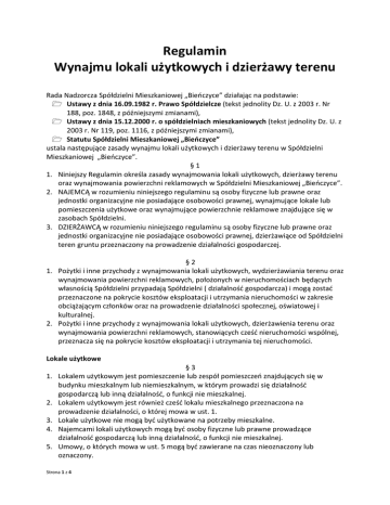 Regulamin Wynajmu lokali użytkowych i dzierżawy terenu Rada Nadzorcza Spółdzielni Mieszkaniowej „Bieńczyce” działając na podstawie: 1 Ustawy z dnia 16.09.1982 r. Prawo Spółdzielcze (tekst jednolity Dz. U. z 2003 r. Nr 188, poz. 1848, z późniejszymi zmianami), 1 Ustawy z dnia 15.12.2000 r. o spółdzielniach mieszkaniowych (tekst jednolity Dz. U. z 2003 r. Nr 119, poz. 1116, z późniejszymi zmianami), 1 Statutu Spółdzielni Mieszkaniowej „Bieńczyce” ustala następujące zasady wynajmu lokali użytkowych i dzierżawy terenu w Spółdzielni Mieszkaniowej „Bieńczyce”. §1 1. Niniejszy Regulamin określa zasady wynajmowania lokali użytkowych, dzierżawy terenu oraz wynajmowania powierzchni reklamowych w Spółdzielni Mieszkaniowej „Bieńczyce”. 2. NAJEMCĄ w rozumieniu niniejszego regulaminu są osoby fizyczne lub prawne oraz jednostki organizacyjne nie posiadające osobowości prawnej, wynajmujące lokale lub pomieszczenia użytkowe oraz wynajmujące powierzchnie reklamowe znajdujące się w zasobach Spółdzielni. 3. DZIERŻAWCĄ w rozumieniu niniejszego regulaminu są osoby fizyczne lub prawne oraz jednostki organizacyjne nie posiadające osobowości prawnej, dzierżawiące od Spółdzielni teren gruntu przeznaczony na prowadzenie działalności gospodarczej. §2 1. Pożytki i inne przychody z wynajmowania lokali użytkowych, wydzierżawiania terenu oraz wynajmowania powierzchni reklamowych, położonych w nieruchomościach będących własnością Spółdzielni przypadają Spółdzielni ( działalność gospodarcza) i mogą zostać przeznaczone na pokrycie kosztów eksploatacji i utrzymania nieruchomości w zakresie obciążającym członków oraz na prowadzenie działalności społecznej, oświatowej i kulturalnej. 2. Pożytki i inne przychody z wynajmowania lokali użytkowych, dzierżawienia terenu oraz wynajmowania powierzchni reklamowych, stanowiących cześć nieruchomości wspólnej, przeznacza się na pokrycie kosztów eksploatacji i utrzymania tej nieruchomości. Lokale użytkowe §3 1. Lokalem użytkowym jest pomieszczenie lub zespół pomieszczeń znajdujących się w budynku mieszkalnym lub niemieszkalnym, w którym prowadzi się działalność gospodarczą lub inną działalność, o funkcji nie mieszkalnej. 2. Lokalem użytkowym jest również cześć lokalu mieszkalnego przeznaczona na prowadzenie działalności, o której mowa w ust. 1. 3. Lokale użytkowe nie mogą być użytkowane na potrzeby mieszkalne. 4. Najemcami lokali użytkowych mogą być osoby fizyczne lub prawne prowadzące działalność gospodarczą lub inną działalność, o funkcji nie mieszkalnej. 5. Umowy, o których mowa w ust. 5 mogą być zawierane na czas nieoznaczony lub oznaczony. Strona 1 z 4 §4 1. Wyboru najemców lokali użytkowych o powierzchni powyżej 70 m2 wybiera Zarząd Spółdzielni w drodze przetargu przeprowadzonego na podstawie Regulaminu organizowania i przeprowadzania przetargów w Spółdzielni Mieszkaniowej „Bieńczyce”. 2. Zasady wyboru najemców lokali użytkowych o powierzchni do 70 m2 ustala Zarząd. §5 1. Przekazanie Najemcy lokalu odbywa się na podstawie protokołu zdawczo – odbiorczego zawierającego opis stanu technicznego i jego wyposażenia oraz winien być podpisany przez obydwie strony umowy najmu. 2. Protokolarne przekazanie lokalu, pawilonu, lub terenu następuje nie później niż w przeciągu 7 dni licząc od dnia podpisania umowy najmu lub dzierżawy. 3. Protokół zdawczo – odbiorczy stanowi integralną część umowy najmu oraz podstawę rozliczeń przy zwrocie lokalu. 4. W czasie trwania umowy najmu, Najemca zobowiązany jest do przeprowadzania własnym kosztem drobnych napraw i odnawiania lokalu oraz utrzymywania lokalu, jego wyposażenia i jego otoczenia w należytym stanie technicznym i sanitarno porządkowym. 5. O potrzebie przeprowadzania napraw obciążających Wynajmującego, Najemca zobowiązany jest niezwłocznie pisemnie zawiadomić, w przeciwnym przypadku odpowiada za powstałą szkodę. 6. Wszelkie modernizacje, remonty bądź adaptacje lokalu proponowane przez Najemcę wykonywane i finansowane są przez Najemcę po uzyskaniu pisemnej zgody Wynajmującego. Koszt dokonanych zmian, o których mowa w zdaniu pierwszym nie podlega rozliczeniu lub zwrotowi przez Spółdzielnię, ani w czasie trwania umowy najmu ani w przypadku jej rozwiązania. 7. W przypadku gdy Spółdzielnia przekazuje Najemcy lokal użytkowy bez wyposażenia w urządzenia techniczno –sanitarnego, Najemca we własnym zakresie i na własny koszt może zamontować te urządzenia. 8. Umieszczenie reklamy przez Najemcę z wyjątkiem wynajmowanego lokalu jest odpłatne i wymaga zgody Zarządu Spółdzielni, a jej umieszczenie może nastąpić po ustaleniu jej lokalizacji oraz warunków technicznych i estetycznych. 9. Po zakończeniu umowy najmu Najemca usunie zamontowane przez siebie wszystkie urządzenia na własny koszt i przywróci lokal do stanu poprzedniego wg stanu na dzień przekazania lokalu zgodnie z protokołem przekazania. 10. Wysokość opłat za umieszczenie reklamy, o której mowa w ust. 9 ustala Zarząd Spółdzielni w umowie najmu. 11. Po zakończeniu najmu, Najemca obowiązany jest zwrócić przedmiot najmu w stanie nie pogorszonym. Dzierżawy terenu §6 1. Wydzierżawienie terenu jest czynnością przekraczającą zakres zwykłego zarządu, o którym mowa w art. 199 Kodeksu Cywilnego i wymaga pisemnej zgody wszystkich współwłaścicieli. 2. W przypadku braku takiej zgody współwłaściciele, których udziały wynoszą co najmniej połowę, mogą żądać rozstrzygnięcia przez sąd, który orzeknie mając na względzie cel zamierzonej czynności oraz interesy wszystkich współwłaścicieli. Strona 2 z 4 3. Wszystkie koszty uzyskania zgody, o której mowa w ust 1 i 2 obciążają nieruchomość, której dotyczą. §7 1. Wyboru dzierżawców terenów o powierzchni powyżej 70 m2 wybiera Zarząd Spółdzielni w drodze przetargu p