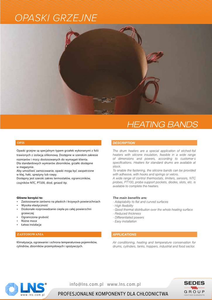 OPASKI GRZEJNE Opaski grzejne są specjalnym typem grzałek wykonanymi z folii trawionych z izolacją silikonową. Dostępne w szerokim zakresie rozmiarów i mocy dostosowanych do wymagań klienta. Dla standardowych wymiarów zbiorników, grzałki dostępne w magazynie. Aby umożliwić zamocowanie, opaski mogą być zaopatrzone w klej, haki, sprężyny lub rzepy. Dostępny jest szeroki zakres termostatów, ograniczników, czujników NTC, PT100, diod, gniazd itp. Główne korzyści to: ź Zastosowanie zarówno na płaskich i krzywych powierzchniach ź Wysoka elastyczność ź Doskonałe rozprowadzanie ciepła po całej powierzchni grzewczej ź Ograniczona grubość ź Różne moce ź Łatwa instalacja Klimatyzacja, ogrzewanie i ochrona temperaturowa pojemników, cylindrów, zbiorników przemysłowych i spożywczych. [email protected] www.lns.com.pl PROFESJONALNE KOMPONENTY DLA CHŁODNICTWA OPASKI GRZEJNE LNS Sp. z o.o. ul. Żernicka 9, 55-010, Święta Katarzyna tel: +48 71 716 44 50 fax: +48 71 716 44 51 e-mail: [email protected] KRS 0000476413; NIP 8961535367; REGON 022250607