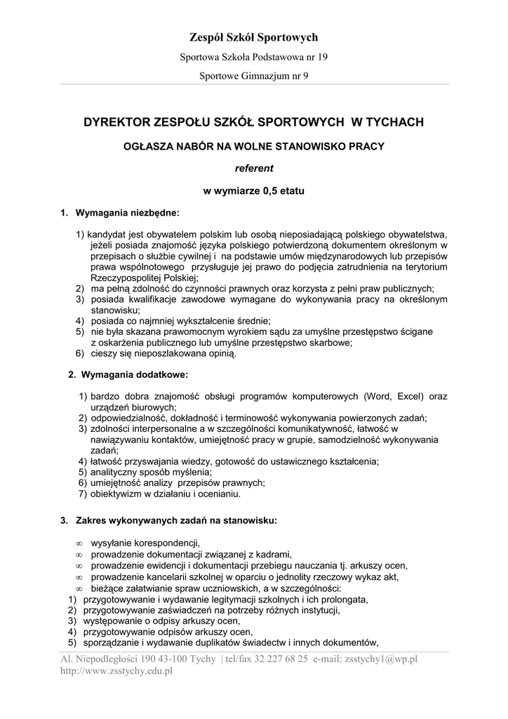 Zespół Szkół Sportowych Sportowa Szkoła Podstawowa nr 19 Sportowe Gimnazjum nr 9 DYREKTOR ZESPOŁU SZKÓŁ SPORTOWYCH W TYCHACH OGŁASZA NABÓR NA WOLNE STANOWISKO PRACY referent w wymiarze 0,5 etatu 1. Wymagania niezbędne: 1) kandydat jest obywatelem polskim lub osobą nieposiadającą polskiego obywatelstwa, jeżeli posiada znajomość języka polskiego potwierdzoną dokumentem określonym w przepisach o służbie cywilnej i na podstawie umów międzynarodowych lub przepisów prawa wspólnotowego przysługuje jej prawo do podjęcia zatrudnienia na terytorium Rzeczypospolitej Polskiej; 2) ma pełną zdolność do czynności prawnych oraz korzysta z pełni praw publicznych; 3) posiada kwalifikacje zawodowe wymagane do wykonywania pracy na określonym stanowisku; 4) posiada co najmniej wykształcenie średnie; 5) nie była skazana prawomocnym wyrokiem sądu za umyślne przestępstwo ścigane z oskarżenia publicznego lub umyślne przestępstwo skarbowe; 6) cieszy się nieposzlakowana opinią. 2. Wymagania dodatkowe: 1) bardzo dobra znajomość obsługi programów komputerowych (Word, Excel) oraz urządzeń biurowych; 2) odpowiedzialność, dokładność i terminowość wykonywania powierzonych zadań; 3) zdolności interpersonalne a w szczególności komunikatywność, łatwość w nawiązywaniu kontaktów, umiejętność pracy w grupie, samodzielność wykonywania zadań; 4) łatwość przyswajania wiedzy, gotowość do ustawicznego kształcenia; 5) analityczny sposób myślenia; 6) umiejętność analizy przepisów prawnych; 7) obiektywizm w działaniu i ocenianiu. 3. Zakres wykonywanych zadań na stanowisku: • • • • • 1) 2) 3) 4) 5) wysyłanie korespondencji, prowadzenie dokumentacji związanej z kadrami, prowadzenie ewidencji i dokumentacji przebiegu nauczania tj. arkuszy ocen, prowadzenie kancelarii szkolnej w oparciu o jednolity rzeczowy wykaz akt, bieżące załatwianie spraw uczniowskich, a w szczególności: przygotowywanie i wydawanie legitymacji szkolnych i ich prolongata, przygotowywanie zaświadczeń na potrzeby różnych instytucji, występowanie o odpisy arkuszy ocen, przygotowywanie odpisów arkuszy ocen, sporządzanie i wydawanie duplikatów świadectw i innych dokumentów, Al. Niepodległości 190 43-100 Tychy | tel/fax 32 227 68 25 e-mail: [email protected] http://www.zsstychy.edu.pl Zespół Szkół Sportowych Sportowa Szkoła Podstawowa nr 19 Sportowe Gimnazjum nr 9 6) 7) 8) • • • • • przyjmowanie i przechowywanie dokumentacji kandydatów do szkół, prowadzenie ewidencji i dokumentacji świadectw ukończenia szkoły, zbieranie dokumentacji dotyczącej wszelkich form pomocy materialnej uczniom; obsługa gości i interesantów dyrektora, obsługa programu SIO, PFRON, obsługa aplikacji wspomagających zarządzanie w oświacie (OSON, NABO), prowadzenie książki wejść i wyjść, rozsyłanie pism przychodzących zgodnie z zasadami obiegu dokumentów w szkole, prowadzenie dokumentacji związanej z badaniami lekarskimi pracowników szkoły. 4. Informacja o warunkach zatrudnienia: 1) miejsce wykonywania pracy znajduje się na półpiętrze, brak możliwości wjazdu windą, 2) budynek nie posiada toalet dostosowanych do osób niepełnosprawnych, 3) stanowisko pracy wyposażone jest w biurko z kontenerem o wymiarach standartowych z komputerem, 4) pokój nauczycielski, sekretariat gimnazjum i archiwum znajdują się na pierwszym piętrze, brak możliwości wjazdu windą. 5. Wymagane dokumenty: 1) list motywacyjny; 2) CV z dokładnym opisem przebiegu pracy zawodowej; 3) kwestionariusz osobowy dla osoby ubiegającej się o zatrudnienie, wg wzoru stanowiącego załącznik nr 2 do Regulaminu Naboru; 4) kserokopie świadectw pracy lub/i innych dokumentów potwierdzających wymagany staż pracy; 5) kserokopie dokumentów potwierdzające wykształcenie i kwalifikacje zawodowe; 6) inne dokumenty o posiadanych kwalifikacjach i umiejętnościach; 7) oświadczenie o stanie zdrowia niezbędnym do pracy na danym stanowisku; 8) wobec kandydatów którzy nie są obywatelami polskimi, ale są obywatelami Unii Europejskiej lub obywatelami innych państw, którym na podstawie umów międzynarodowych lub przepisów prawa wspólnotowego przysługuje prawo do podjęcia zatrudnienia na terytorium Rzeczpospolitej Polskiej, dokument poświadczający znajomość języka polskiego, określony w przepisach o służbie cywilnej; 9) oświadczenie o posiadaniu pełnej zdolności do czynności prawnych i korzystaniu z pełni praw publicznych oraz że nie toczy się wobec kandydata postępowanie karne, wg wzoru stanowiącego załącznik nr 3 do Regulaminu Naboru; 10) oświadczenie potwierdzające, że kandydat nie był skazany prawomocnym wyrokiem sądu za umyślne przestępstwo ścigane z oskarżenia publicznego lub umyślne przestępstwo skarbowe, wg wzoru stanowiącego załącznik nr 3 do Regulaminu Naboru; 11) oświadczenie o wyrażeniu zgody na przetwarzanie danych osobowych zawartych w dokumentach składanych w związku z naborem, dla potrzeb niezbędnych dla realizacji procesu rekrutacji zgodnie z ustawą z dnia 29 sierpnia 1997 roku o ochronie danych osobowych (D. U. z 2002 r. Nr 101, poz. 926 z późn. zm.) wg wzoru stanowiącego załącznik nr 3 do Regulaminu Naboru; 12) oświadczenie o wyrażeniu zgody na umieszczenie imienia, nazwiska i miejsca zamieszkania w rozumieniu przepisów Kodeksu cywilnego (miejscowości) na Al. Niepodległości 190 43-100 Tychy | tel/fax 32 227 68 25 e-mail: [email protected] http://www.zsstychy.edu.pl Zespół Szkół Sportowych Sportowa Szkoła Podstawowa nr 19 Sportowe Gimnazjum nr 9 liście o której mowa § 7 ust. 2 wg wzoru stanowiącego załącznik nr 3 do Regulaminu Naboru; 13) kserokopie posiadanych referencji i opinii; 14) kserokopię dokumentu potwierdzającego niepełnosprawność w przypadku kandydata, który zamierza skorzystać z uprawnienia, o którym mowa § 10 ust. 2 Dokumenty aplikacyjne: list motywacyjny, CV powinny być o