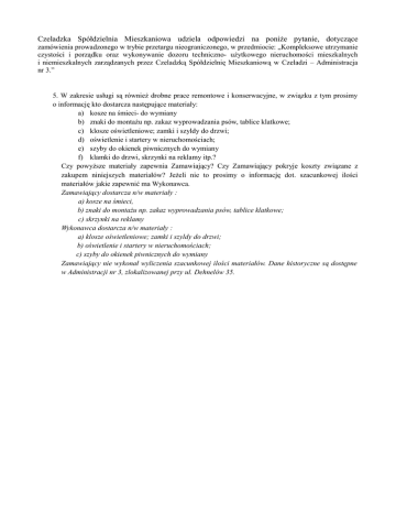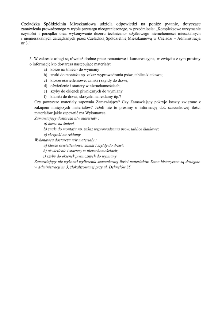 Czeladzka Spółdzielnia Mieszkaniowa udziela odpowiedzi na poniże pytanie, dotyczące zamówienia prowadzonego w trybie przetargu nieograniczonego, w przedmiocie: „Kompleksowe utrzymanie czystości i porządku oraz wykonywanie dozoru techniczno- użytkowego nieruchomości mieszkalnych i niemieszkalnych zarządzanych przez Czeladzką Spółdzielnię Mieszkaniową w Czeladzi – Administracja nr 3.” 5. W zakresie usługi są również drobne prace remontowe i konserwacyjne, w związku z tym prosimy o informację kto dostarcza następujące materiały: a) kosze na śmieci- do wymiany b) znaki do montażu np. zakaz wyprowadzania psów, tablice klatkowe; c) klosze oświetleniowe; zamki i szyldy do drzwi; d) oświetlenie i startery w nieruchomościach; e) szyby do okienek piwnicznych do wymiany f) klamki do drzwi, skrzynki na reklamy itp.? Czy powyższe materiały zapewnia Zamawiający? Czy Zamawiający pokryje koszty związane z zakupem niniejszych materiałów? Jeżeli nie to prosimy o informację dot. szacunkowej ilości materiałów jakie zapewnić ma Wykonawca. Zamawiający dostarcza n/w materiały : a) kosze na śmieci, b) znaki do montażu np. zakaz wyprowadzania psów, tablice klatkowe; c) skrzynki na reklamy Wykonawca dostarcza n/w materiały : a) klosze oświetleniowe; zamki i szyldy do drzwi; b) oświetlenie i startery w nieruchomościach; c) szyby do okienek piwnicznych do wymiany Zamawiający nie wykonał wyliczenia szacunkowej ilości materiałów. Dane historyczne są dostępne w Administracji nr 3, zlokalizowanej przy ul. Dehnelów 35.