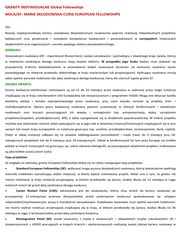 GRANTY INDYWIDUALNE Global Fellowships MSCA/EF: MARIE SKŁODOWSKA-CURIE EUROPEAN FELLOWSHIPS CEL Rozwój międzynarodowej kariery zawodowej doświadczonych naukowców poprzez realizację indywidualnych projektów badawczych oraz poszerzanie i rozwijanie kompetencji badawczych i pozanaukowych w europejskich instytucjach akademickich oraz organizacjach z szeroko pojętego sektora pozaakademickiego. ADRESACI Doświadczeni naukowcy (ER – Experienced Researchers), każdej narodowości i pochodzący z dowolnego kraju świata, którzy w momencie zamknięcia danego konkursu mają stopień doktora. W przypadku jego braku badacz musi wykazać się przynajmniej 4-letnim doświadczeniem w prowadzeniu badań naukowych (liczonym od momentu uzyskania tytułu pozwalającego na otwarcie przewodu doktorskiego w kraju macierzystym lub przyjmującym). Aplikujący naukowcy muszą także spełnić warunek mobilności (do daty zamknięcia danego konkursu), różny dla czterech typów grantu EF. ZASADY GRANTU Granty badawczo-szkoleniowe realizowane są od 12 do 24 miesięcy przez naukowca w wybranej przez niego instytucji znajdującej się w kraju członkowskim Unii Europejskiej lub stowarzyszonym z programem H2020. Mogą one dotyczyć każdej dziedziny wiedzy i tematu zaproponowanego przez naukowca, przy czym wysoko cenione są projekty inter- i multidyscyplinarne. Oprócz pracy badawczej naukowcy powinni uczestniczyć w różnych konferencjach i szkoleniach naukowych oraz kursach poszerzających ich wiedzę i umiejętności (np. autoprezentacja, etyka, zarządzanie projektem/zespołem, przedsiębiorczość, IPR), a także zaangażować się w działalność popularyzatorską. W trakcie projektu możliwe jest wykonanie różnych zadań wpisujących się w jego cele w dowolnej instytucji/instytucjach znajdujących się w tym samym lub innym kraju europejskim co instytucja goszcząca (np. uczelnia, przedsiębiorstwo, stowarzyszenie, bank, szpital). Pobyt w takiej instytucji odbywa się na zasadzie oddelegowania (secondment) i może trwać do 3 miesięcy przy 18miesięcznych projektach lub do 6 miesięcy przy 24-miesięcznych. Udział w konferencjach (w tym poza Europą) czy krótkie pobyty w innych instytucjach niż goszcząca, np. celem zebrania bibliografii, są zwyczajowym działaniem projektu i traktowane są jako krótkie wizyty (short visits). Typy projektów: Ze względu na adresata, granty European Fellowships dzielą się na cztery następujące typy projektów: Standard European Fellowships (SF): aplikować mogą wszyscy doświadczeni naukowcy, którzy jednocześnie spełniają warunek mobilności warunkujący wybór instytucji, w której będzie realizowany projekt. Mówi ona o tym, że grantu nie można realizować w kraju instytucji przyjmującej, w którym przebywało się (praca, studia) dłużej niż 12 miesięcy w ciągu ostatnich trzech lat przed datą zamknięcia danego konkursu. Career Restart Panel (CAR): adresowany jest do naukowców, którzy chcą wrócić do kariery naukowej po przynajmniej 12-miesięcznej przerwie (bezpośrednio przed zamknięciem konkursu) spowodowanej np. urlopem rodzicielskim/wychowawczym, pracą o charakterze nienaukowym. Dodatkowo naukowiec musi spełnić warunek mobilności: nie można wybrać instytucji przyjmującej znajdującej się w kraju, w którym przebywało się (praca, studia) dłużej niż 36 miesięcy w ciągu 5 lat bezpośrednio przed datą zamknięcia konkursu. Reintegration Panel (RI): został utworzony z myślą o naukowcach – obywatelach krajów członkowskich UE i stowarzyszonych z H2020 pracujących w krajach trzecich i zainteresowanych realizacją swojej dalszej kariery naukowej w Europie. W celu realizacji grantu naukowiec musi przyjechać bezpośrednio z kraju trzeciego do kraju UE lub stowarzyszonego z H2020, spełniając jednocześnie warunek mobilności: nie można wybrać instytucji przyjmującej znajdującej się w kraju, w którym przebywało się (praca, studia) dłużej niż 36 miesięcy w ciągu 5 lat bezpośrednio przed datą zamknięcia konkursu. Naukowcy, którzy przed zamknięciem konkursu w takiej instytucji już pracują mogą także ubiegać się o grant pod warunkiem zgodności z powyższą zasadą. Grant jest także adresowany do naukowców nie mających obywatelstwa wyżej wspomnianych krajów europejskich, którzy prowadzili co najmniej 5-letnie badania (bez przerw) w Europie. Society and Enterprise Panel (SE): ten multidyscyplinarny został utworzony w celu wspierania międzysektorowej mobilności doświadczonych naukowców oraz stworzenia możliwości kontynuowania kariery naukowej poza sektorem akademickim. Naukowiec każdej narodowości aplikuje o grant z jednostką pochodząca z sektora nieakademickiego. Warunek mobilności w tym panelu: nie można składać wniosku z instytucją z kraju, w którym się przebywało dłużej niż 36 miesięcy w ciągu 5 lat bezpośrednio przed datą zamknięcia konkursu. ZASADY FINANSOWANIA Naukowiec powinien zostać zatrudniony przez instytucję przyjmującą na czasową umowę o pracę. Budżet liczony jest automatycznie na podstawie planowanej liczby osobomiesięcy grantu (od 12 do 24 miesięcy) i składa się z: - Kosztów osobowych: Living allowance – wynagrodzenie o bazowej kwocie 4 650 euro/osobomiesiąc. Kwota ta podlega tzw. współczynnikowi korekcyjnemu (dane w Programach pracy dla MSCA), właściwemu dla kraju, w którym naukowiec realizuje grant i jest kwotą, od której odprowadzane są składki (pracownika i pracodawcy) na ubezpieczenia oraz podatki zgodnie z obowiązującym prawem w kraju przyjmującym; Mobility allowance - dodatek relokacyjny w wysokości 600 euro/osobomiesiąc (może podlegać opodatkowaniu); Family allowance – dodatek dla naukowców posiadających rodzinę w kwocie 500 euro/osobomiesiąc (może podlegać opodatkowaniu). - Kosztów instytucji: koszty badań i szkoleń w wysokości 800 euro/osobomiesiąc; koszty zarządzania i koszty pośrednie 