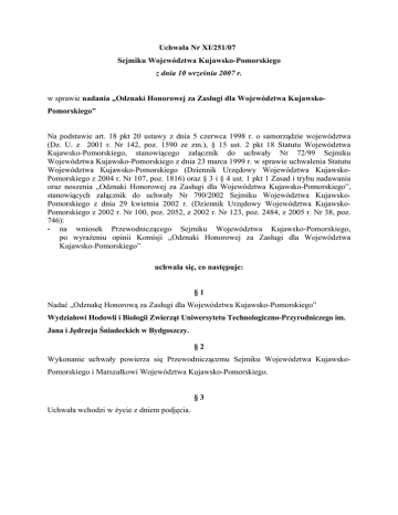 Uchwała Nr XI/251/07XXXIX/532/05 Sejmiku Województwa Kujawsko-Pomorskiego z dnia 10 września 2007 r. w sprawie nadania „Odznaki Honorowej za Zasługi dla Województwa KujawskoPomorskiego” Na podstawie art. 18 pkt 20 ustawy z dnia 5 czerwca 1998 r. o samorządzie województwa (Dz. U. z 2001 r. Nr 142, poz. 1590 ze zm.), § 15 ust. 2 pkt 18 Statutu Województwa Kujawsko-Pomorskiego, stanowiącego załącznik do uchwały Nr 72/99 Sejmiku Województwa Kujawsko-Pomorskiego z dnia 23 marca 1999 r. w sprawie uchwalenia Statutu Województwa Kujawsko-Pomorskiego (Dziennik Urzędowy Województwa KujawskoPomorskiego z 2004 r. Nr 107, poz. 1816) oraz § 3 i § 4 ust. 1 pkt 1 Zasad i trybu nadawania oraz noszenia „Odznaki Honorowej za Zasługi dla Województwa Kujawsko-Pomorskiego”, stanowiących załącznik do uchwały Nr 790/2002 Sejmiku Województwa KujawskoPomorskiego z dnia 29 kwietnia 2002 r. (Dziennik Urzędowy Województwa KujawskoPomorskiego z 2002 r. Nr 100, poz. 2052, z 2002 r. Nr 123, poz. 2484, z 2005 r. Nr 38, poz. 746): - na wniosek Przewodniczącego Sejmiku Województwa Kujawsko-Pomorskiego, po wyrażeniu opinii Komisji „Odznaki Honorowej za Zasługi dla Województwa Kujawsko-Pomorskiego” uchwala się, co następuje: §1 Nadać „Odznakę Honorową za Zasługi dla Województwa Kujawsko-Pomorskiego” Wydziałowi Hodowli i Biologii Zwierząt Uniwersytetu Technologiczno-Przyrodniczego im. Jana i Jędrzeja Śniadeckich w Bydgoszczy. §2 Wykonanie uchwały powierza się Przewodniczącemu Sejmiku Województwa KujawskoPomorskiego i Marszałkowi Województwa Kujawsko-Pomorskiego. §3 Uchwała wchodzi w życie z dniem podjęcia. UZASADNIENIE Początki Wydziału związane są z powstaniem Oddziału Zootechnicznego Zamiejscowego Wydziału Rolniczego bydgoskiej filii Wyższej Szkoły Rolniczej w Poznaniu, które miało miejsce w 1972 roku. W pierwszym okresie w skład nowo powstałego Oddziału wchodziły następujące jednostki: Oddział Katedry Zoologii, Oddział Katedry Fizjologii Zwierząt oraz Oddział Katedry Anatomii Zwierząt. Kolejna zmiana struktury organizacyjnej Wydziału nastąpiła w chwili powstania Akademii Techniczno-Rolniczej w 1974 roku. W miejsce Oddziału Zootechnicznego i Instytutu Produkcji Zwierzęcej powołano Instytut Zootechniczny, w którym realizowano zajęcia na studiach stacjonarnych, zaocznych oraz magisterskich uzupełniających. Istotnym wydarzeniem w rozwoju Wydziału było uruchomienie w 1994 roku nowego kierunku kształcenia – Ochrona Środowiska. 1 września 2006 r. Wydział Zootechniczny przekształcił się w Wydział Hodowli i Biologii Zwierząt. Zakres kształcenia studentów na Wydziale jest poszerzany o nowe specjalności. W ramach kierunku Zootechnika realizowane są trzy specjalności: Hodowla Zwierząt i Gospodarka Paszowa, Agroturystyka oraz Hodowla Zwierząt Wolno Żyjących i Gospodarka Łowiecka. Z kolei na kierunku Ochrona Środowiska: Ochrona Środowiska Przyrodniczego i Przemysłowe Technologie w Ochronie Środowiska. Wydział Hodowli i Biologii Zwierząt, od początku swojego istnienia, kształci wykwalifikowaną kadrę, która w oparciu o wiedzę specjalistyczną z zakresu nauk przyrodniczych, uzupełnioną znajomością zagadnień ekonomicznych i organizacyjnych, może kierować przedsiębiorstwami, pracować w doradztwie, a także w szkolnictwie i administracji. Wydział jest znaczącą kuźnią kadr dla regionu, bowiem ok. 80% studentów pochodzi z województwa kujawsko-pomorskiego. Wyniki badań pracowników Wydziału są wdrażane do szerokiej praktyki zarówno rolniczej, jak i związanej z ochroną środowiska. Prace badawcze prowadzone są między innymi w kierunku doskonalenia genetycznego świń w celu poprawy ich cech użytkowych i reprodukcyjnych. Na Wydziale opracowano założenia dla programu TORHYB (toruński hybryd). Jego wdrożenie znacznie przyczyniło się do ugruntowania wysokiej pozycji Regionu Kujawsko-Pomorskiego pod względem produkcji wieprzowiny wysokiej jakości. Prowadzi się także prace nad genetycznym doskonaleniem ras bydła oraz wykorzystaniem metod biotechnologicznych dla poprawy reprodukcji i zwiększania wydajności mięsnej. Program badawczy obejmuje również badania żywieniowe zwierząt, zarówno przeżuwaczy, jak i mięsożernych. Na podkreślenie zasługuje fakt, iż doświadczenia prowadzone są głównie na terenie województwa kujawsko-pomorskiego. Pracownicy Wydziału wykonują także raporty oddziaływania uciążliwych obiektów (oczyszczalnie ścieków, składowiska odpadów) na środowisko. Istotne znaczenie dla biobezpieczeństwa środowiska, mają wieloletnie badania dotyczące zagospodarowania gnojowicy i ścieków z przemysłu rolno-spożywczego. Prowadzi się także badania populacyjne i monitoring zwierząt łownych, a także w zakresie hodowli fermowej zwierząt jeleniowatych. Na Wydziale opracowana została koncepcja rozwoju agroturystyki w regionie kujawsko-pomorskim. Wydział jest organizatorem cyklicznych seminariów między innymi na temat: „Przyszłość wsi – jak wykorzystać jej potencjał”. Współpracuje z Uniwersytetem Hohenheim w Stuttgarcie, Południowo-Czeskim Uniwersytetem w Czeskich Budziejowicach, Instytutem Gospodarstwa Górskiego w Bańskiej Bystrzycy (Słowacja), Uniwersytetem Rolniczym w Nitrze (Słowacja), International Agriculture Collége Larenstein w Deventer (Holandia), Ecole Supérieure d’Agriculture w Angers (Francja), Universita Degli Studi Del Molise w Campobosso (Włochy). Wydział jest również organizatorem międzynarodowej konferencji pt. „Zastosowanie osiągnięć naukowych z zakresu genetyki, rozrodu, żywienia oraz jakości tusz i mięsa w nowoczesnej produkcji świń”, która skupia naukowców z wielu krajów. Wydział Hodowli i Biologii Zwierząt posiada uprawnienia do nadawania stopnia naukowego doktora i doktora habilitowanego nauk rolniczych w dyscyplinie zootechnika oraz pozytywną ocenę jakości kształcenia na